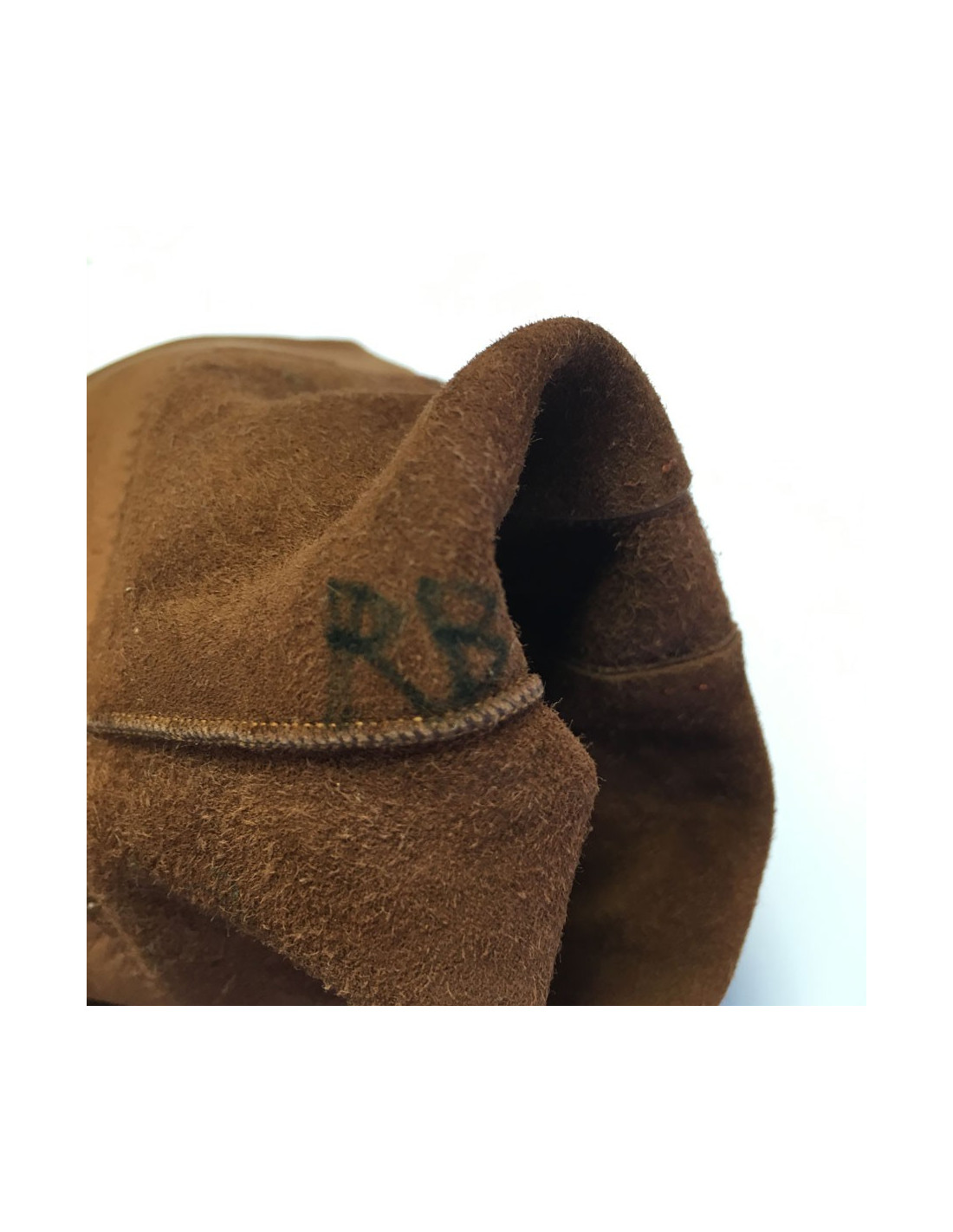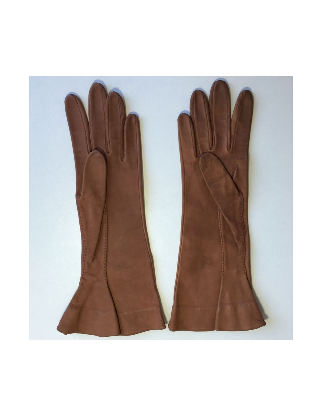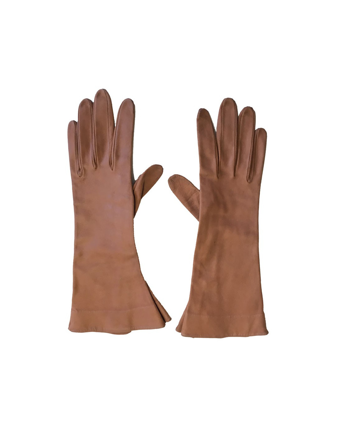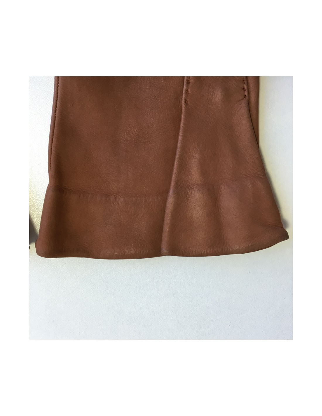 Paire de gants CHRISTIAN DIOR en cuir marron exécuté par "Lionel Le Grand". Pièce vintage. Quelques petites traces sur les deux gants. Les doigts sont un peu patinés. Initiales RB inscrites au stylo à l'intérieur. Monte