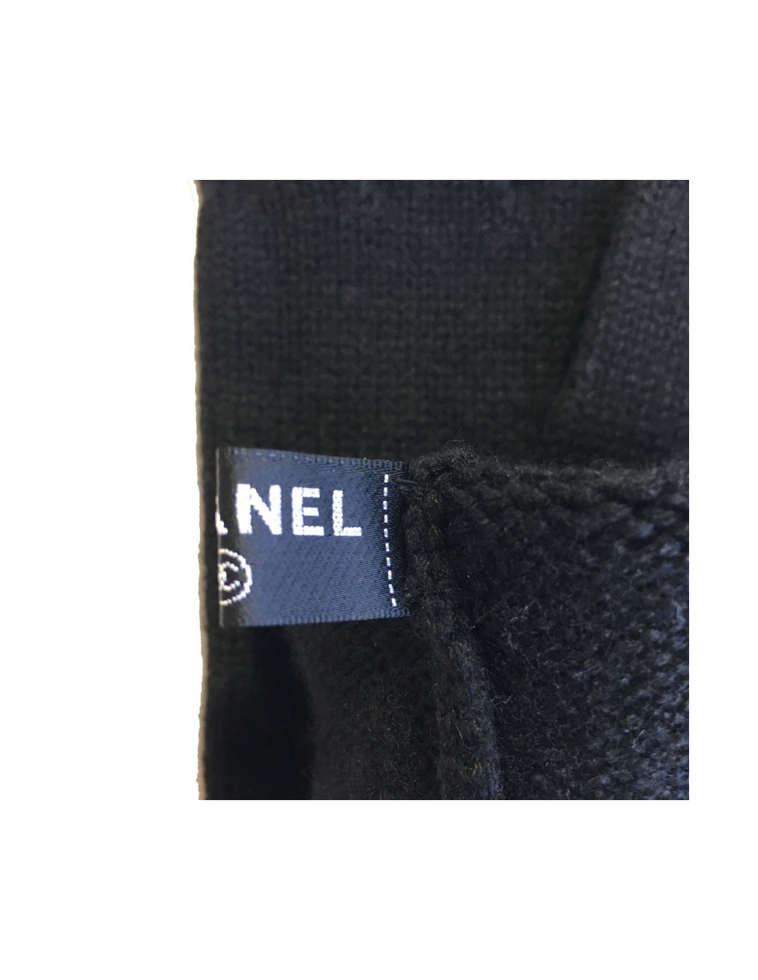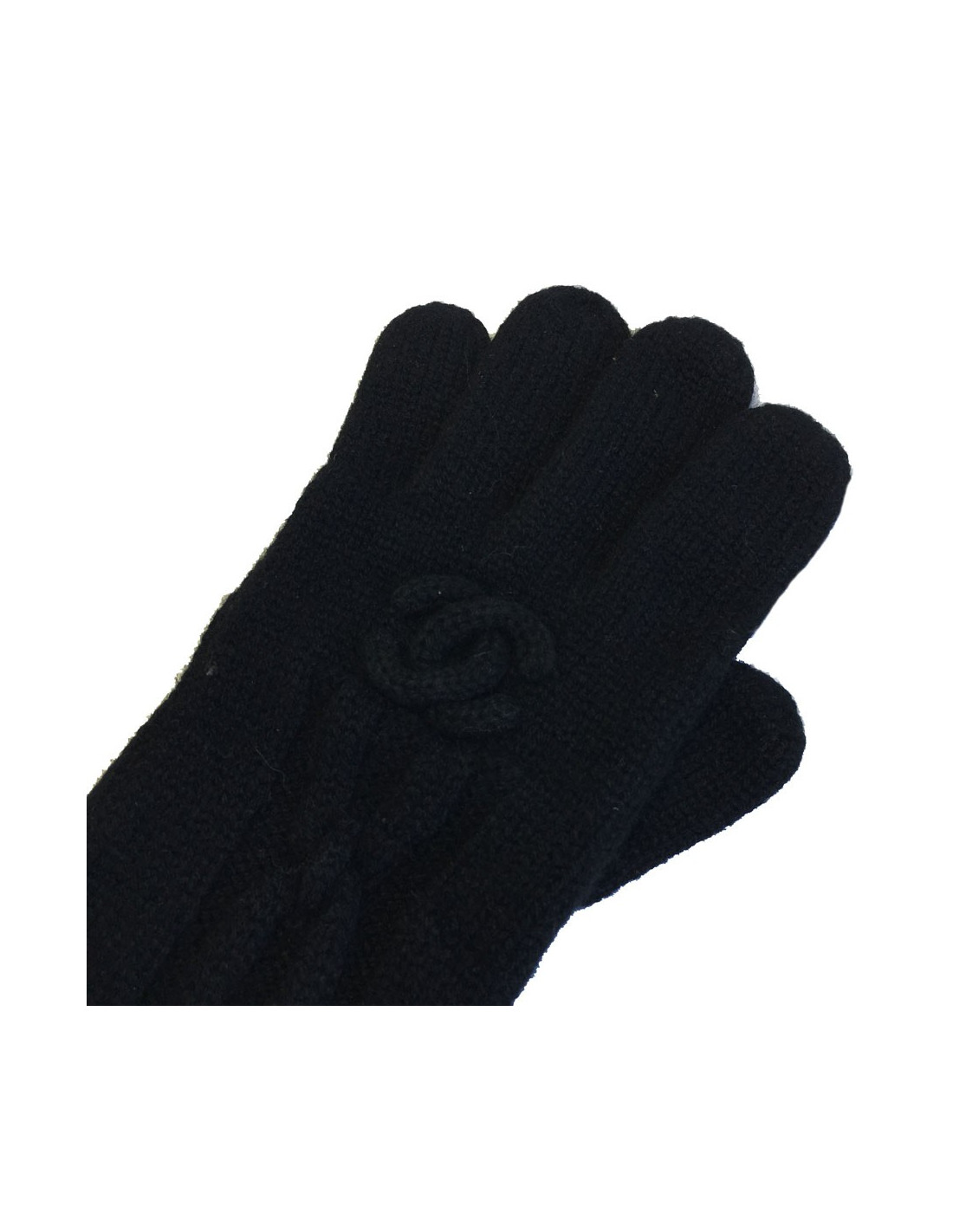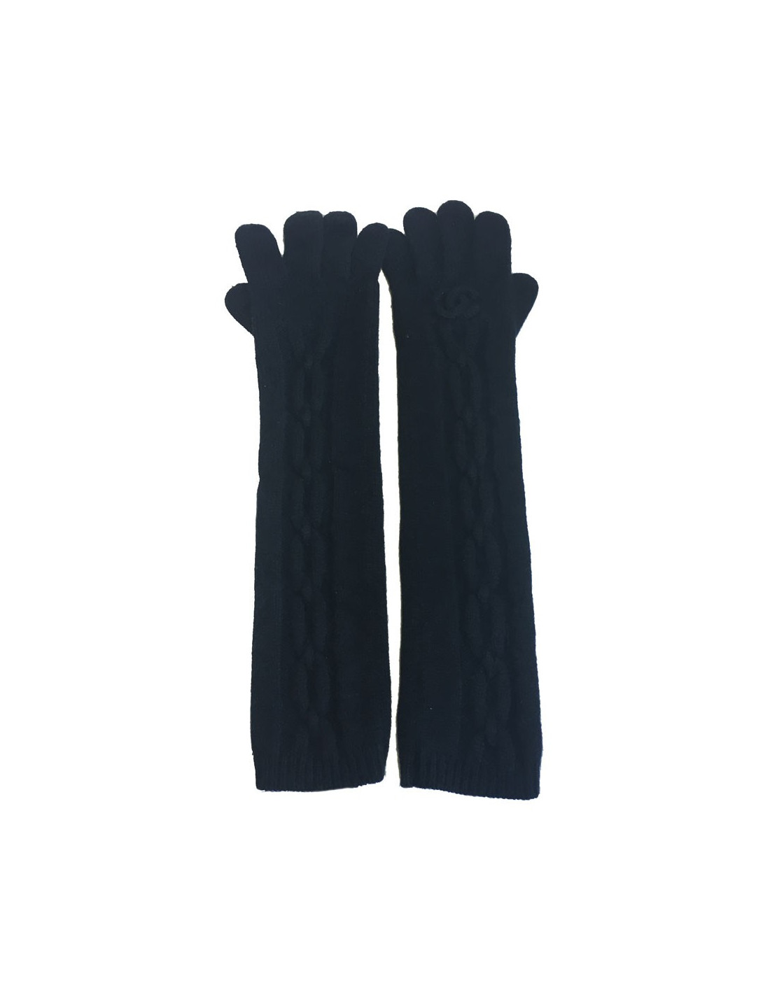 Gants longs Chanel en cachemire noir. Motif : torsades et un double C sur un des gants. Etiquettes de marque et matière présentes à l'intérieur.