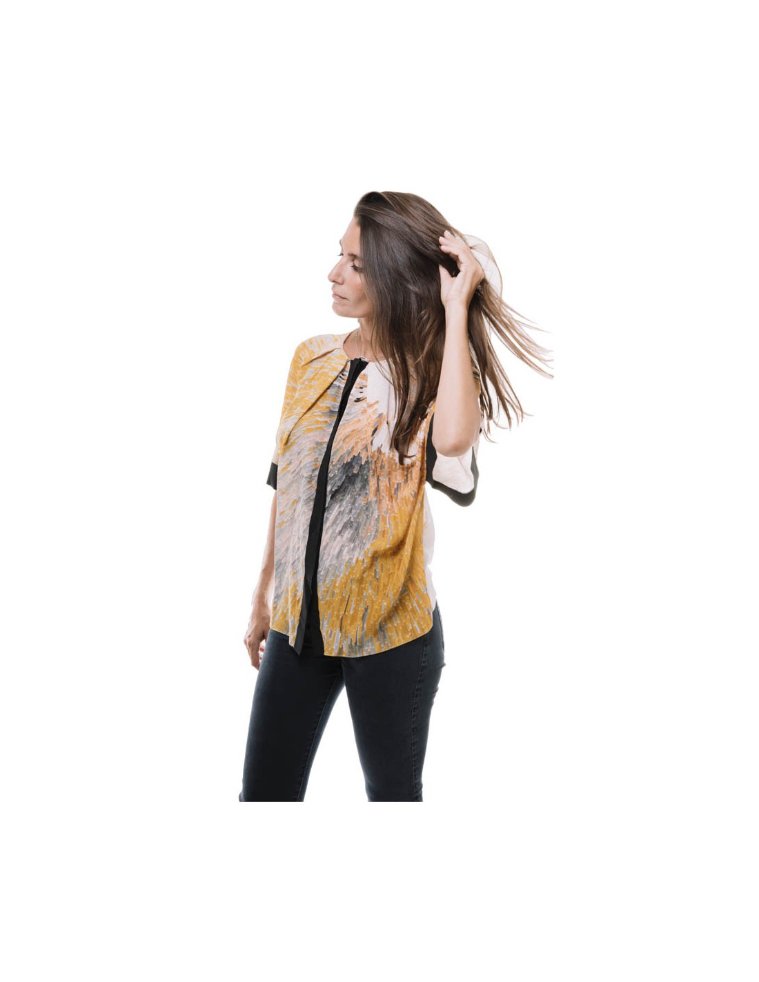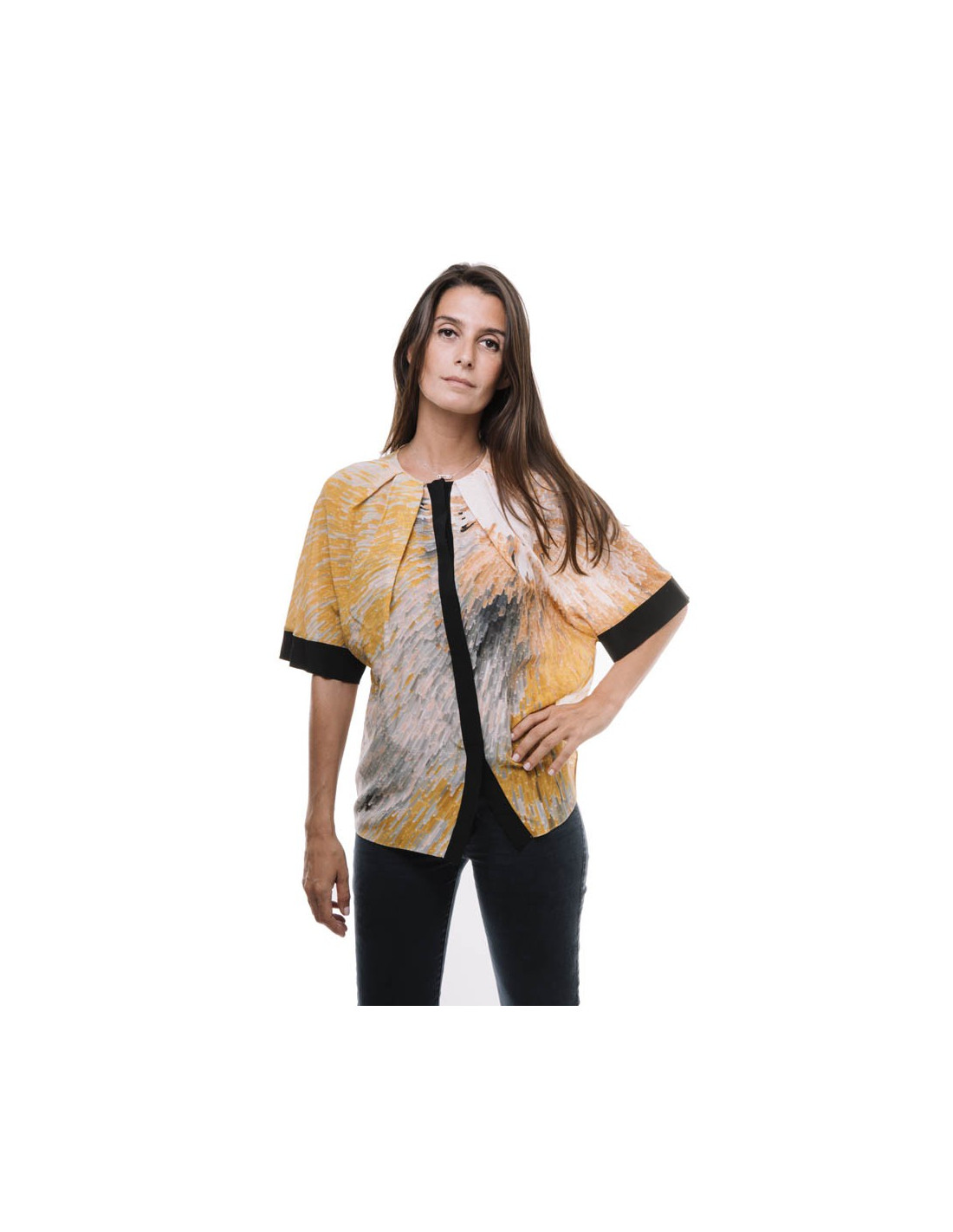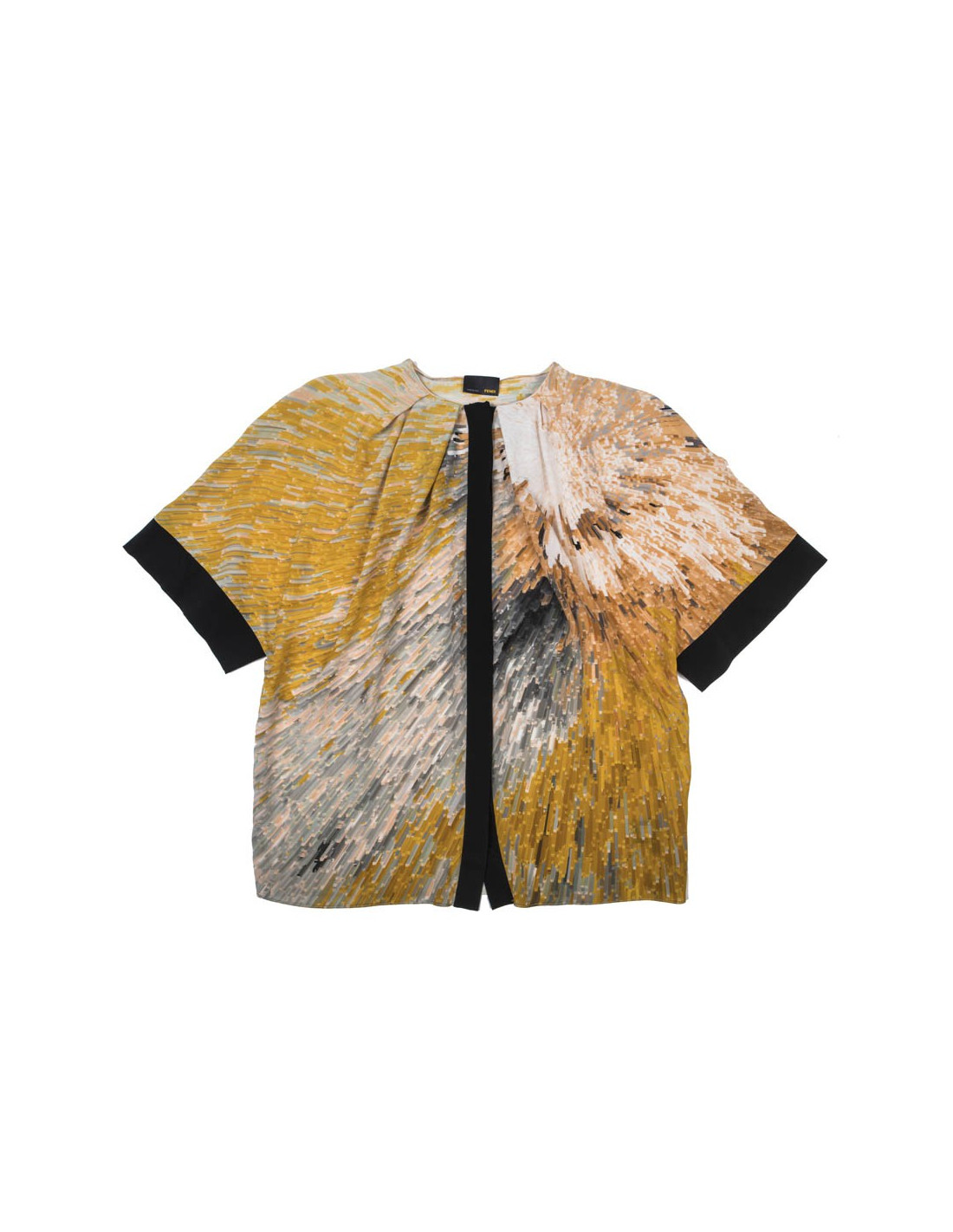 Blouse de la maison Fendi en soie dans les tons jaune, ocre et gris à manches courtes gansées de noir. Elle se ferme sur le devant par des petits boutons noirs gravés Fendi.