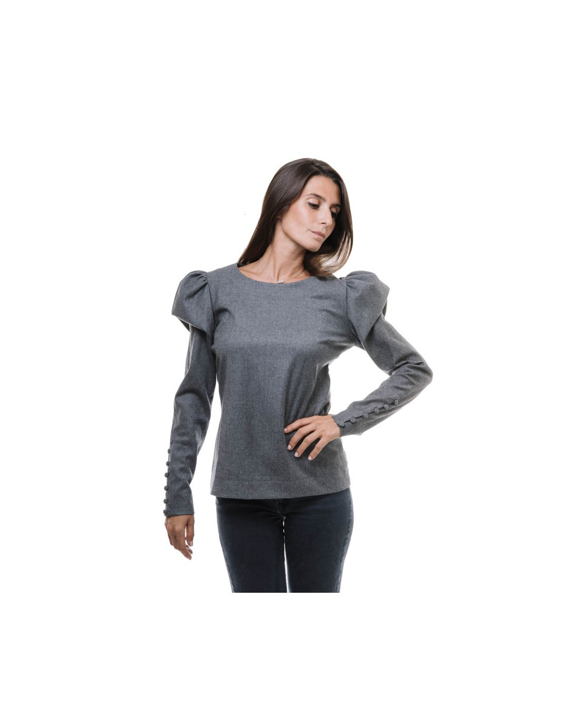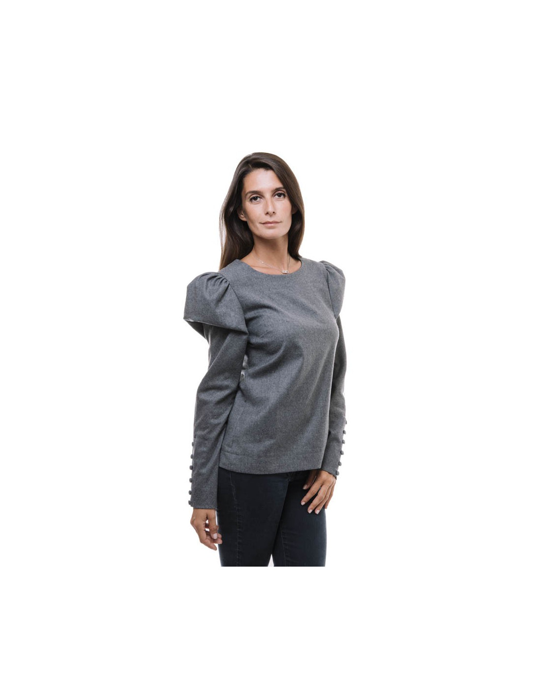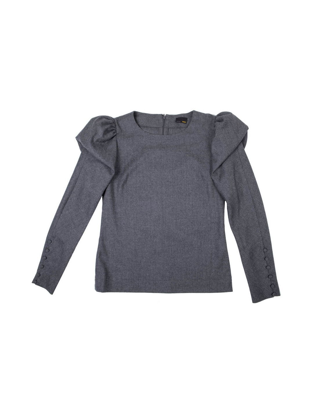 Top de la maison Fendi T 40 It, t 36 EU, en flanelle grise. Manches ballon au niveau des épaules. Elles se ferment au niveau des poignets par de petits boutons de la même matière.