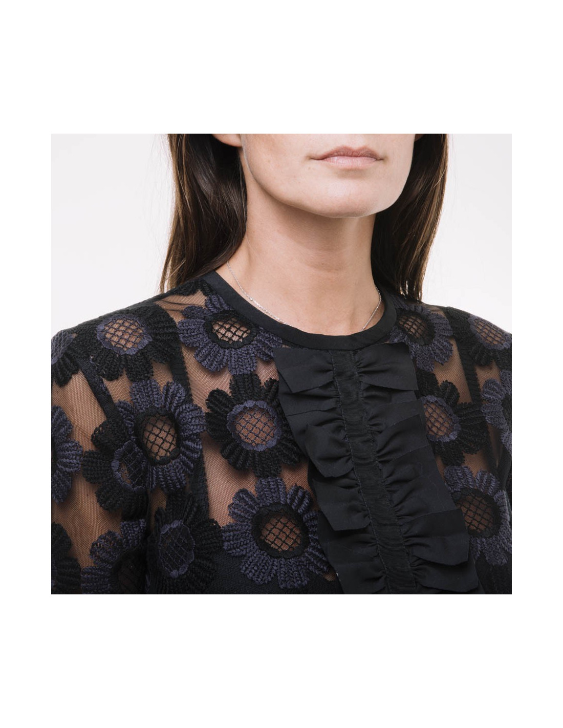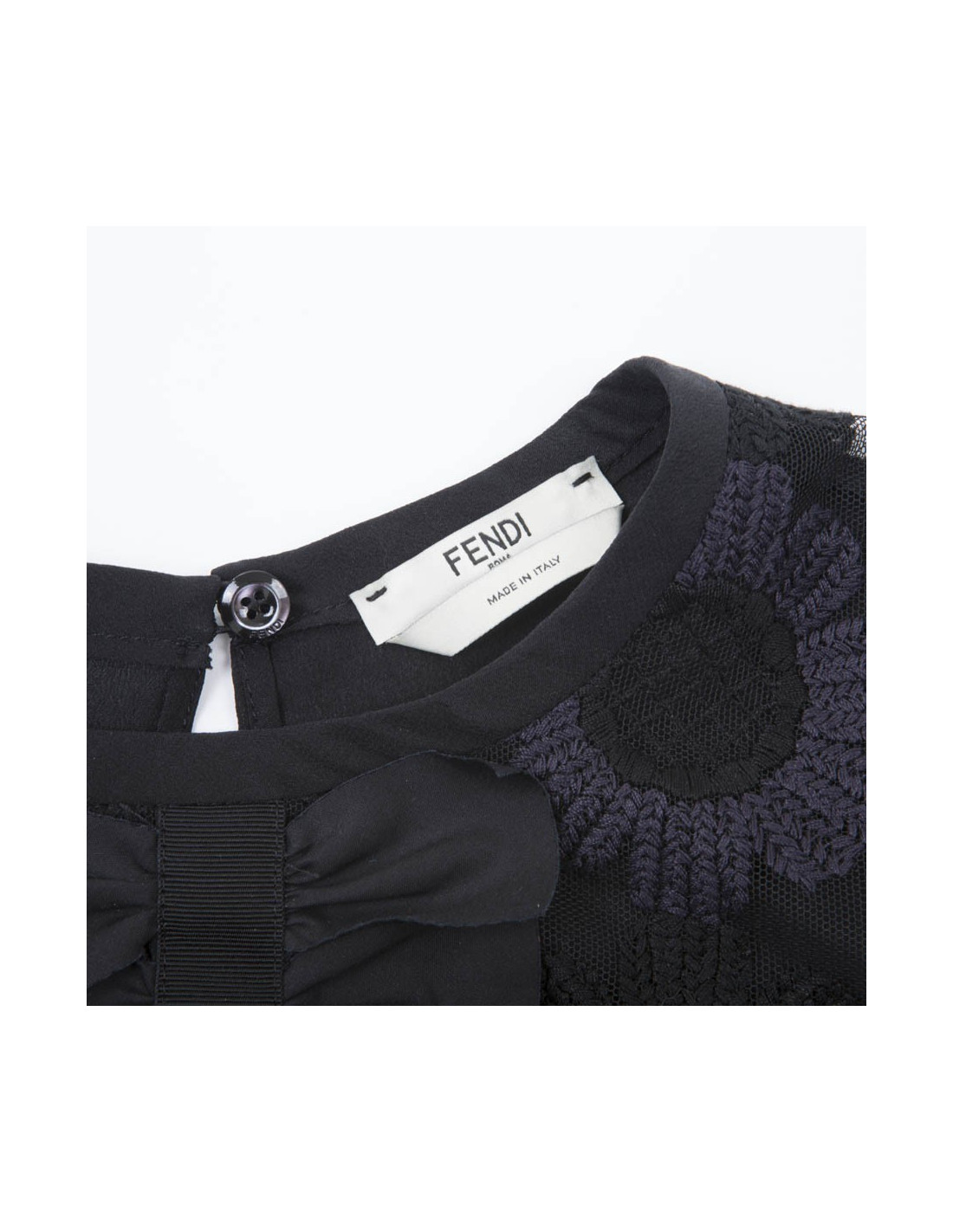 Blouse Maison Fendi en tulle noir rebrodé de fleurs noires et violettes, un long ruban de gros grain au milieu à multi noeuds en coton noir, le dos est en soie noire et se ferme à l'aide d'un petit bouton noir gravé Fendi.