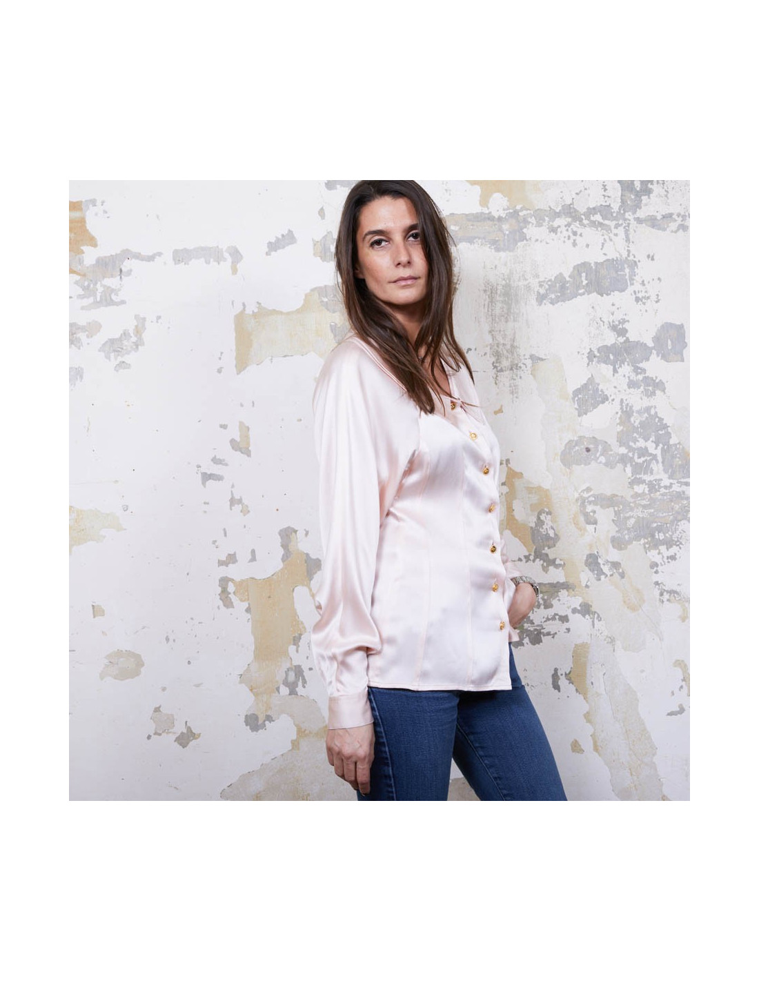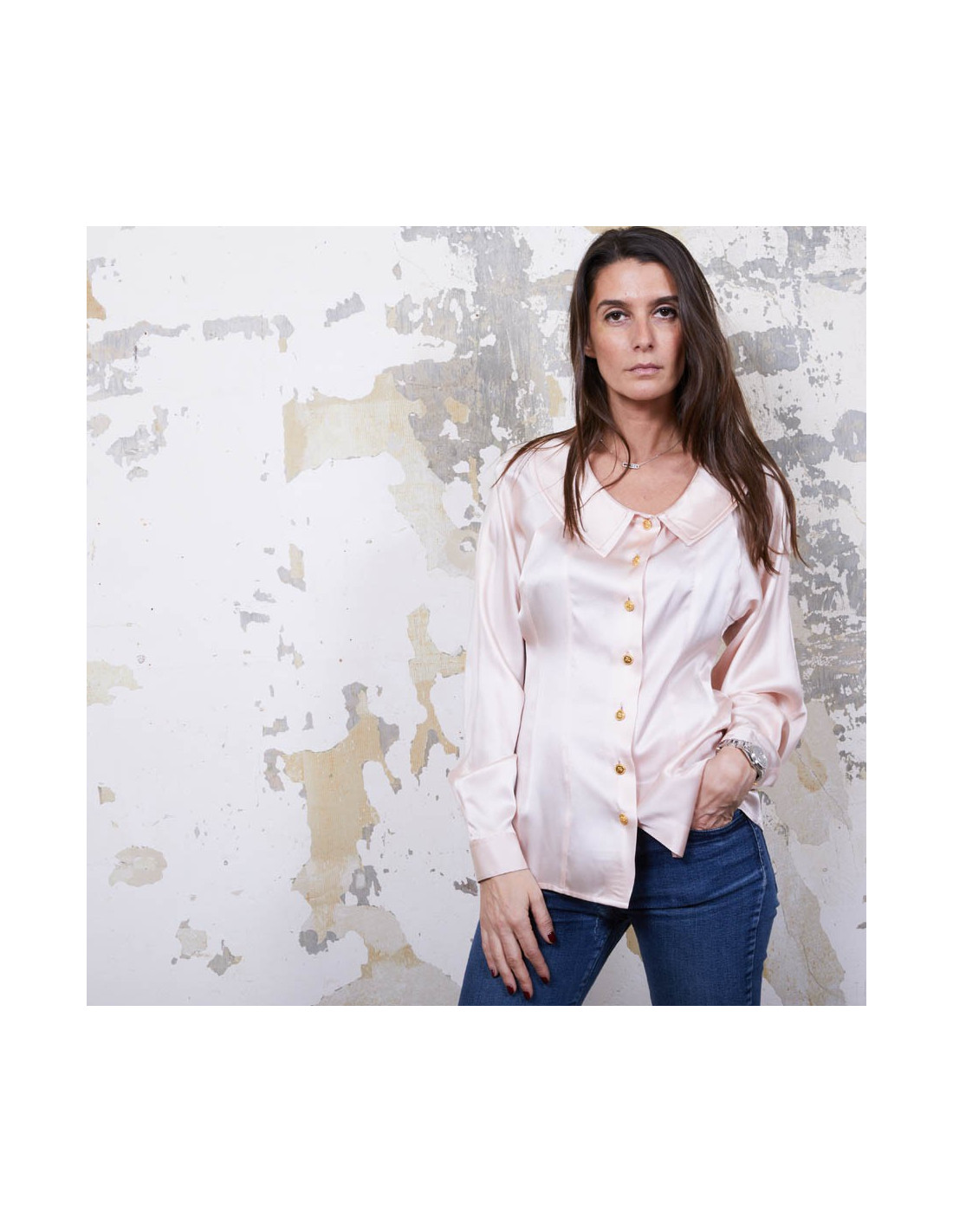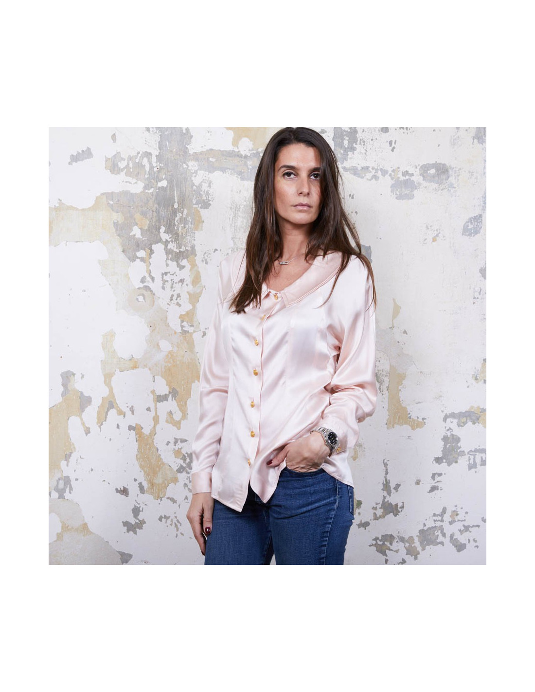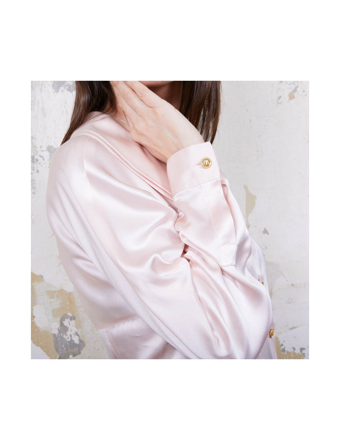 Blouse t 36 (absence d'étiquette de taille et de matière), Chanel en soie 100% rose ornée de boutons dorés.