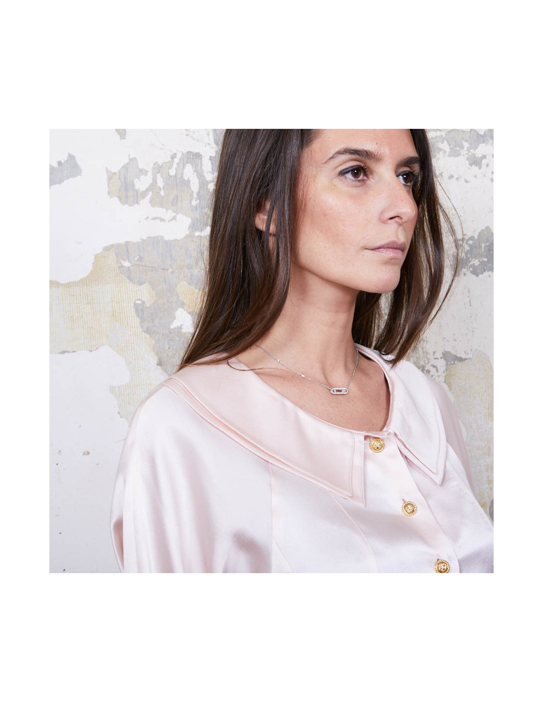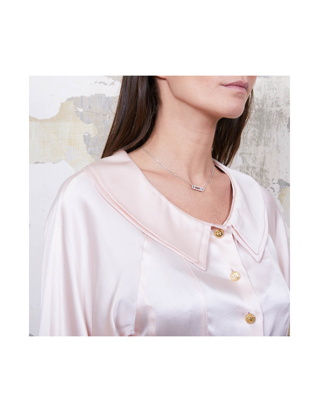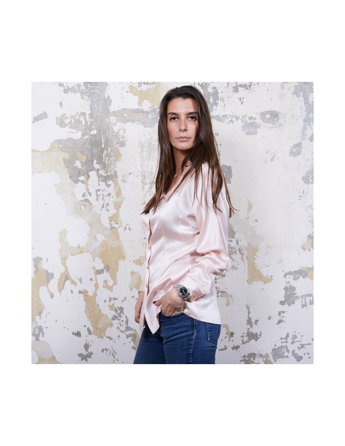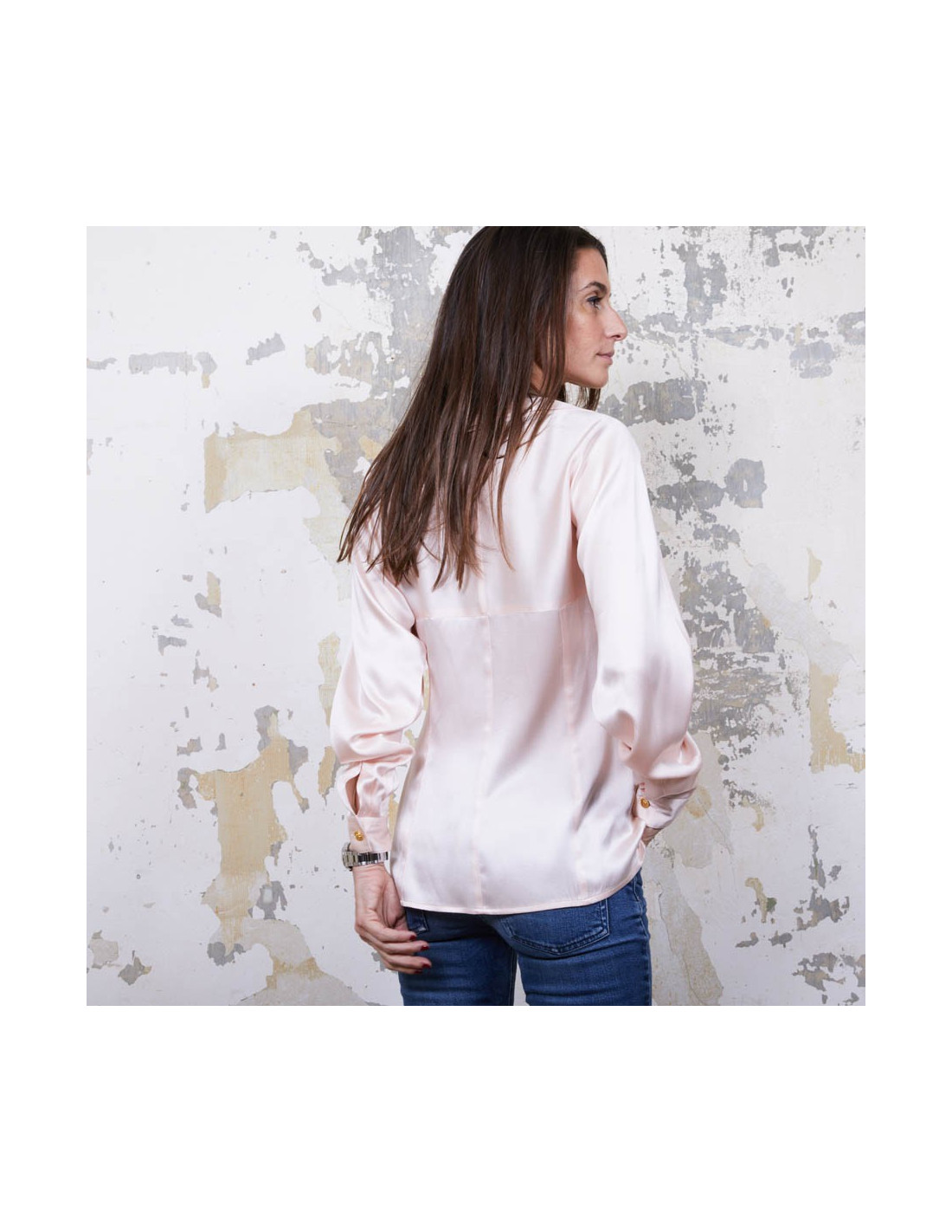 Blouse t 36 (absence d'étiquette de taille et de matière), Chanel en soie 100% rose ornée de boutons dorés.
