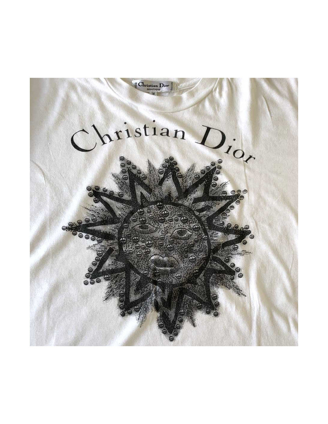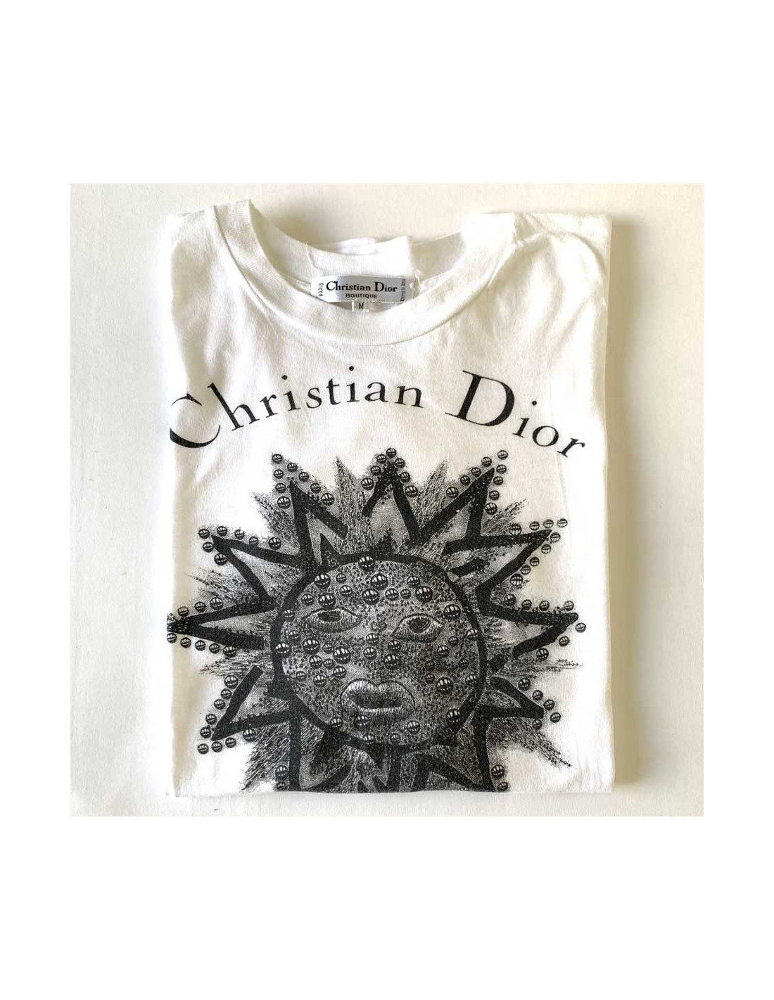 Le T shirt est signé CHRISTIAN DIOR. Il est en coton de couleur blanche avec en son centre un soleil personnifié dans les tons de gris et de noir. Le vêtement comporte la signature CHRISTIAN DIOR Paris.