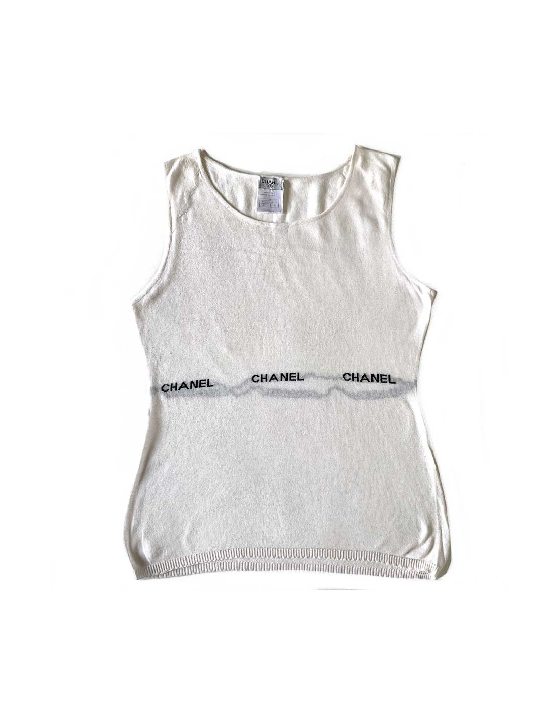 Très beau débardeur CHANEL en coton blanc léger stretch. Inscription CHANEL noire tout autour du débardeur. Belle pièce à porter sous un blazer, simple et élégante. Maille côtelée sur le bas.