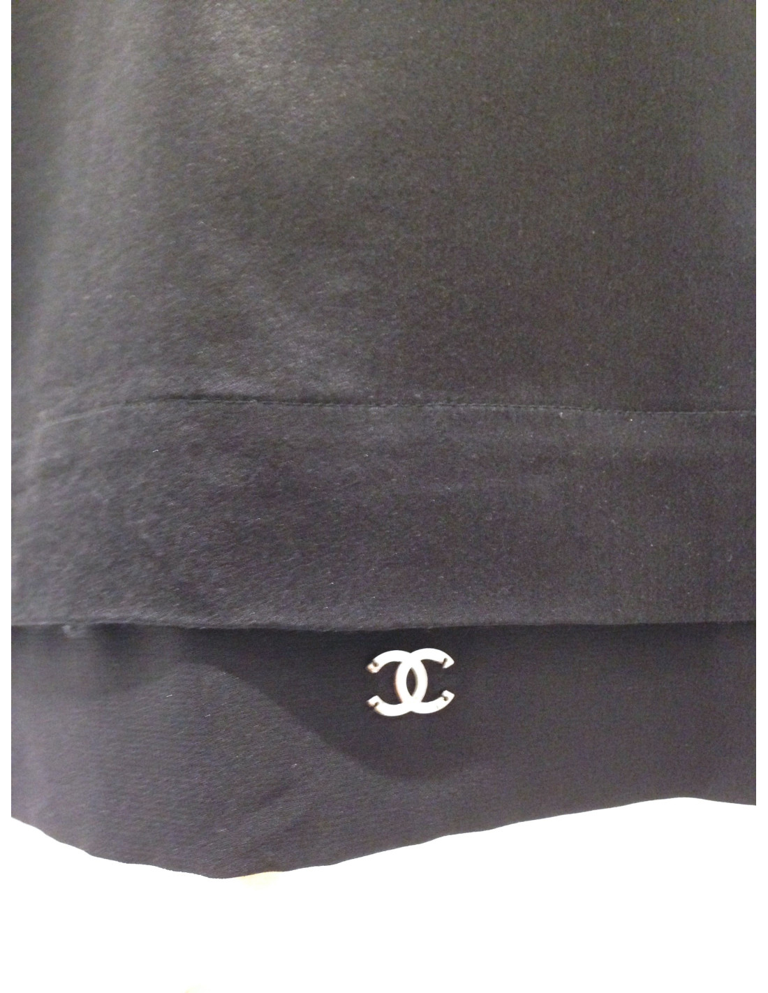 Blouse longue CHANEL en 100% soie noire naturelle, taille 40, de la Collection Printemps-Eté 2008. Top ample en "soie envers satin" avec cordon d'ajustement au niveau des hanches. Un volant de soie mat agrémente le bas du top.