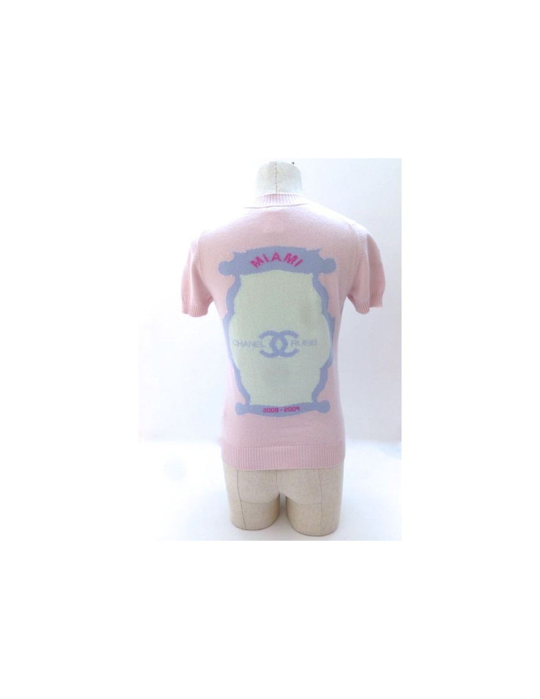 Top CHANEL, taille 36, collection Croisière 2009. Cette pièce féminine, peut se porter de façon très casual. A l'avant, le col est orné de trois superbes boutons or, en forme de coeur, siglés CC, et entourés de strass argent et rose pâle. Le dos est brodé d'un dessin en forme de miroir baroque, de couleur bleu ciel, jaune pastel. Y sont inscrits "MIAMI", "CHANEL CRUISE", "2008-2009".