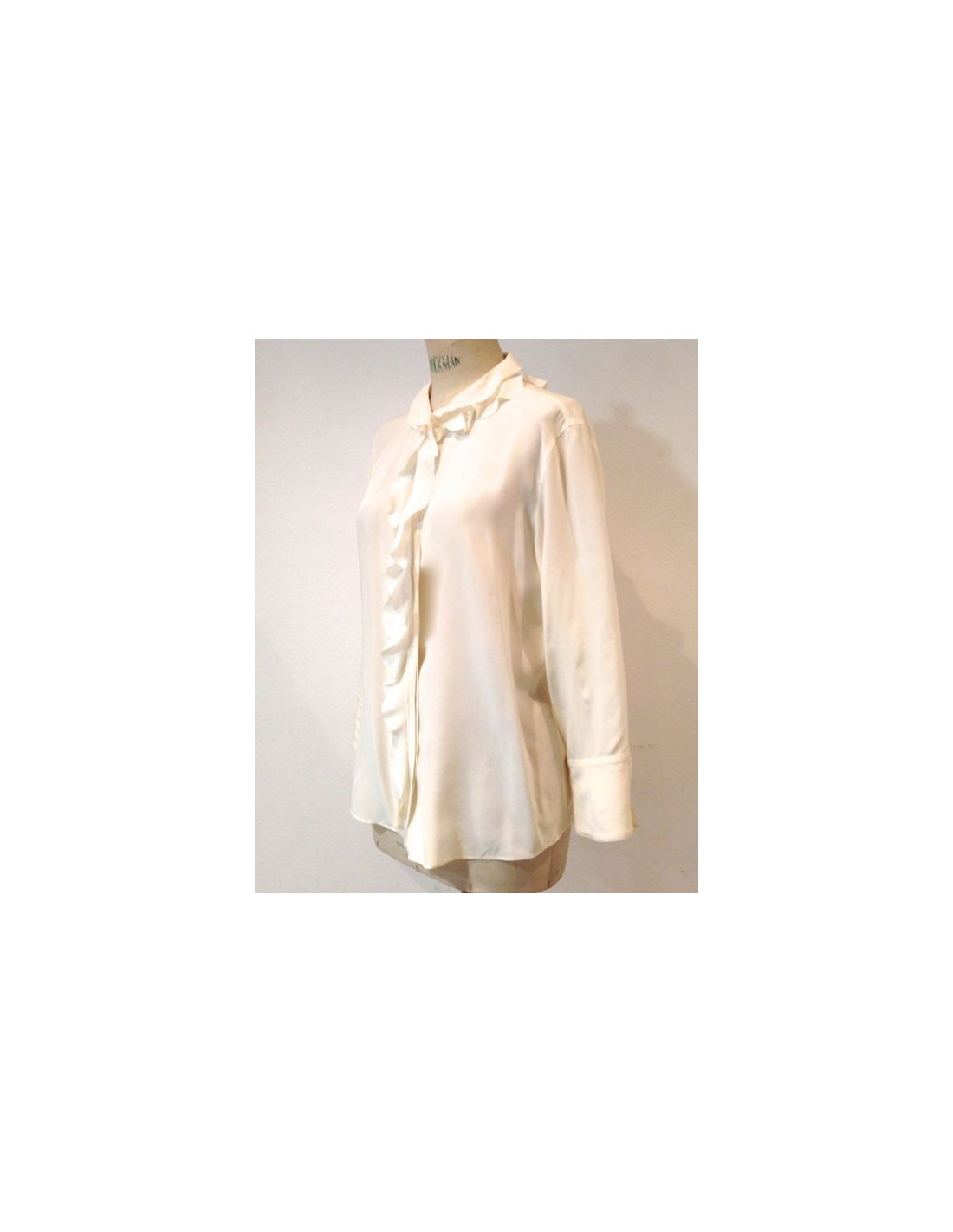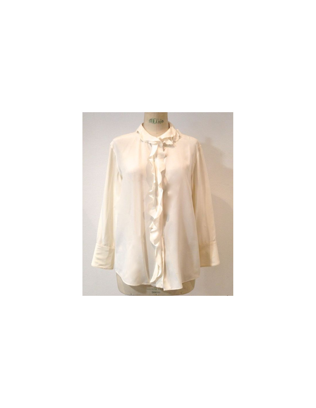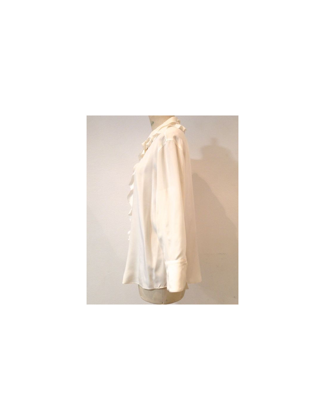 Chemisier CHANEL en soie écru, neuf, taille 44. Chemisier très élégant en 100% soie naturelle, à double-volants sur la boutonnière cachée. Made in Italy. Boutons de nacre blanche siglés CHANEL PARIS. De même, chaque manche a un très joli bouton rond en nacre blanche.