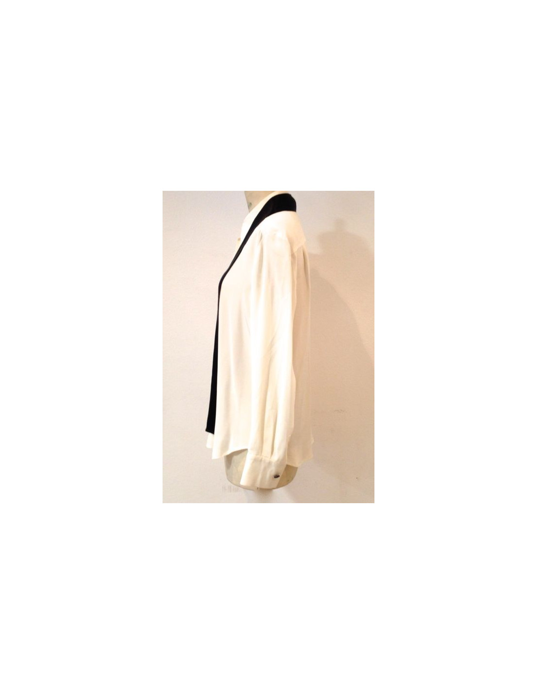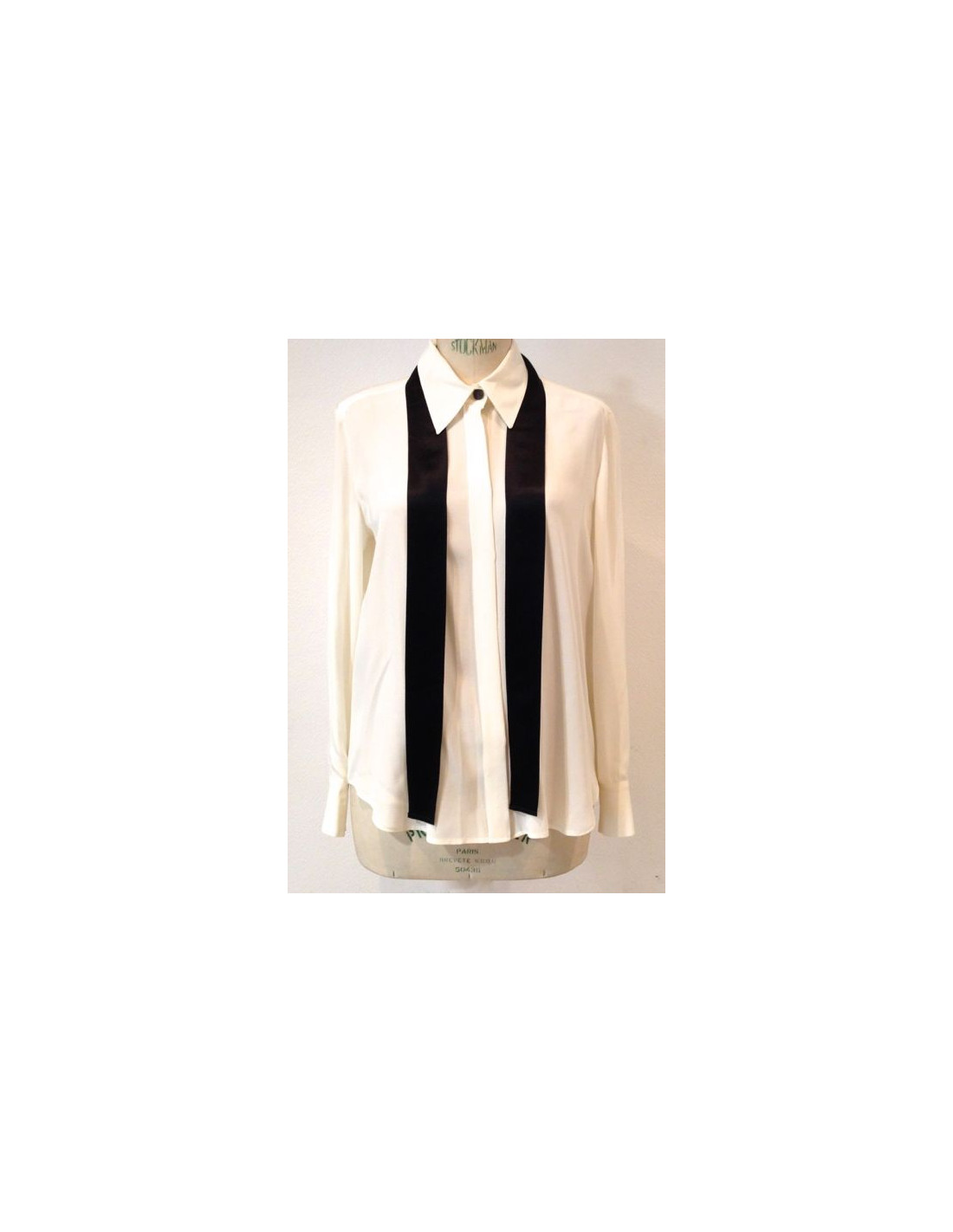 Chemise CHANEL en soie blanc et noir. Patte cachée avec boutons en nacre blanche siglés "CHANEL Paris". Sur les boutonnières de manches, de très jolis boutons en métal argenté noir martelés et siglés CC. Le long du col, un très joli ruban de satin blanc peut être noué autour du cou ou laissé en écharpe chic. Made in France.
