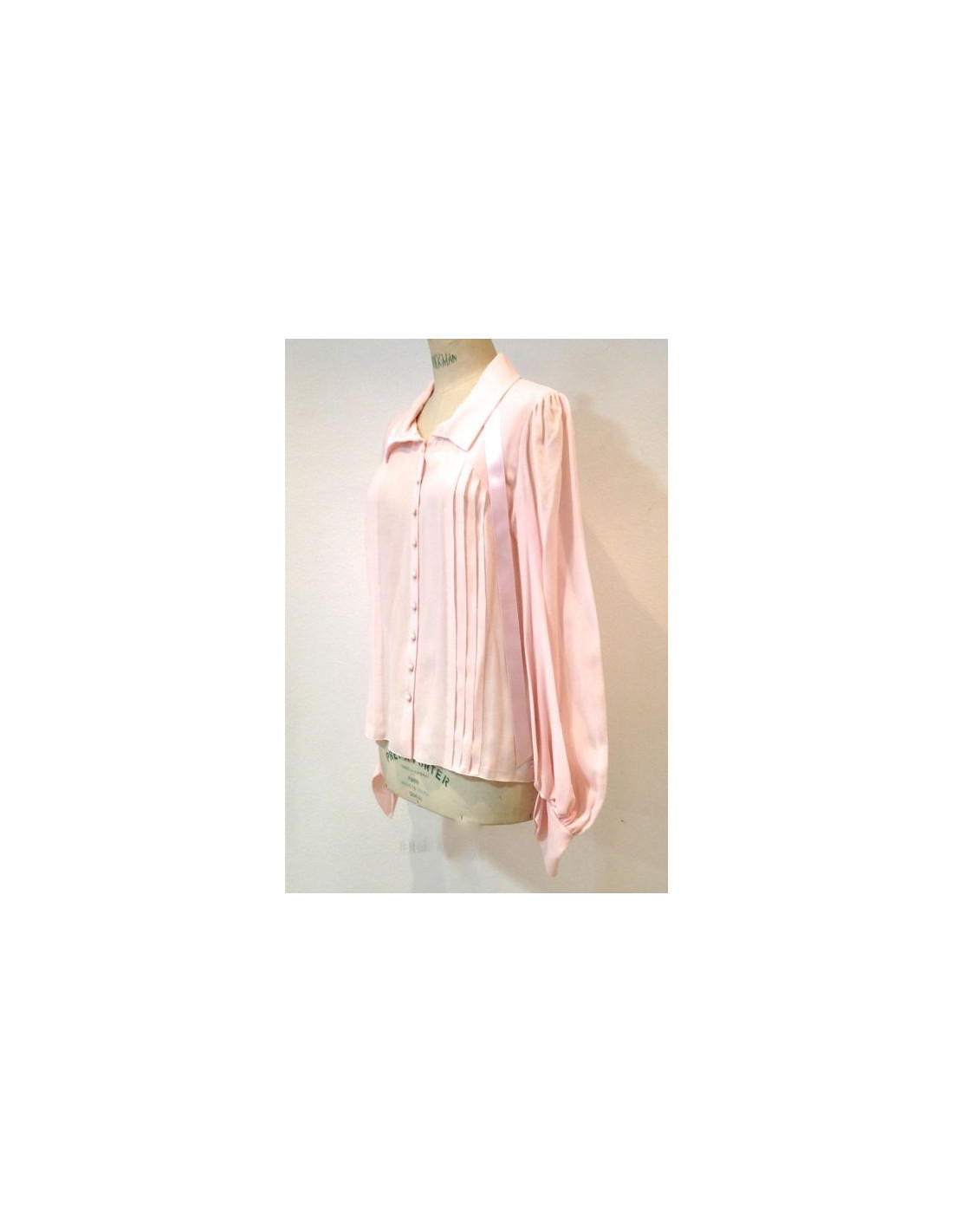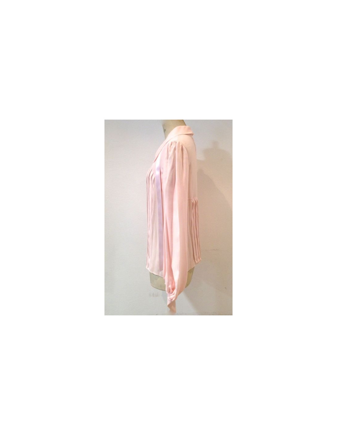 Chemise CHANEL en soie plissée rose barbie, collection Printemps-Eté 2009. Jolies boutons recouverts de soie. Autour du col, un joli bandeau en satin rose peut être noué autour du cou ou le long de la boutonnière. Manches forme boule avec ouverture sur l'intérieure du bras (30 cm) qui laisse apparaître la peau. Boutonnières de manches forme tulipe. Détails plissés dans le dos. Très élégant ce chemisier peut se porter d'une façon très habillée, accessoirisé par de jolies manchettes. Légères tâches d'auréoles sous les bras. Made in France. Etiquette barrée (soldes)