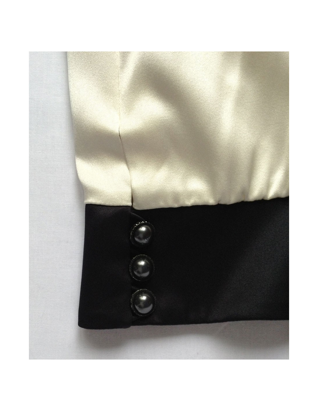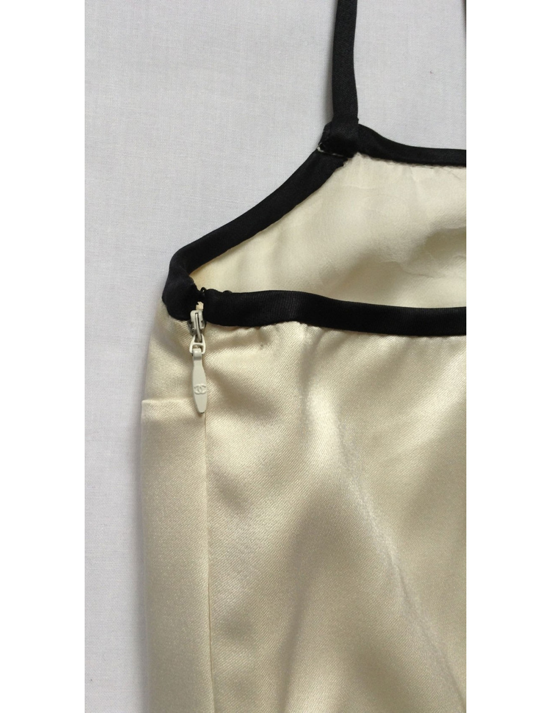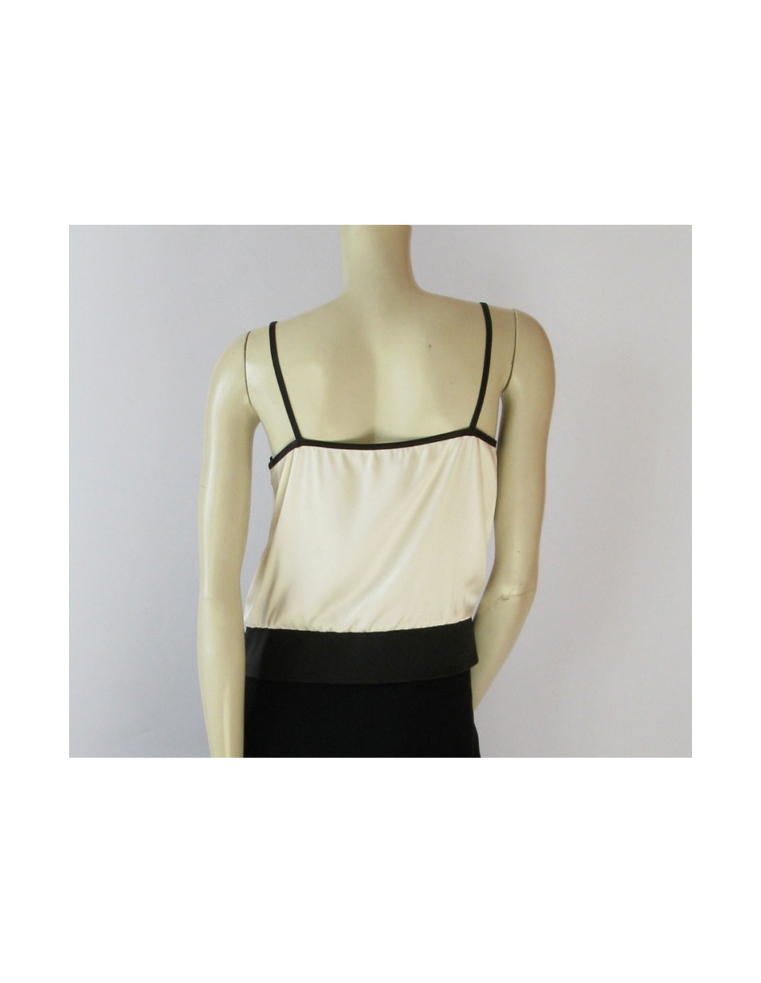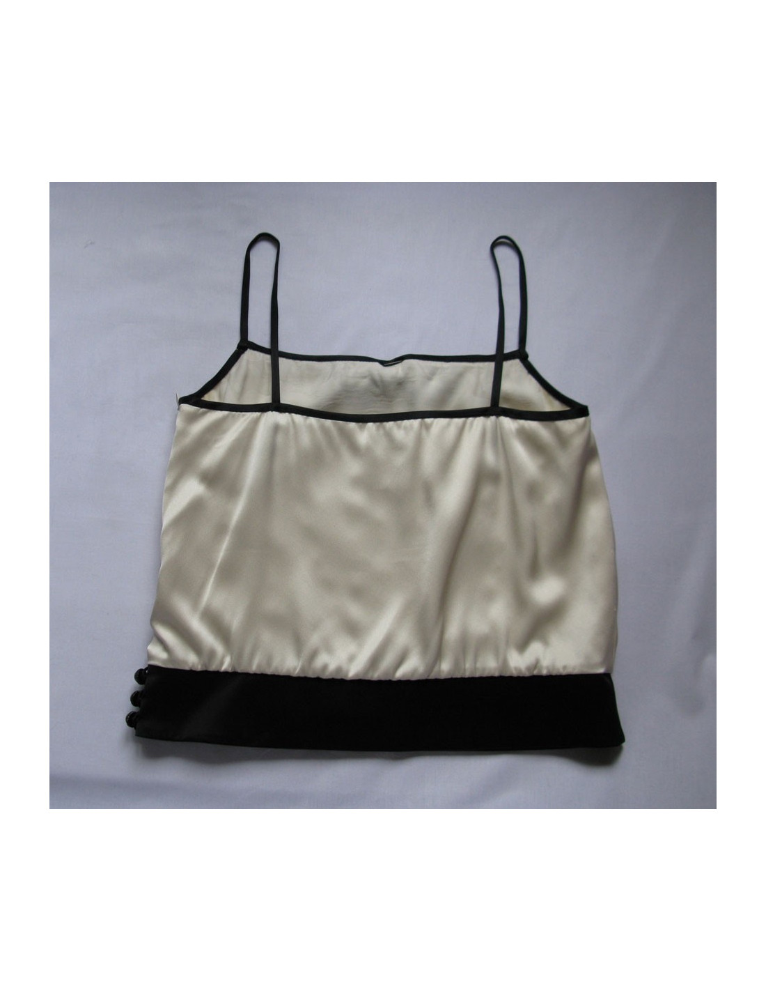 Ravissant! Débardeur en soie duchesse Chanel bicolore écru/noir à fines bretelles noires, col droit bordé de soie noir sur fond écru, agrémenté du mythique petit nœud noir Chanel. Le tout assorti d'une large bande au bas en soie noire décorée de 3 jolis boutons ronds siglés CC sertis de pierre noire. Zip d'ouverture sur le côté gauche ajouté d'une agrafe. Intérieur écru signé de l'écriture Chanel ainsi que du Camélias.Taille 42FR. 100% soie. Collection: Printemps/été Couleur bicolore : écru/noir. les dimensions : longueur : 39 cm largeur, poitrine : 42 cm