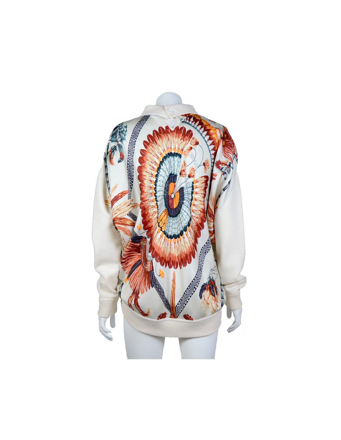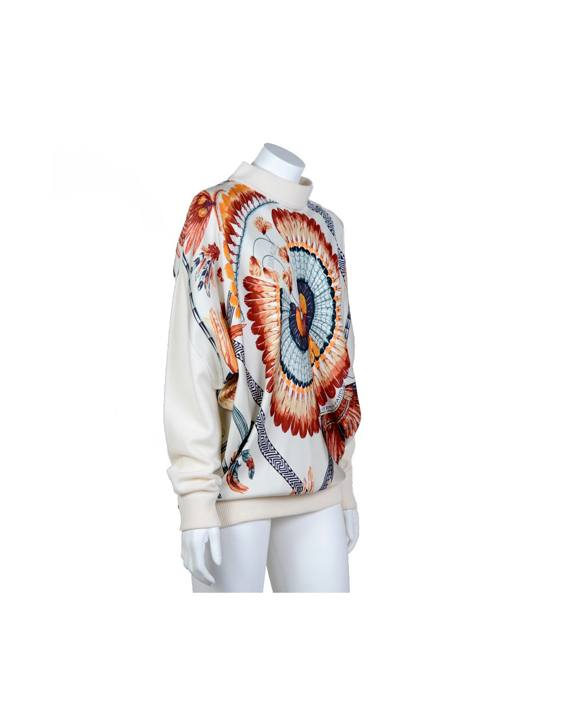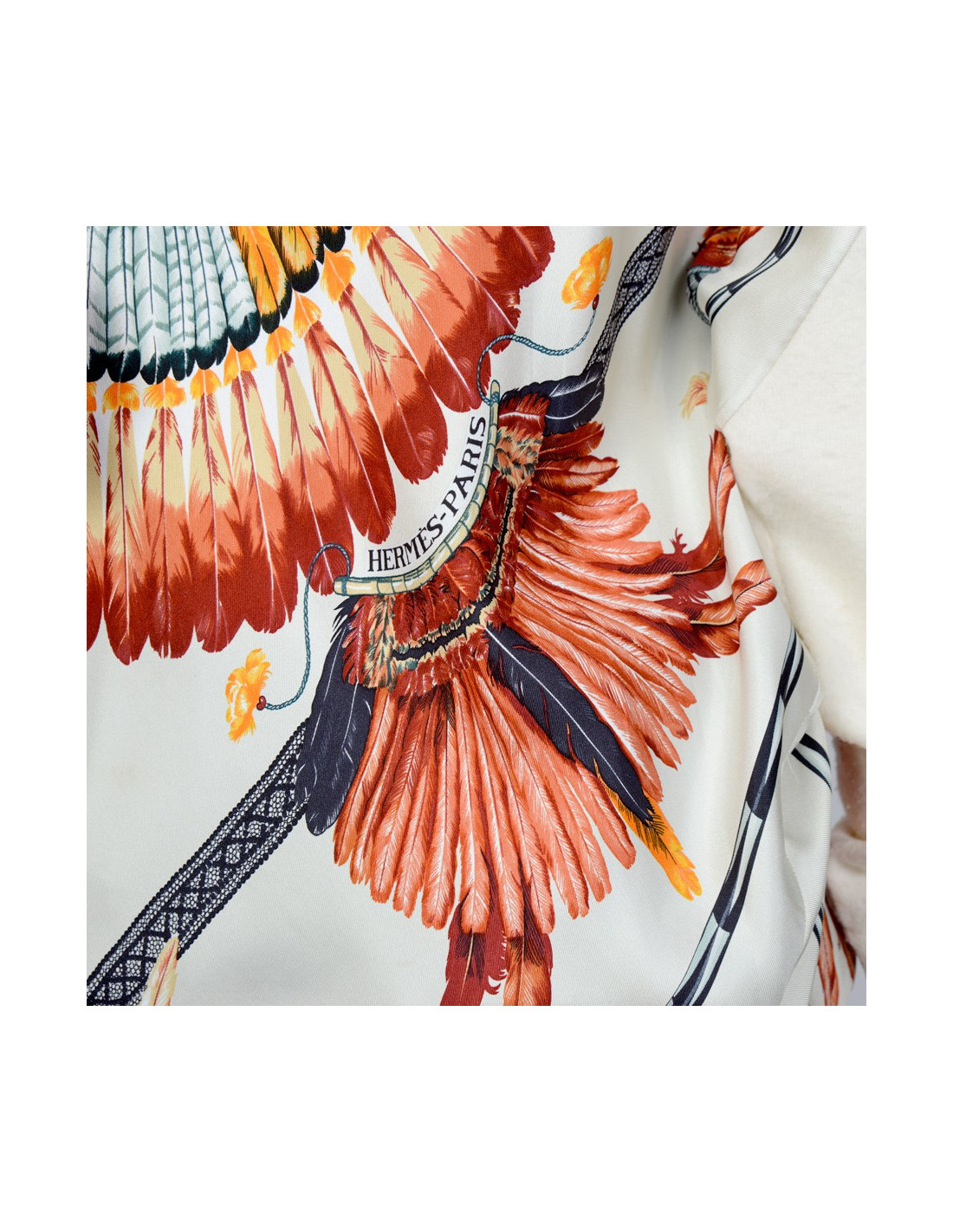Blouse et pantalon Hermès soie motif plumes dans les tons beige. Collection Jean Paul gaultier, taille 40 (sans étiquette de taille). Encolure et emmanchure en maille lainé beige. Blouse en foulard de soie et pantalon en cachemire et ceinture en cuir d'agneau crème. Motifs plumes aux couleurs feu et bambou. Un bouton pour la fermeture se trouve au niveau du col au dos. Très bon état.