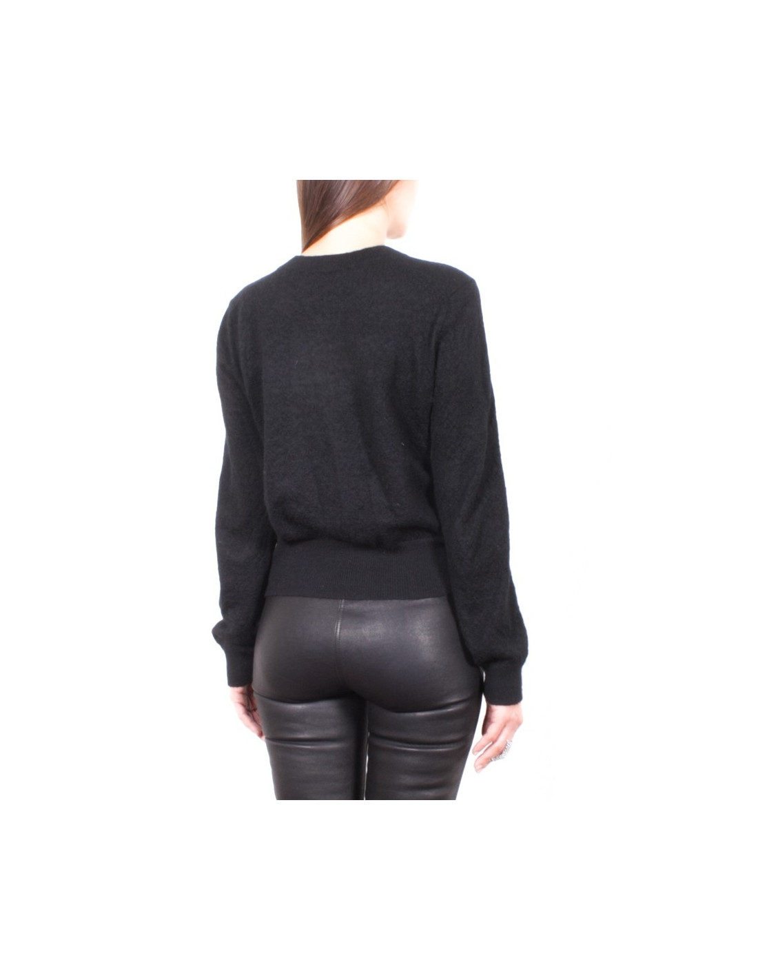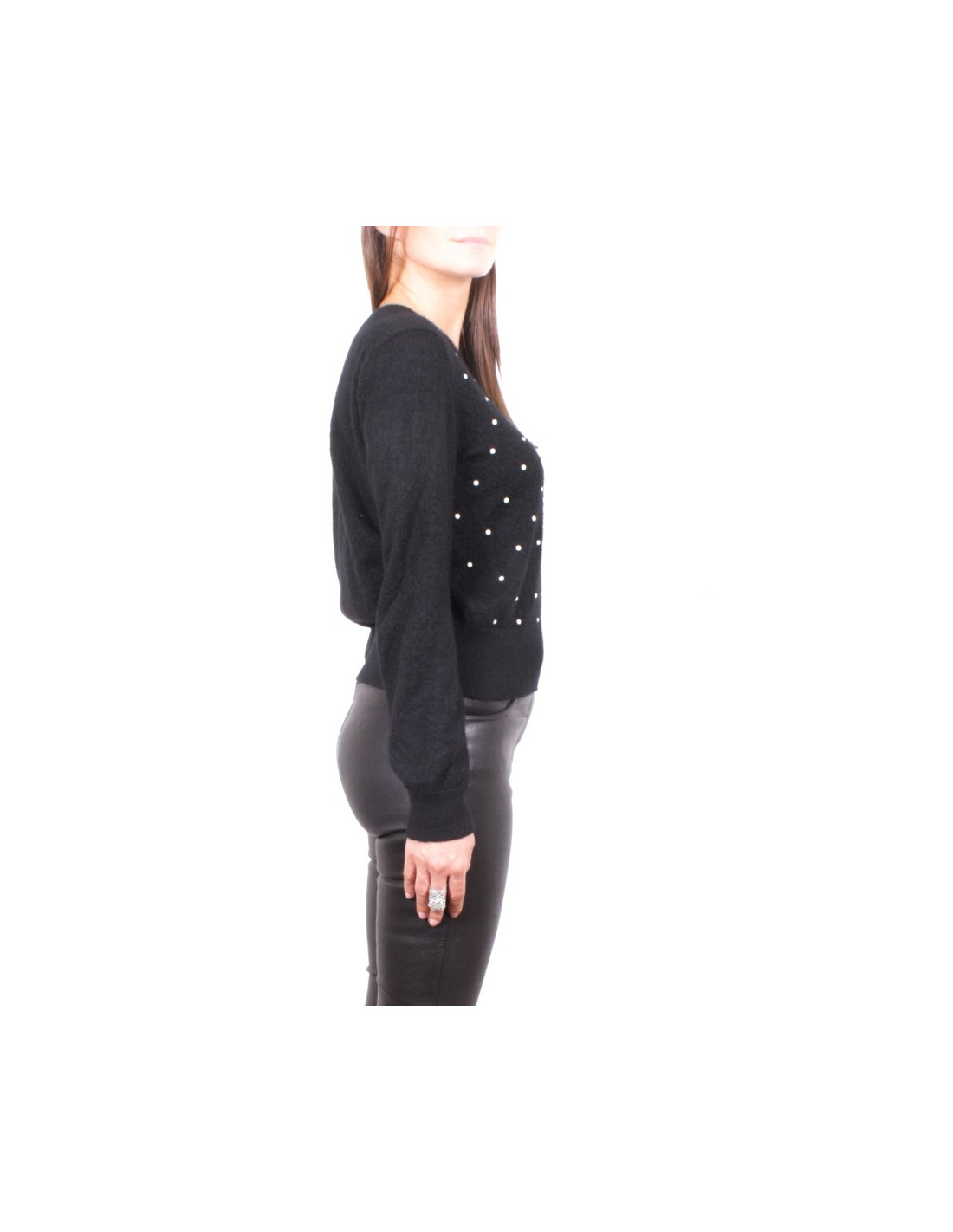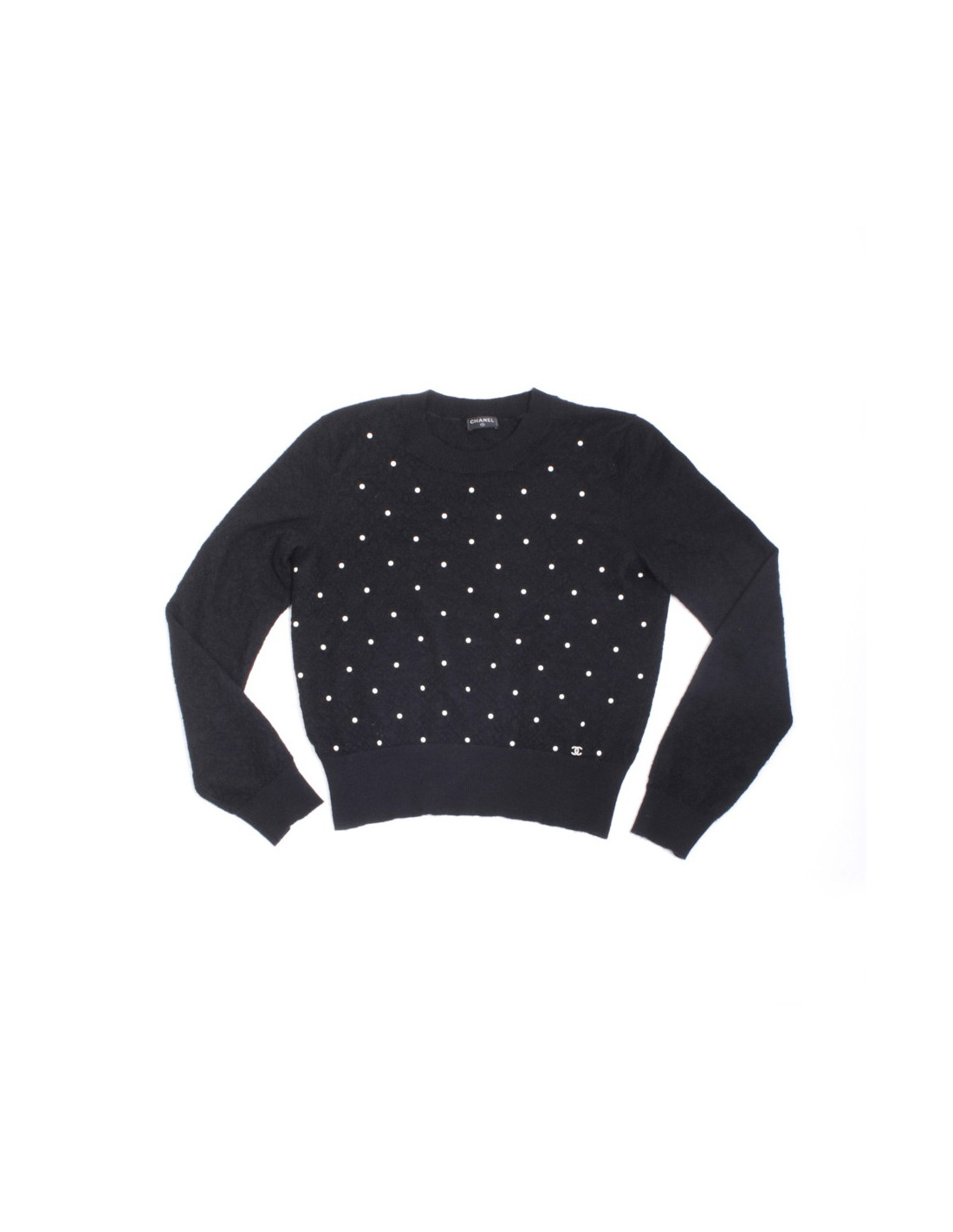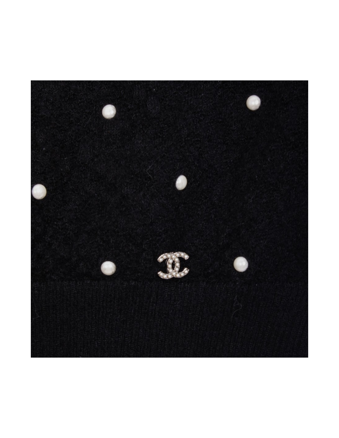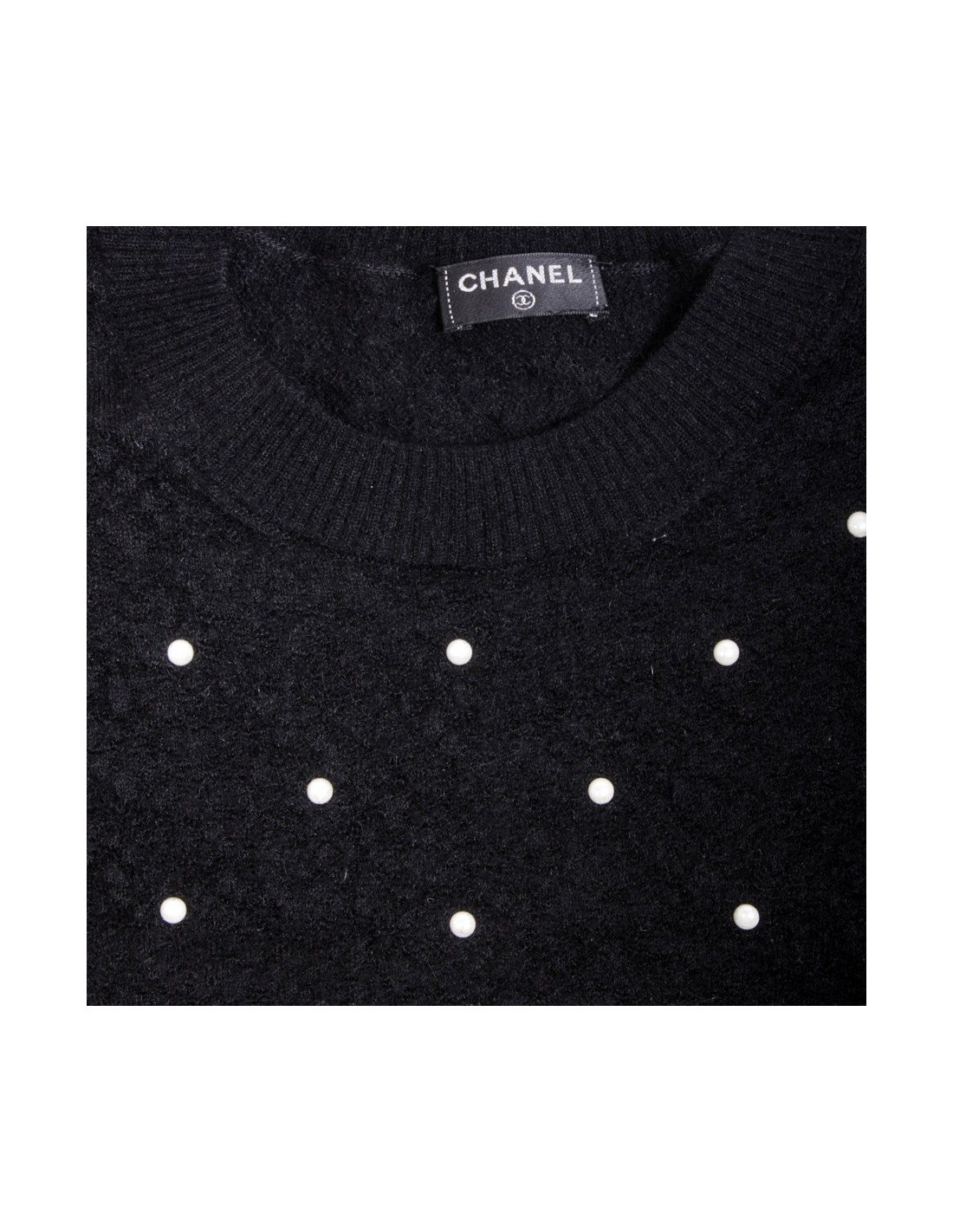 Elégant pull Chanel en mohair et soie noir brodé sur le devant de perles nacrées.