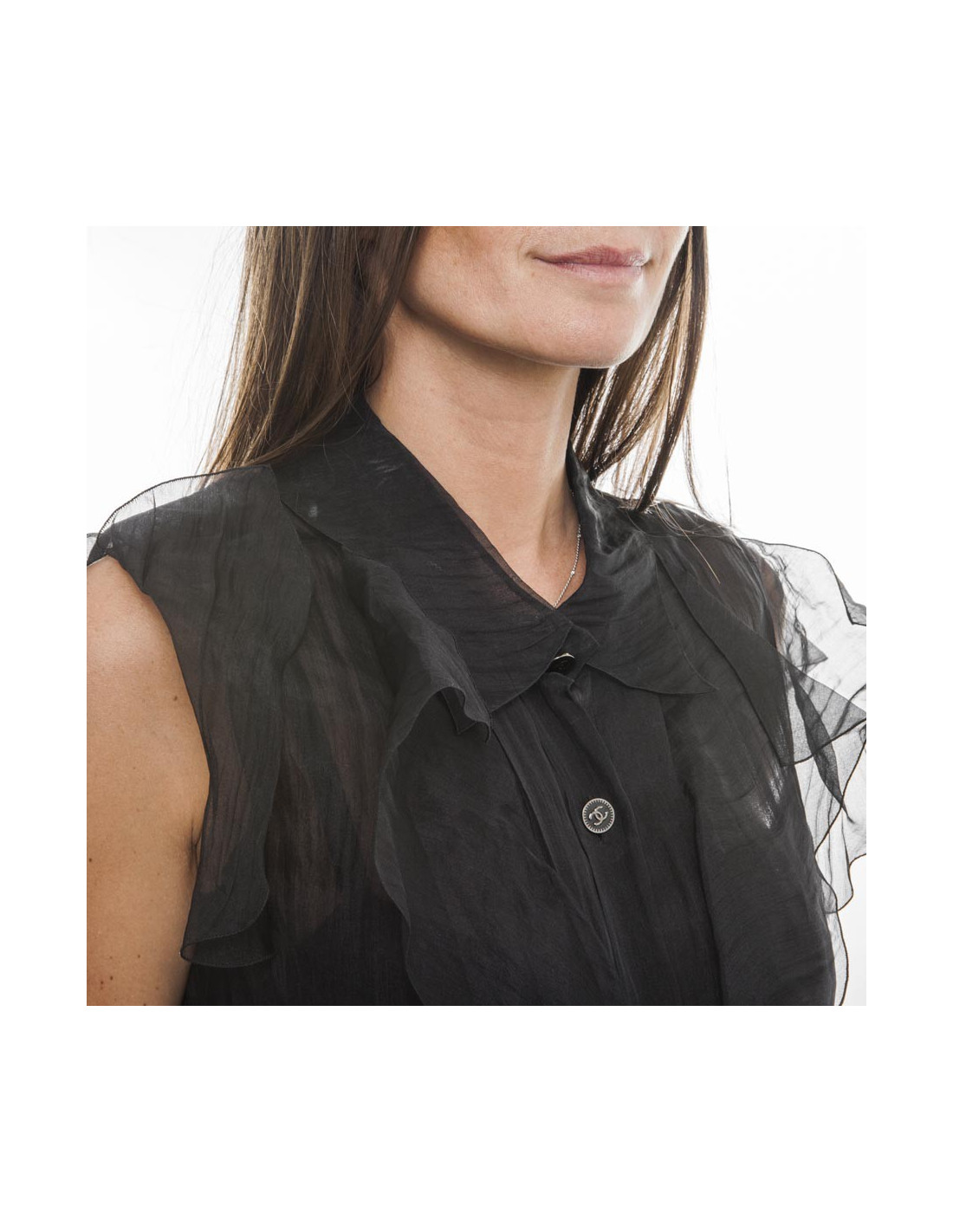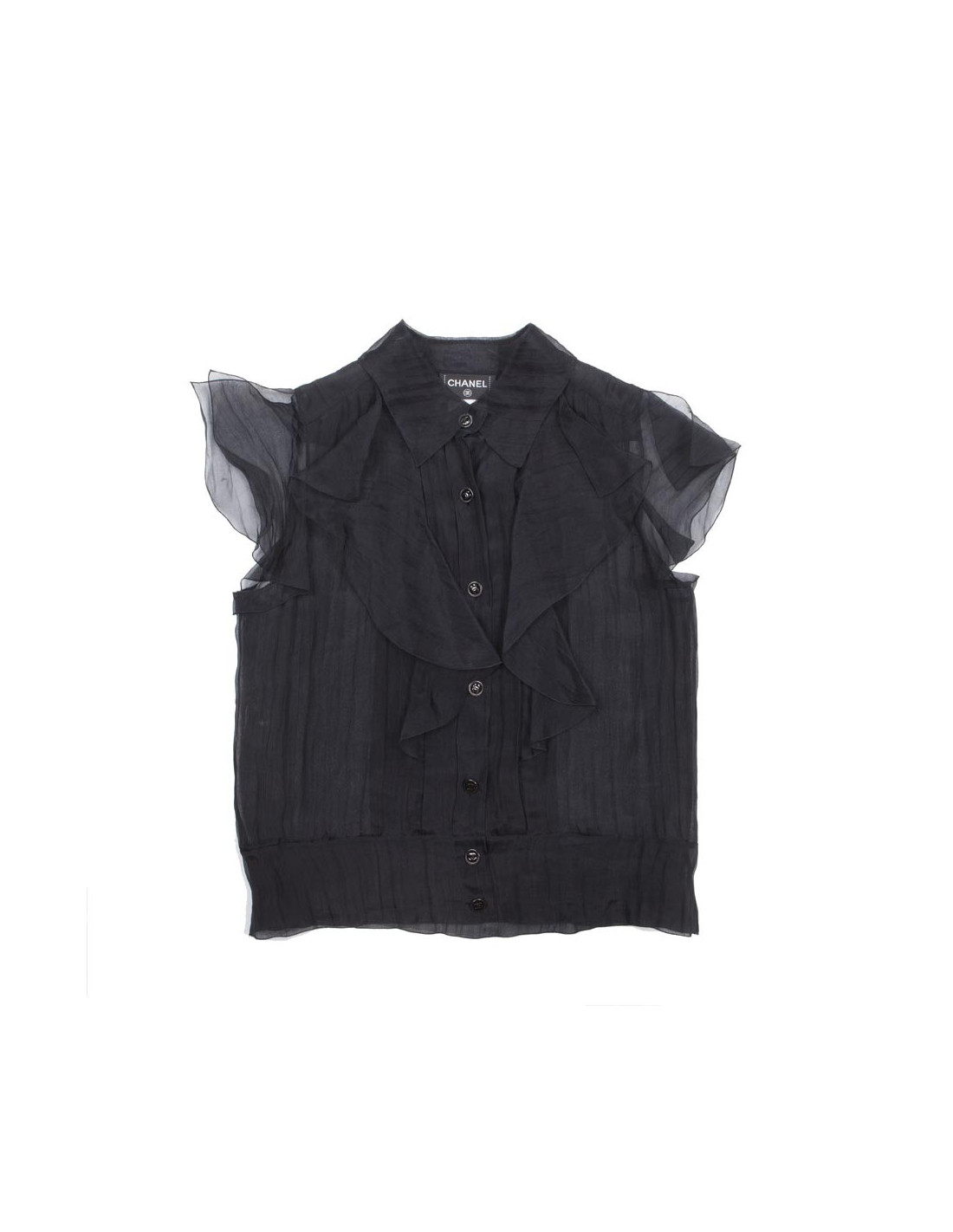 Blouse CHANEL à manches courtes en soie 100% noire. Fermeture par 7 boutons siglés noirs "CC", avec détails : volants de soie noire sur les épaules et à l'avant