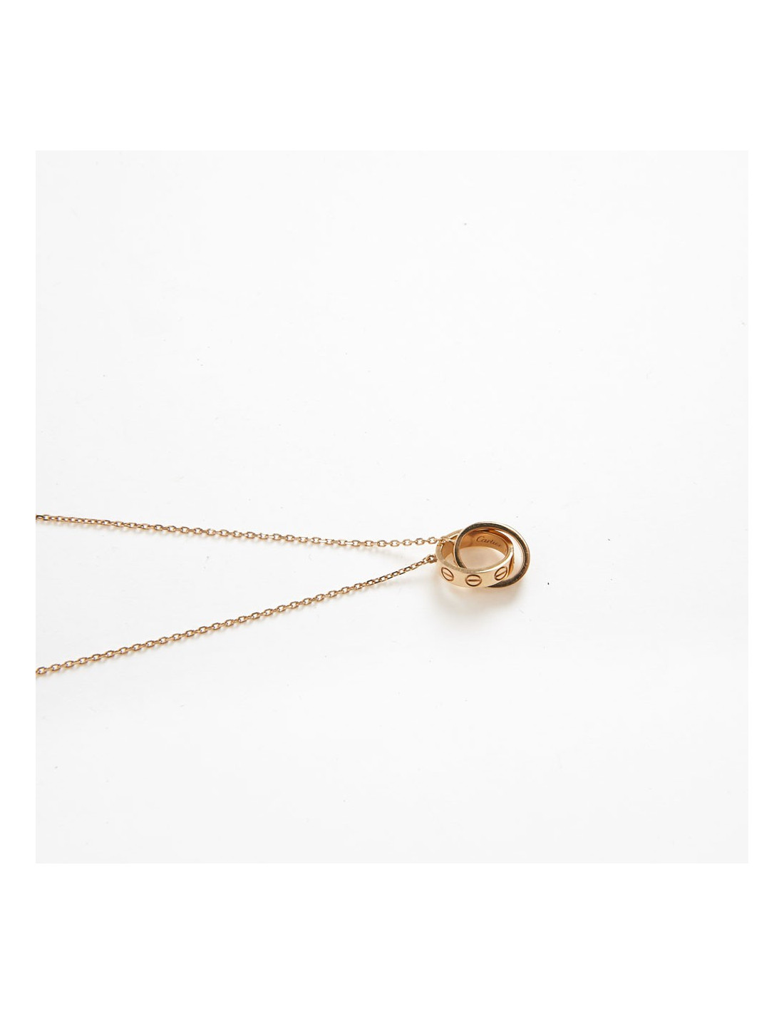 Ce Collier Love double mini bagues, est en or rose 18 carats. La longueur de chaîne est de 47 cm. Il est en très bon état. La Collection Love est née à New York en 1970, et est depuis déclinée en différents modèles, couleur et taille.