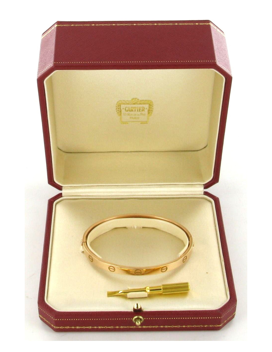 Bracelet LOVE CARTIER en or rose 18 carats, taille 18 cm. Pinçon "Cartier 750" et signature "CAR...". Ce bracelet est fourni dans son coffret de joaillerie d'origine, accompagné du tournevis Cartier, et de sa boîte. En très bon état général, ce bracelet ne présente que quelques micro-rayures non visibles à l'oeil nu. Afin de connaître votre taille pour ce bracelet LOVE, vous pourrez trouver des indications très précises sur le site de la Maison CARTIER.