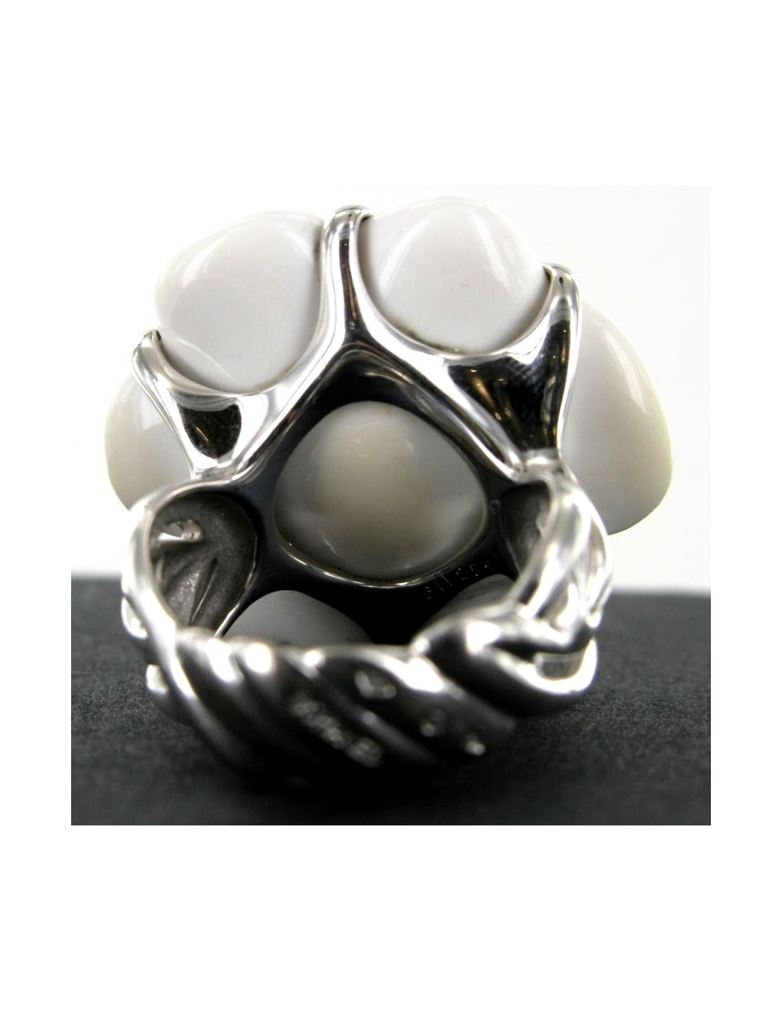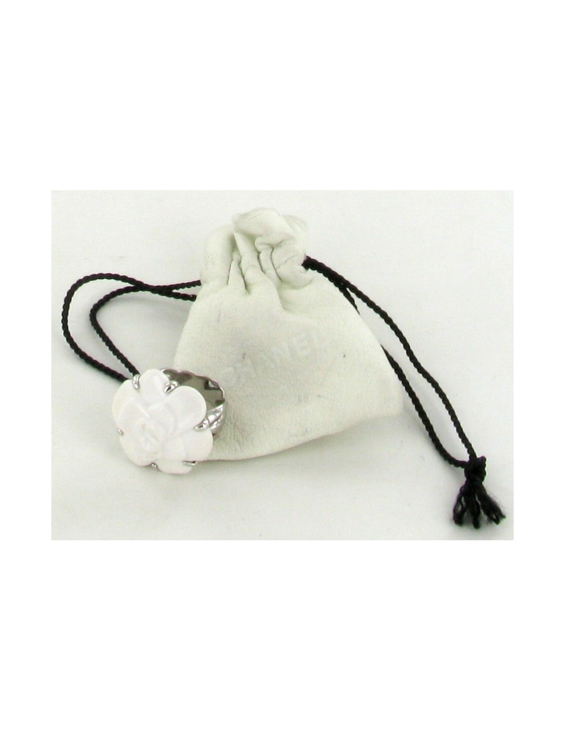 Bague CHANEL Camélia blanche T 58, grand modèle. Pièce inconique de la Maison de Couture. Cette pièce de joaillerie est en agate blanche (calcedoine) et or blanc 18 carats. Montée en or blanc, cette bague est sertie d'un cacholong sculpté. Déjà portée, l'agate est légèrement jaunie. Une petite trace grisatre sur l'un des pétales centraux. La monture en or blanc est très joliment tressée. Poinçon or 18K 750. Vendue dans sa pochette en cuir blanc siglé CHANEL.