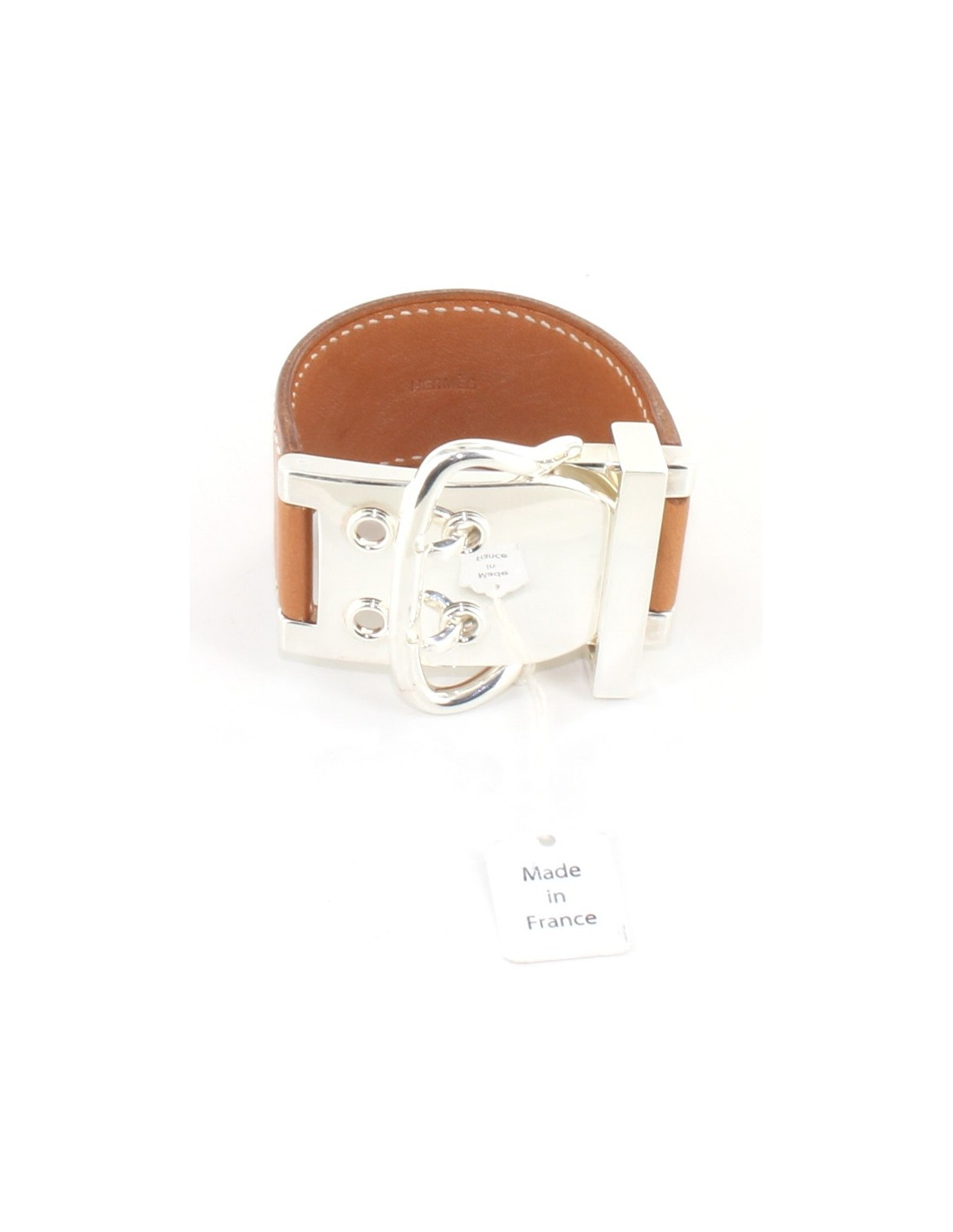 Bracelet HERMES, modèle Boucle Sellier, grand modèle, en cuir naturel gouleur gold et boucle en métal argenté. "s" des soldes . Convient à un très petit poignet (13-14,5 cm). Poinçon Ag 925., poids total : 78,3 grammes. très peu porté. Micro-rayures dusage.