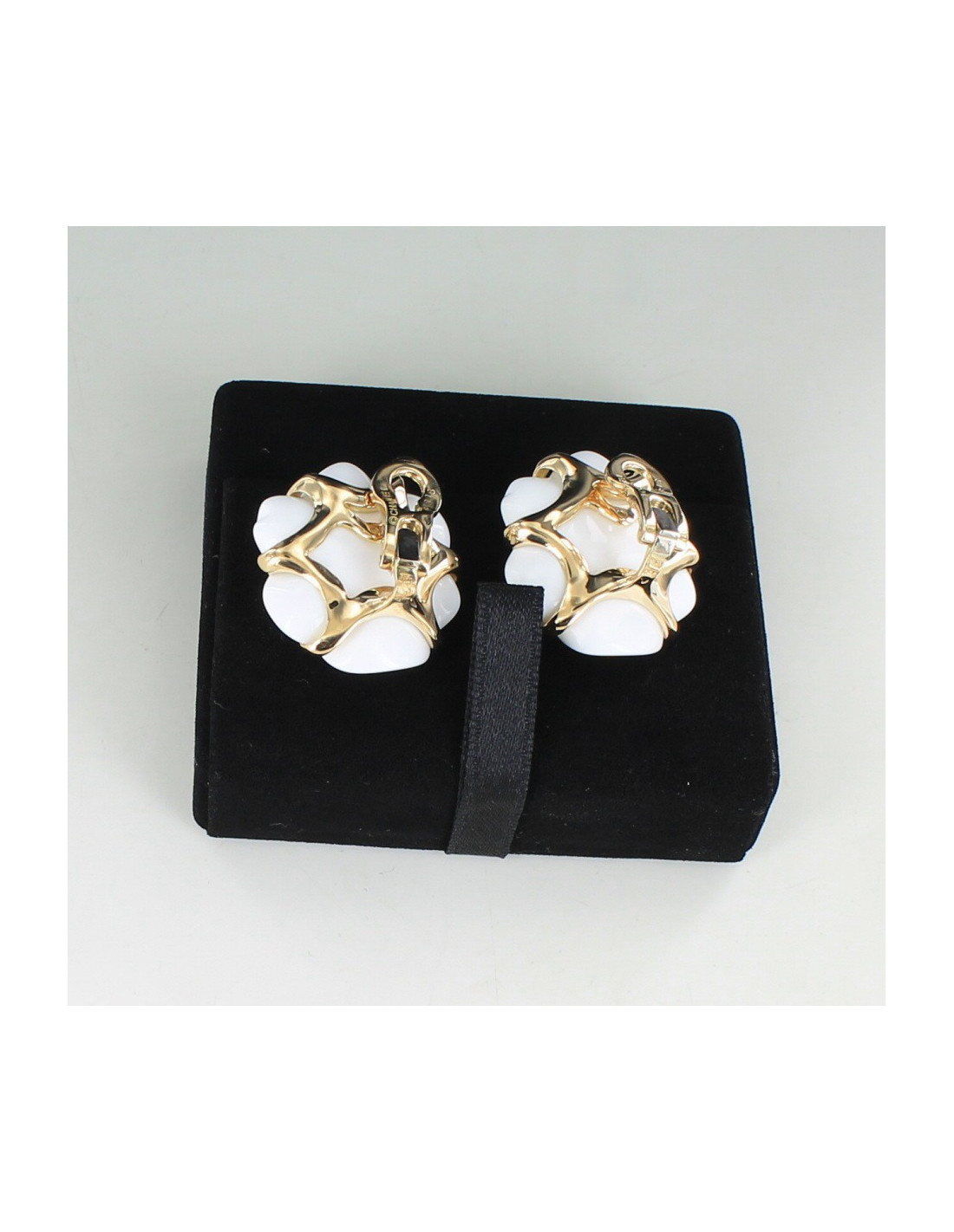 Rare ! Boucles d'oreille clips d'oreille Chanel, joaillerie, appelées aussi motifs d'oreilles, en or jaune et agate blanche. diamètre 2.5 cm -