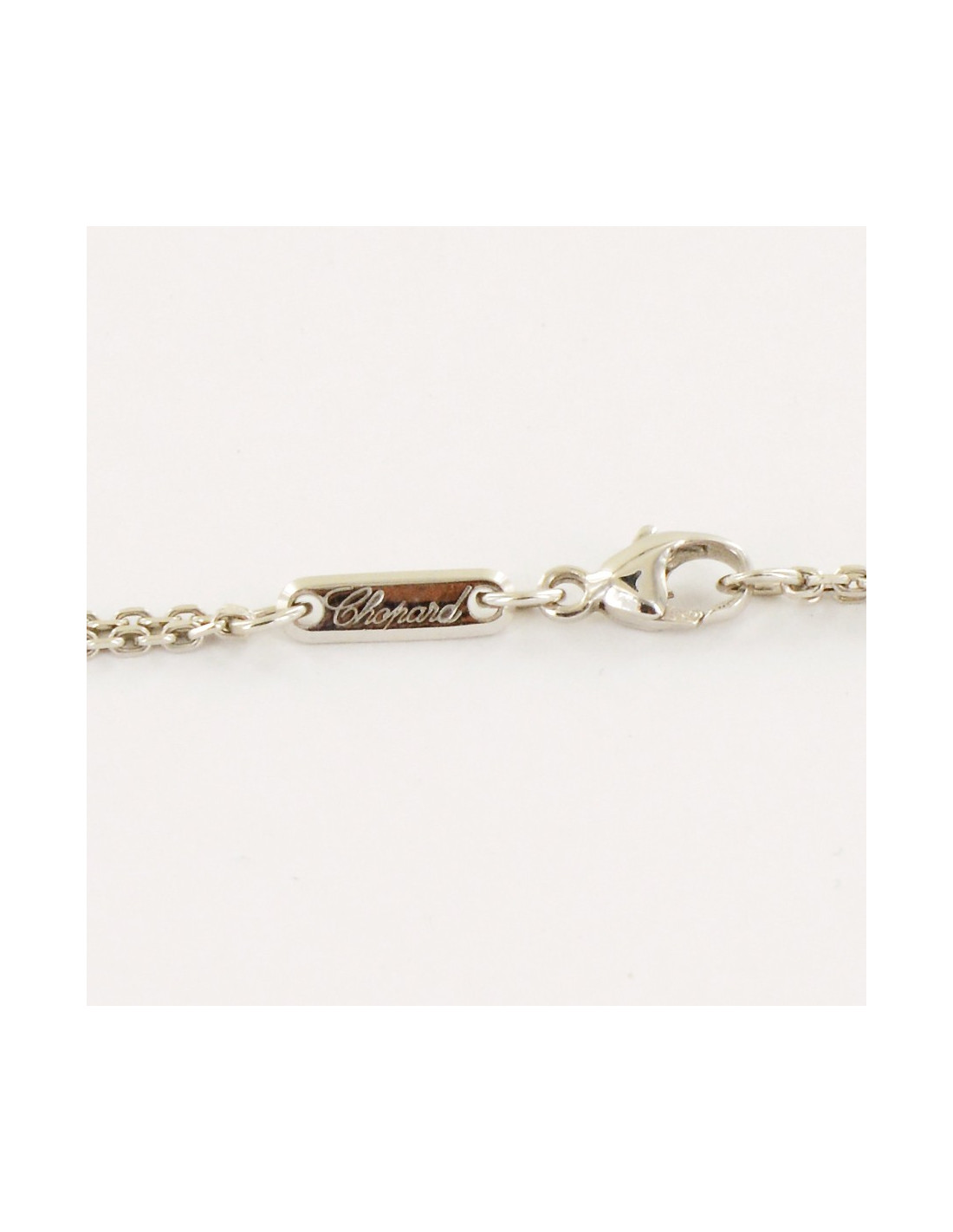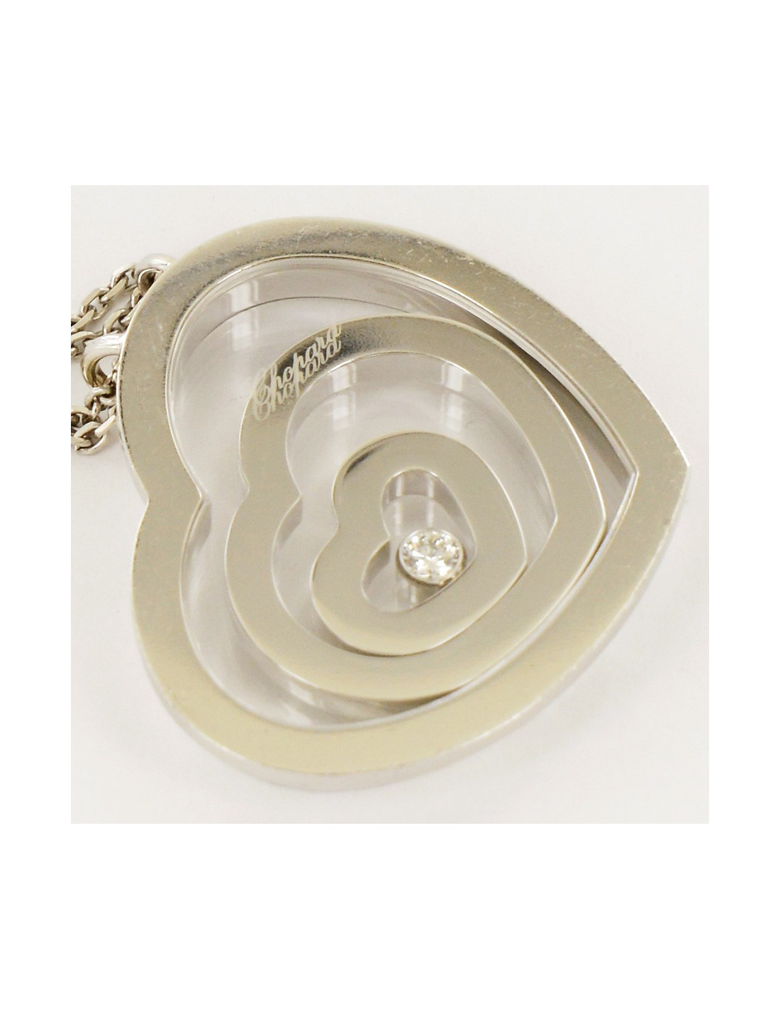 Superbe collier coeur "Happy Spirit" Chopard, en or blanc 18 carats et un diamant et un coeur flottants, d'un poids de 34.2 grammes. prix public : environ 4700 euros