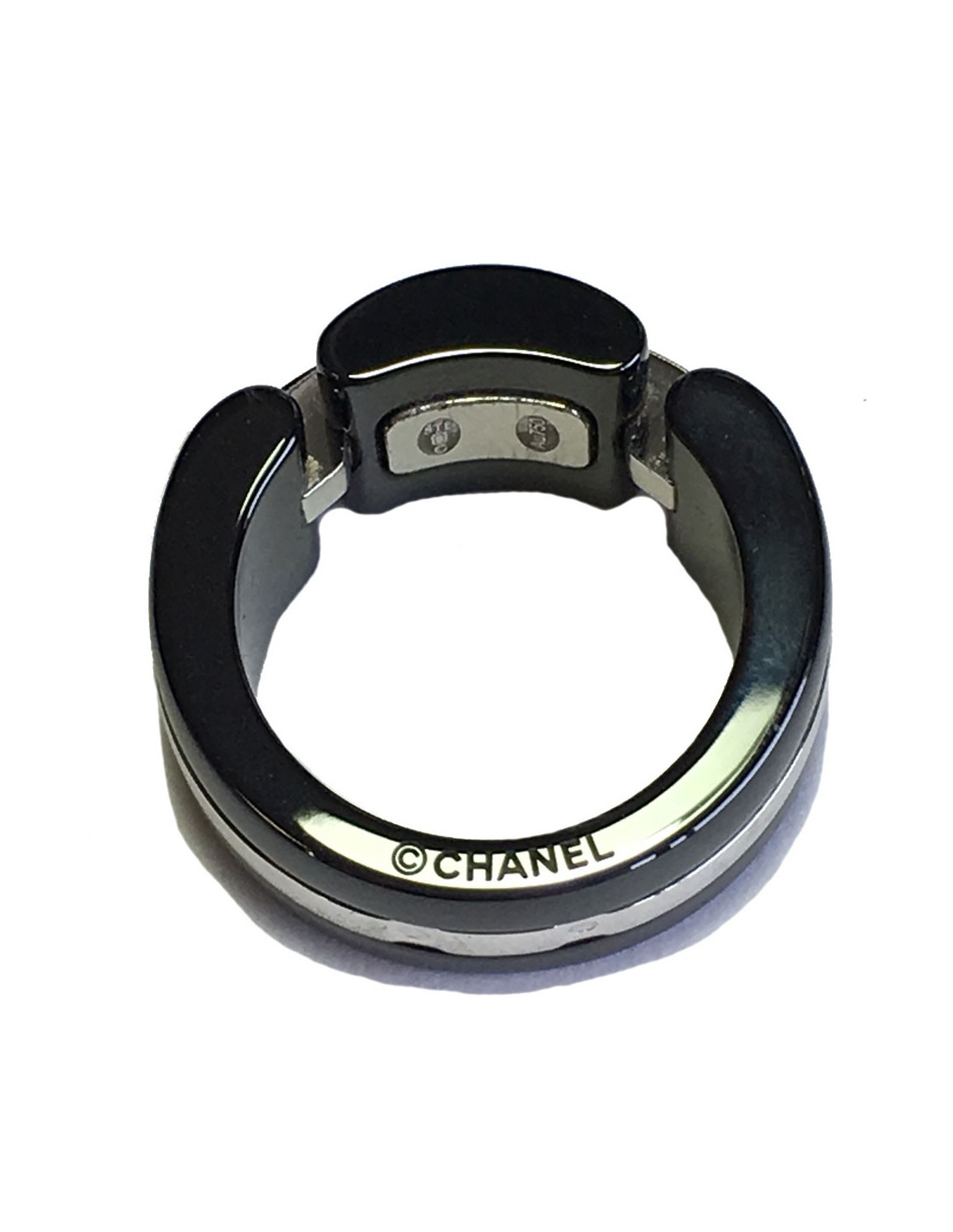 Très belle bague Chanel, modèle "Ultra" en or blanc 18 carats, céramique noire et diamants dont un plus gros au centre. Moyen modèle. Taille 51