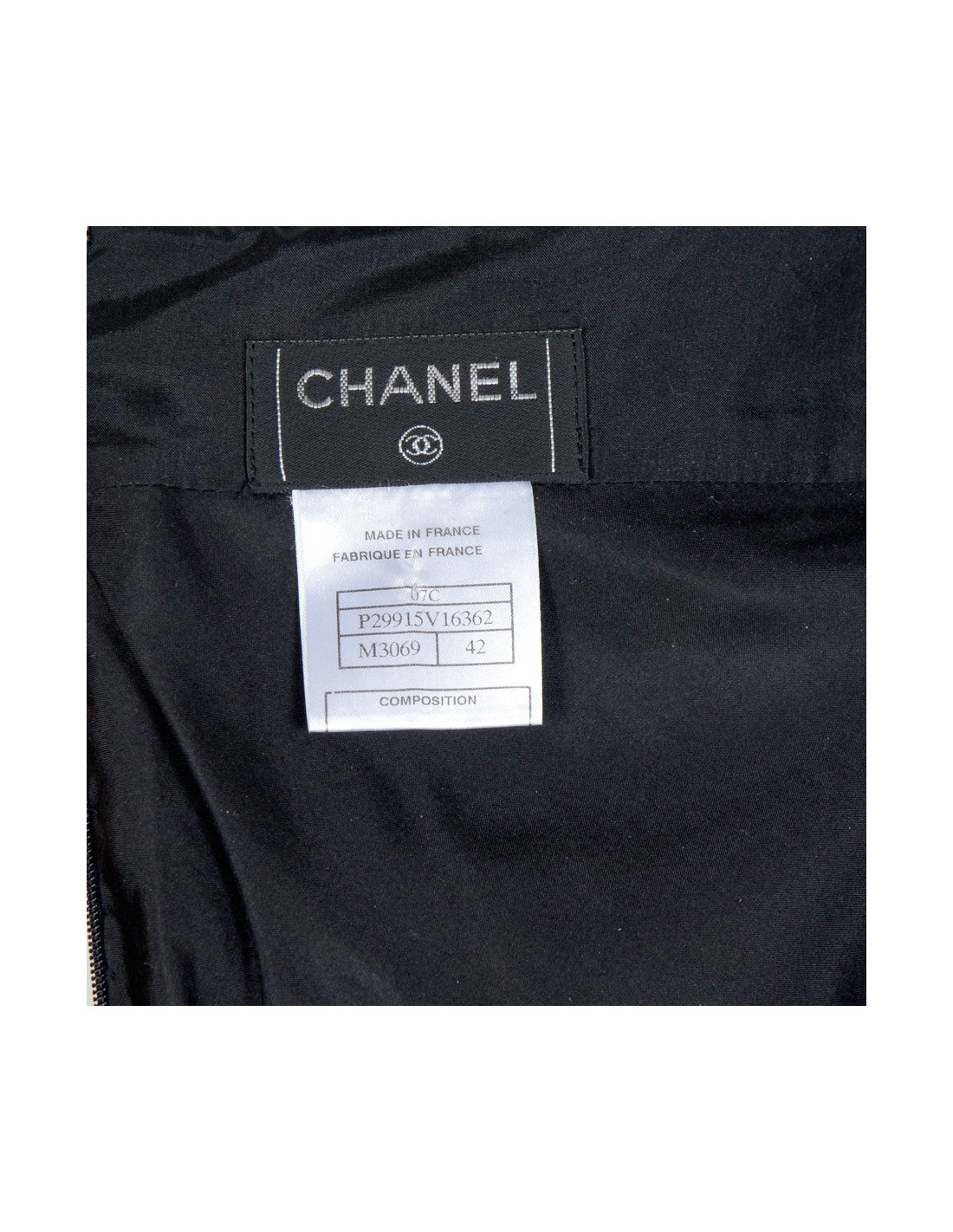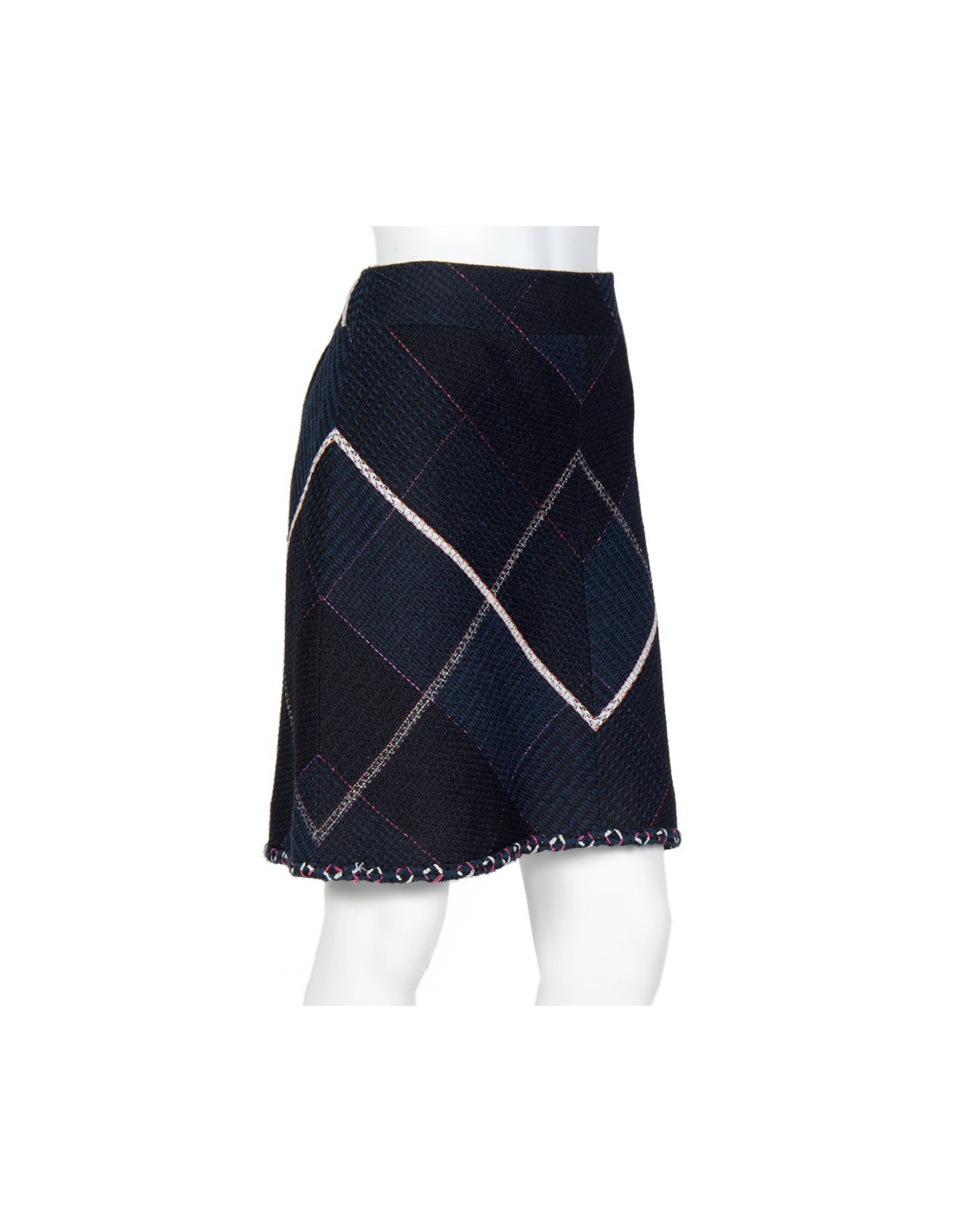Jupe Chanel en tweed de coton bleu marine et noir avec des motifs géométriques. Taille 42. Fermeture zippée dans le dos. Ourlet en tweed torsadé en bas de la jupe. La doublure est en soie noire. En très bon état.