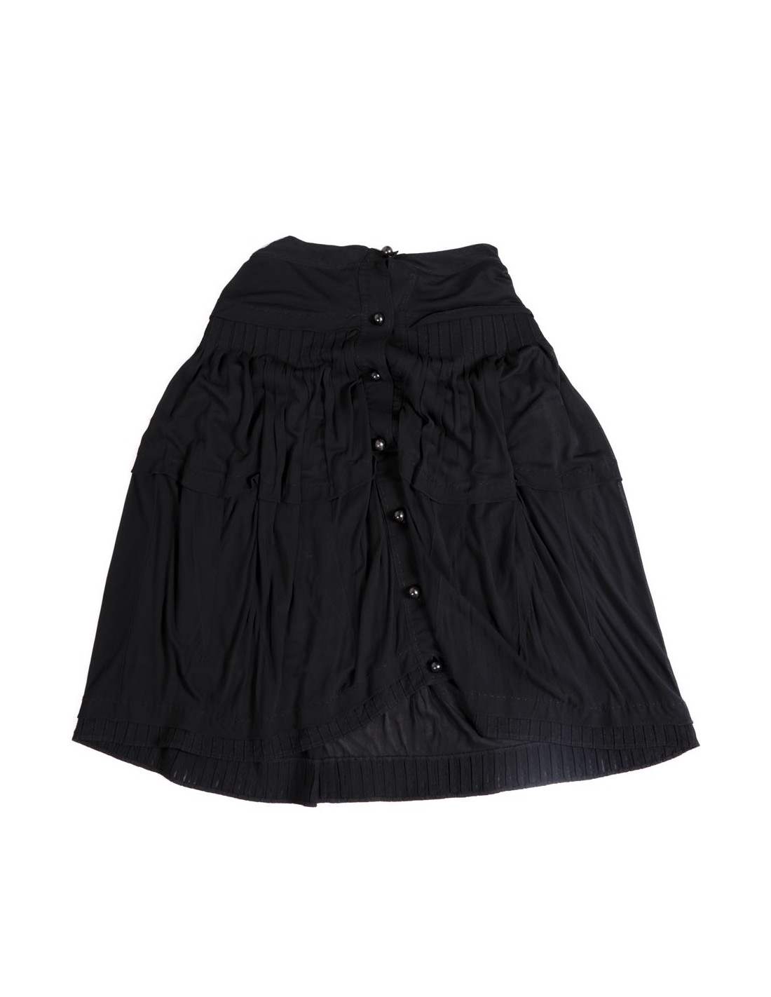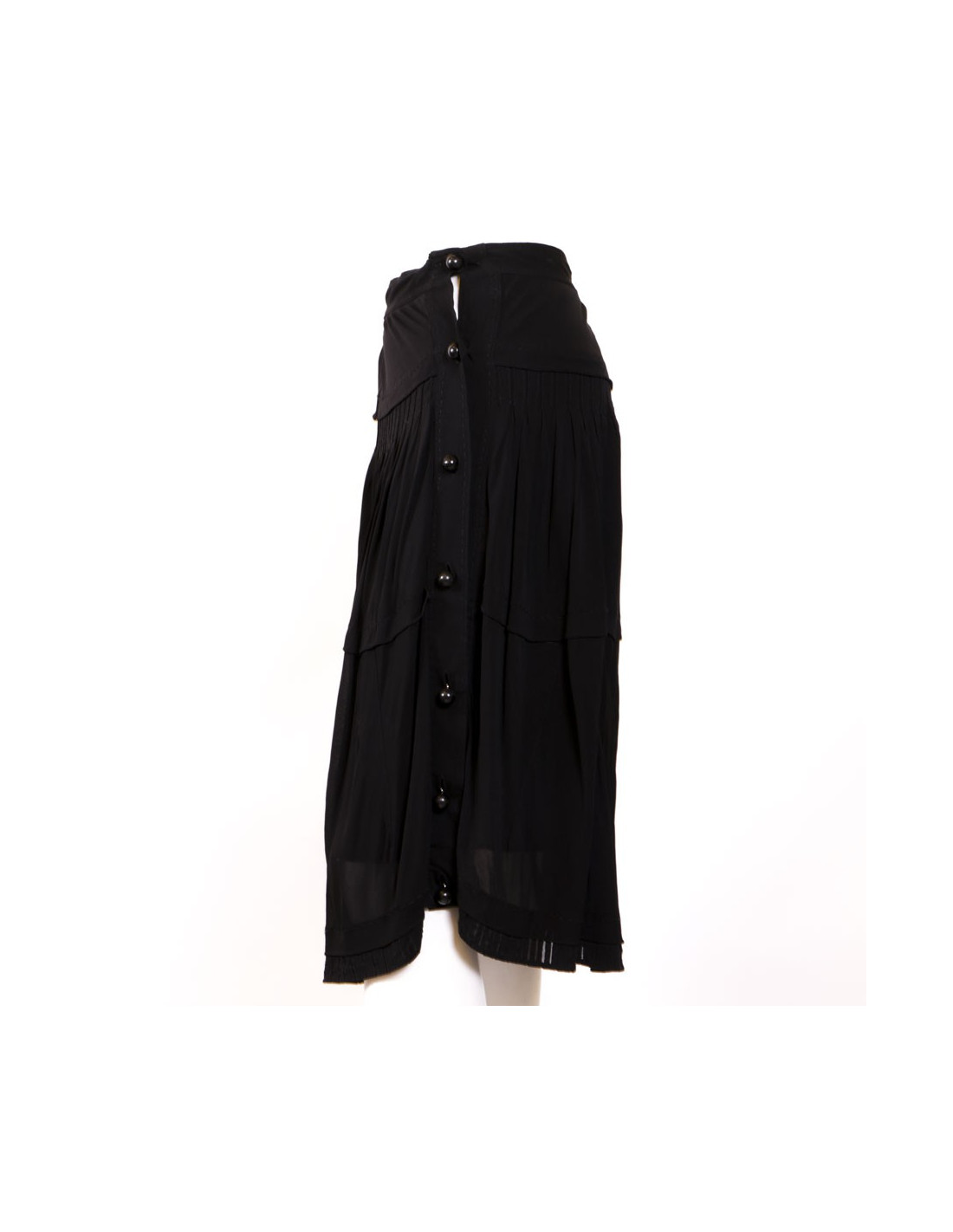 Ravissante jupe de la Maison Yves Saint Laurent en mousseline de soie noire. Equivaut à une taille 42-44. Fermeture boutonnée centrale à l'aide de 7 boutons en bois. Doublure intérieure. Elle est légèrement plissée. En très bon état.