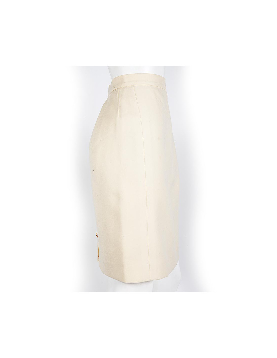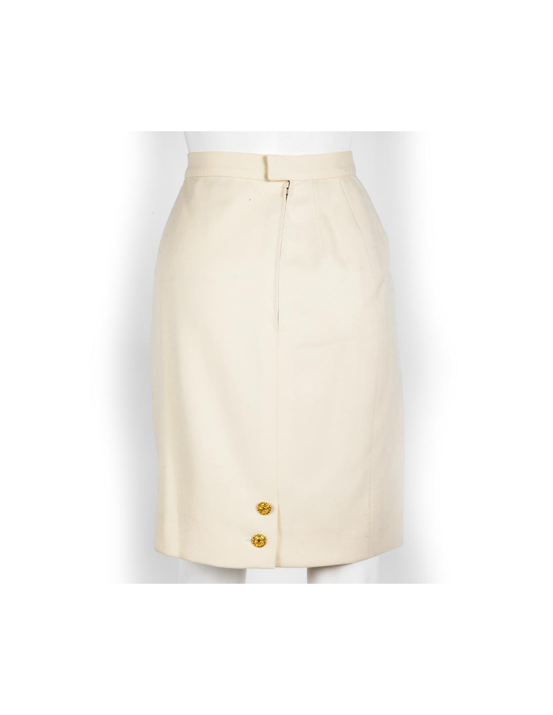 Très élégante jupe CHANEL à pinces en laine écrue , coupe droite, taille 38. Taille haute, elle est ornée de deux boutons dorés siglés double CC.
