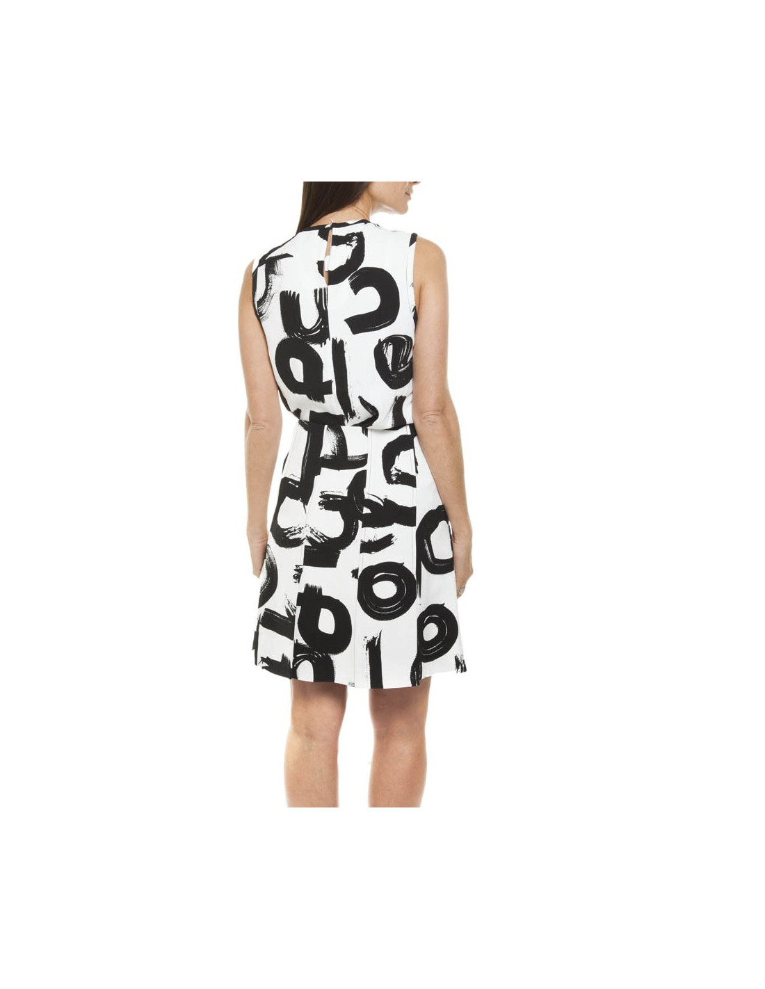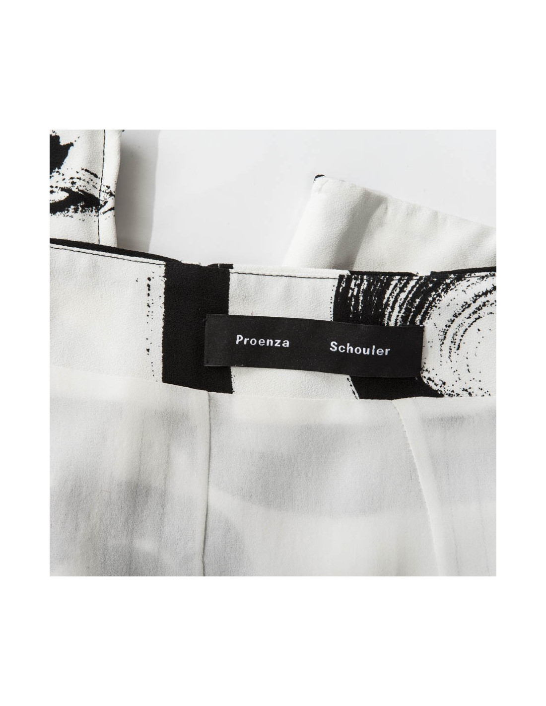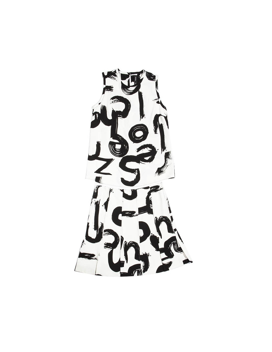 Ensemble jupe et haut en viscose Proenza Schouler taille 36. L'ensemble est blanc imprimé de motifs façon "tableau street art" noirs. Les deux pièces sont doublées de soie blanche. Le haut est sans manches, coupe droite et se ferme grâce à un bouton pression; la jupe est plissée et fendue à chaque pli (voir photo). Elle est discrètement zippée sur le côté gauche.