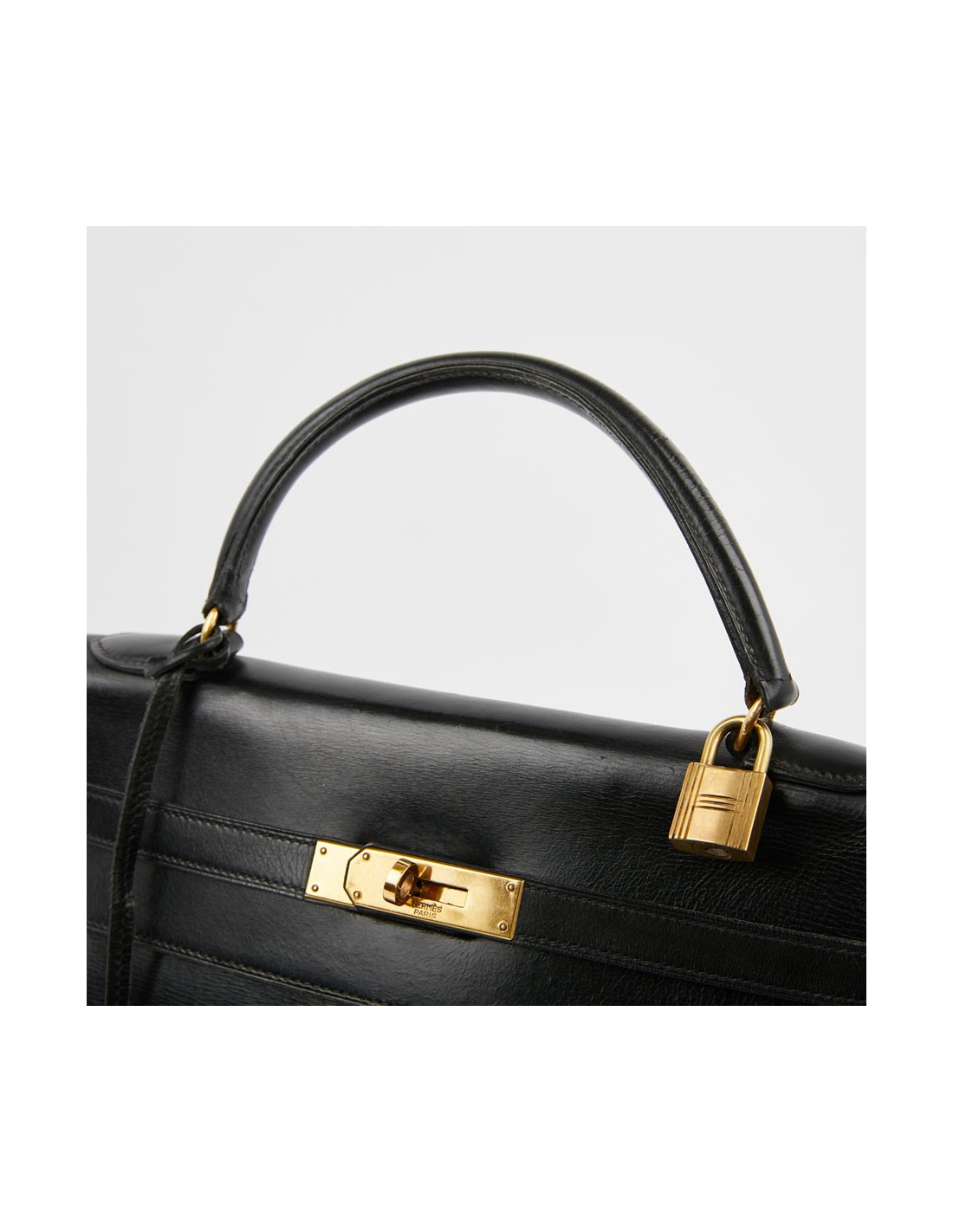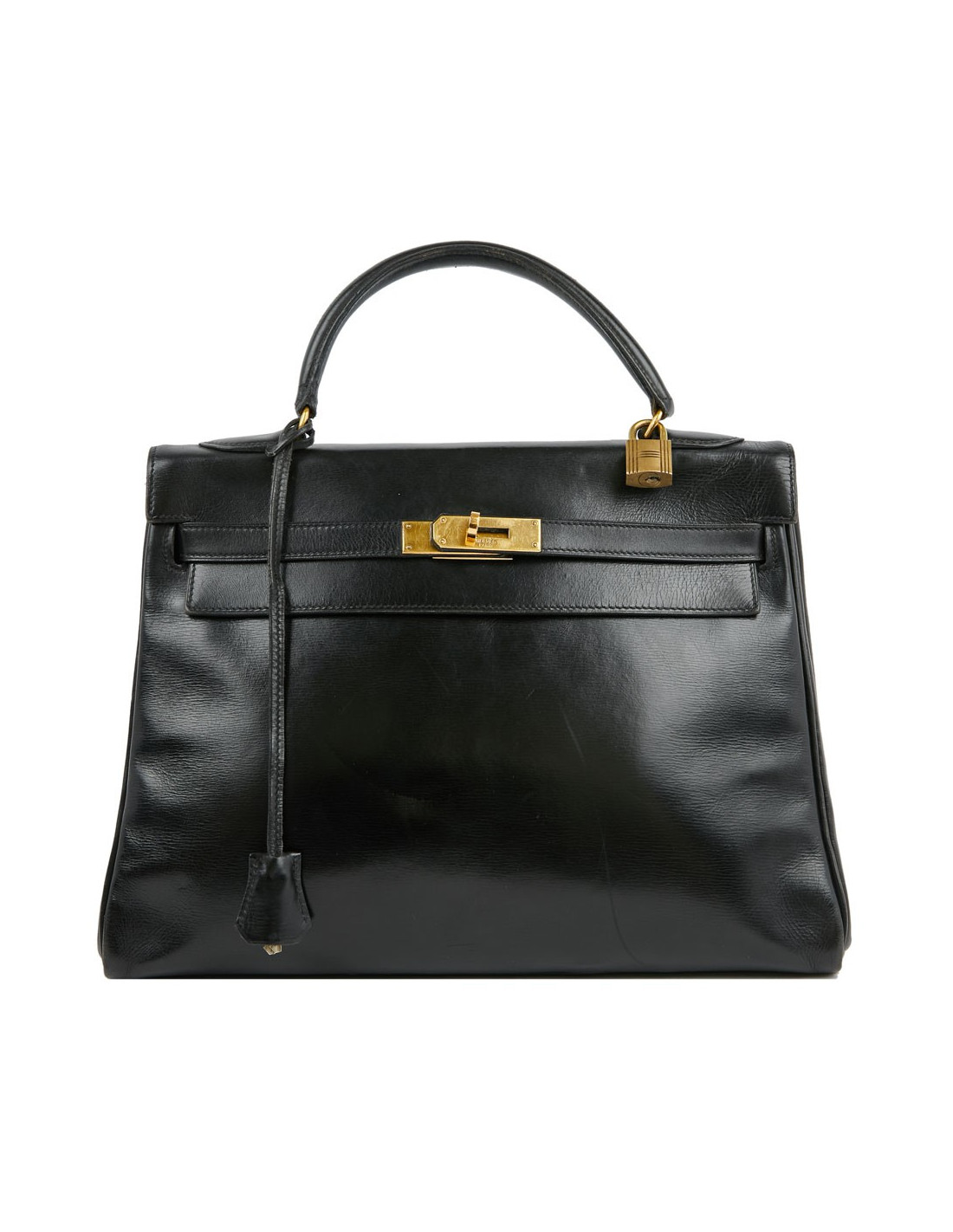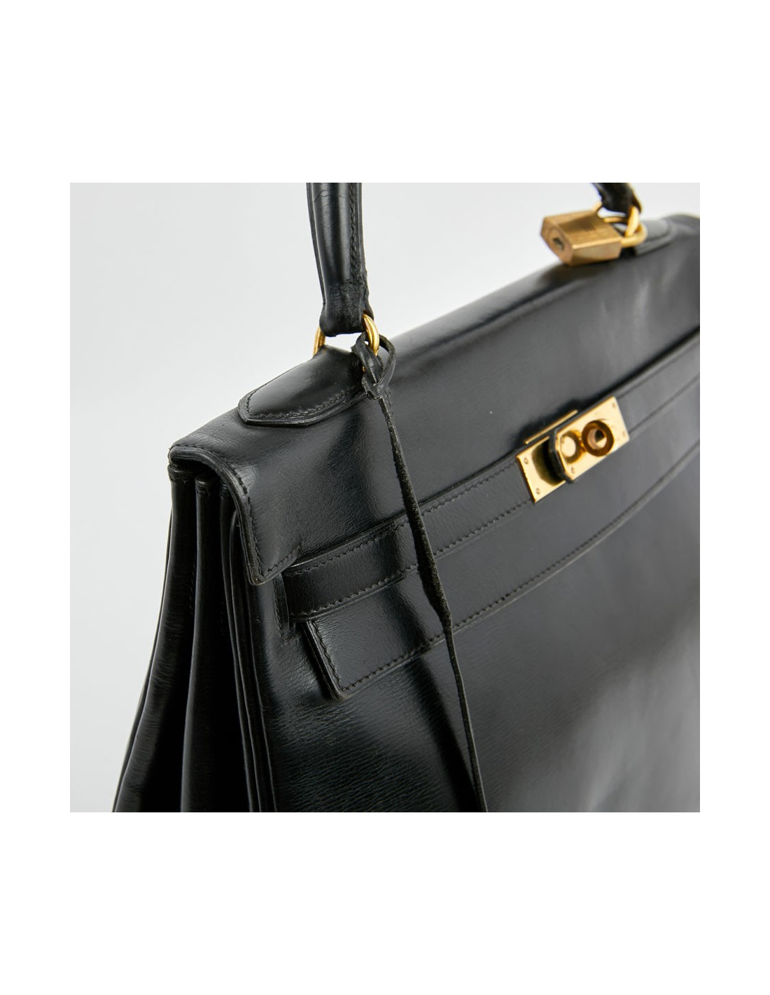 Ce Kelly 32 vintage en cuir box noir est un modèle iconique de la Maison Hermès. La garniture est en métal doré. Il sera livré avec sa tirette, clochette, clefs et cadenas.