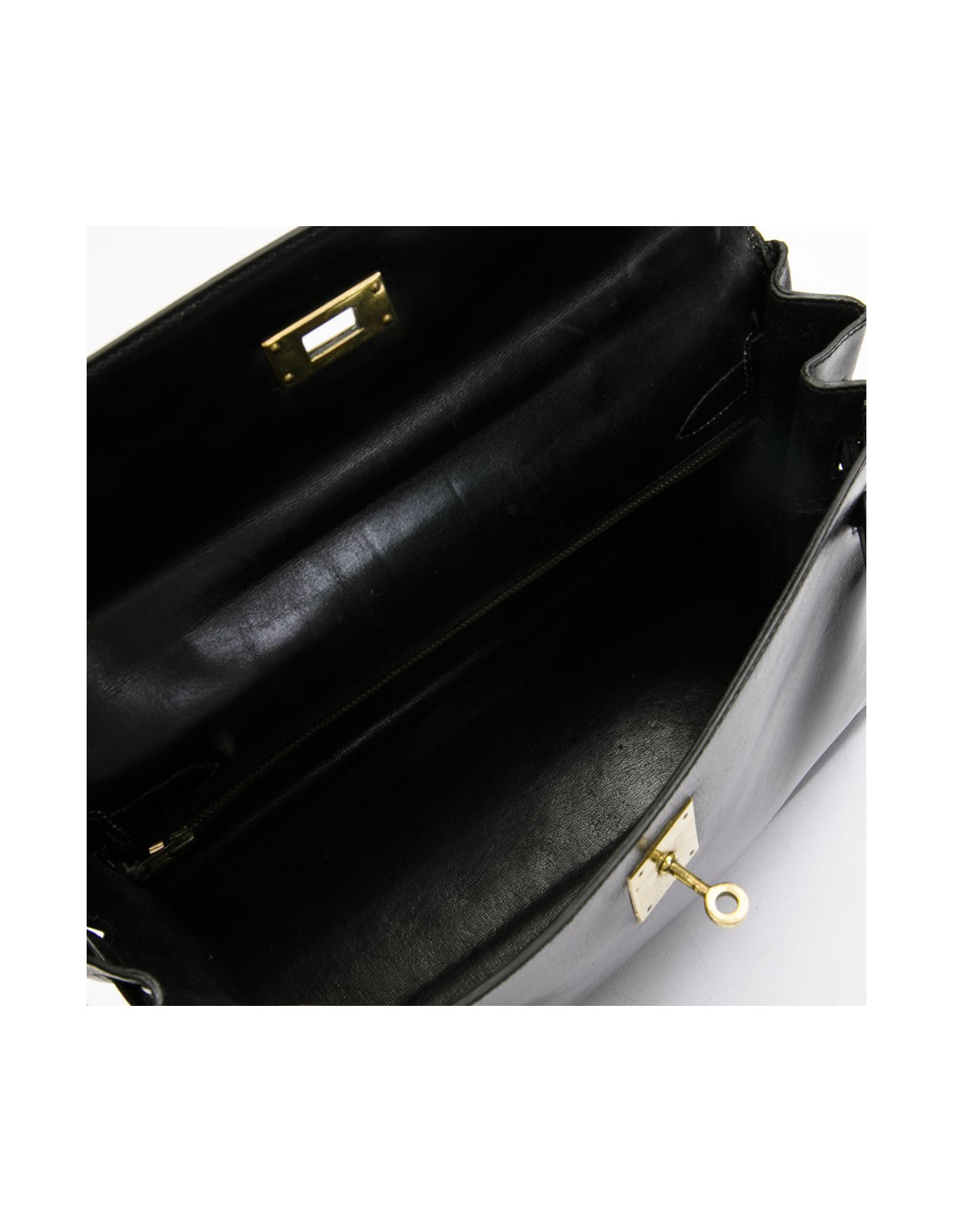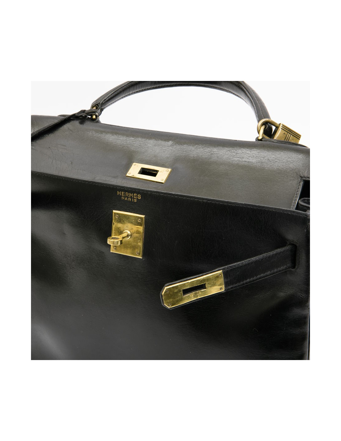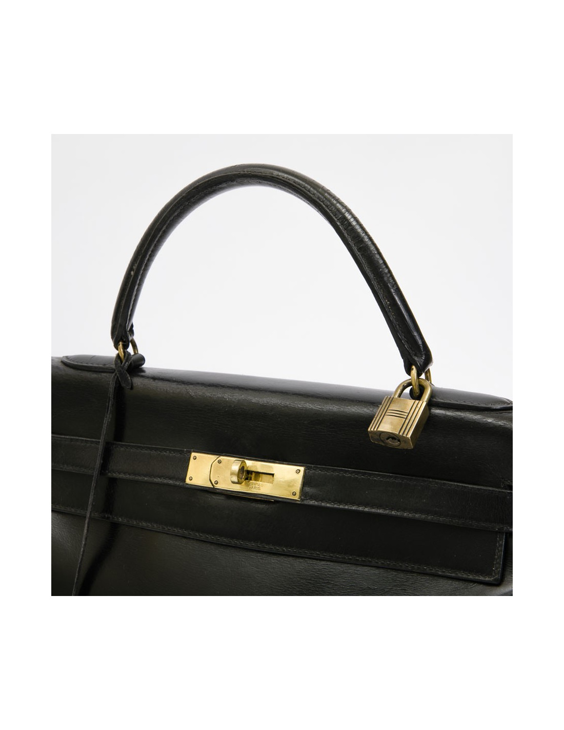 Sac Kelly 32 vintage Hermès en cuir box noir. Bijouterie dorée. Tirette, clochette, clefs et cadenas. Sur l’un des sanglons du sac, la Lettre M est marquée et est toujours visible (assez rare pour un sac si ancien), cette lettre correspond à l'année 1957. L'intérieur est doublé de cuir noir avec trois poches plates dont une grande zippée. Ce sac se porte à la main, mais on peut tout à fait y ajouter une bandoulière (soit Hermès, soit d’une autre marque), nous disposons de quelques modèles en magasin que nous vous offrirons avec plaisir.