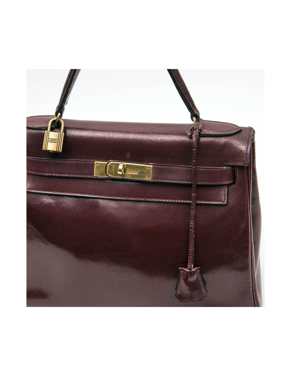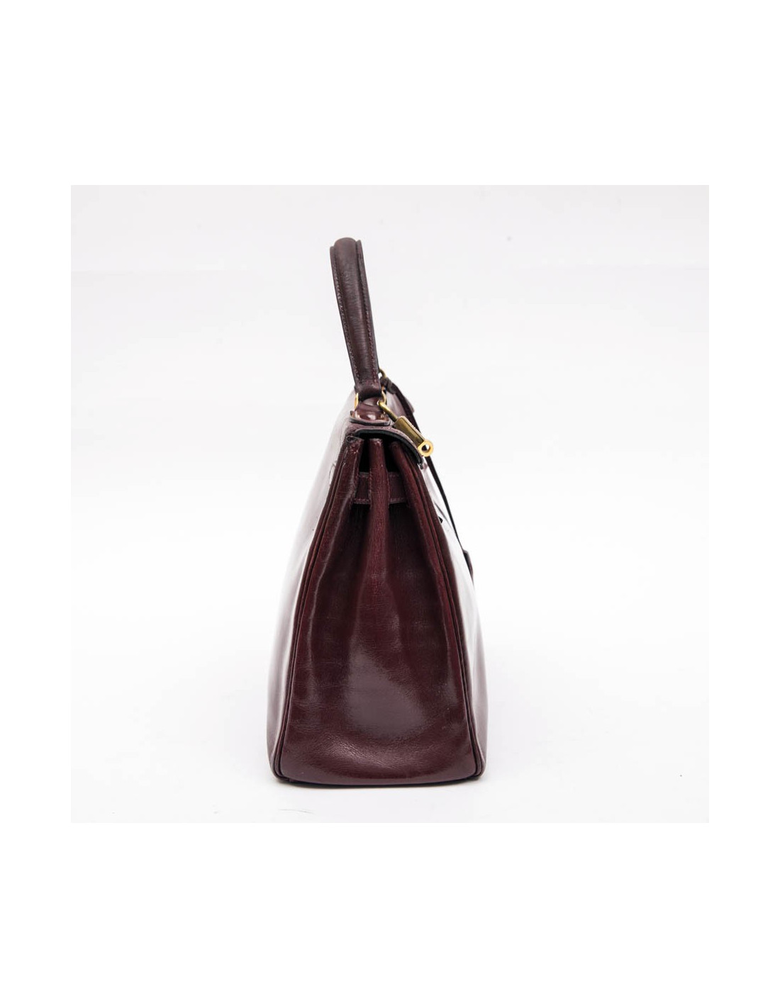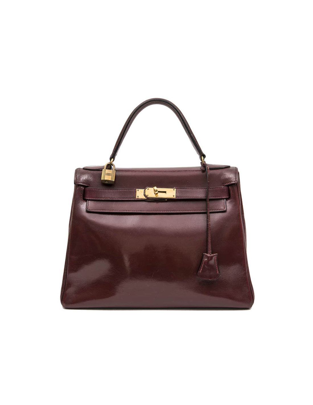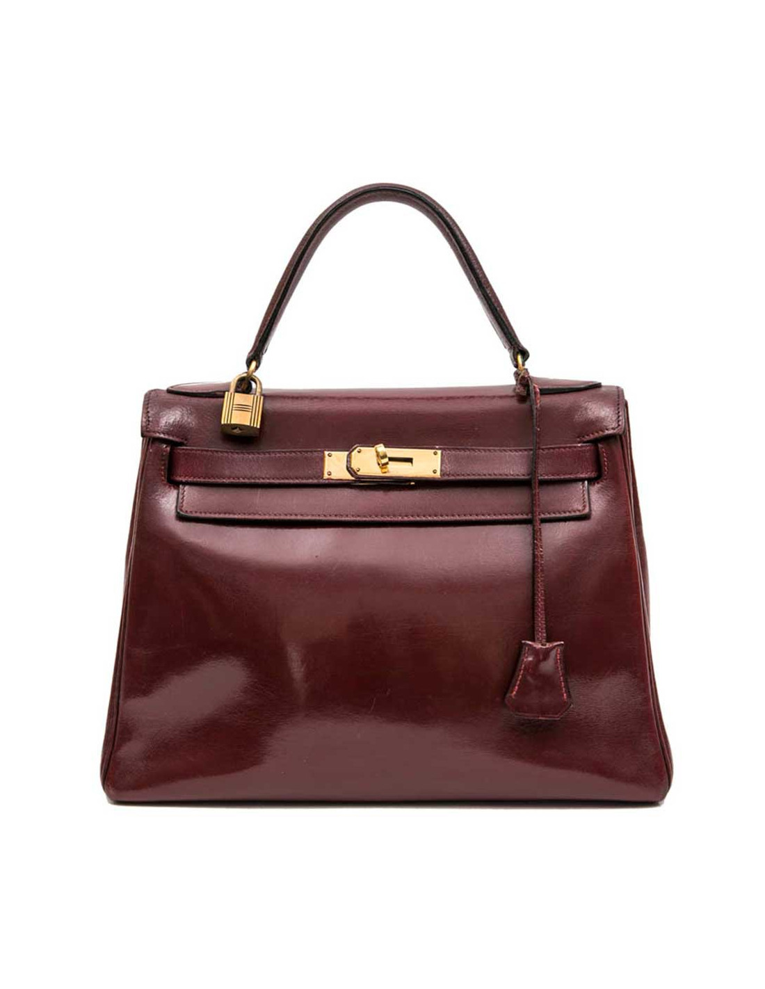 Kelly 28 de la Maison Hermès, vintage en cuir box rouge H (bordeaux). L'accastillage est en laiton doré avec micro rayures. La doublure est en cuir box de même couleur avec 3 poches dont une avec fermeture à glissière. Il a son cadenas, clefs, tirette et clochette. Voir photos, à l'extrémité, sous le rabat, petite déchirure. Lettre B dans un cercle (1972)