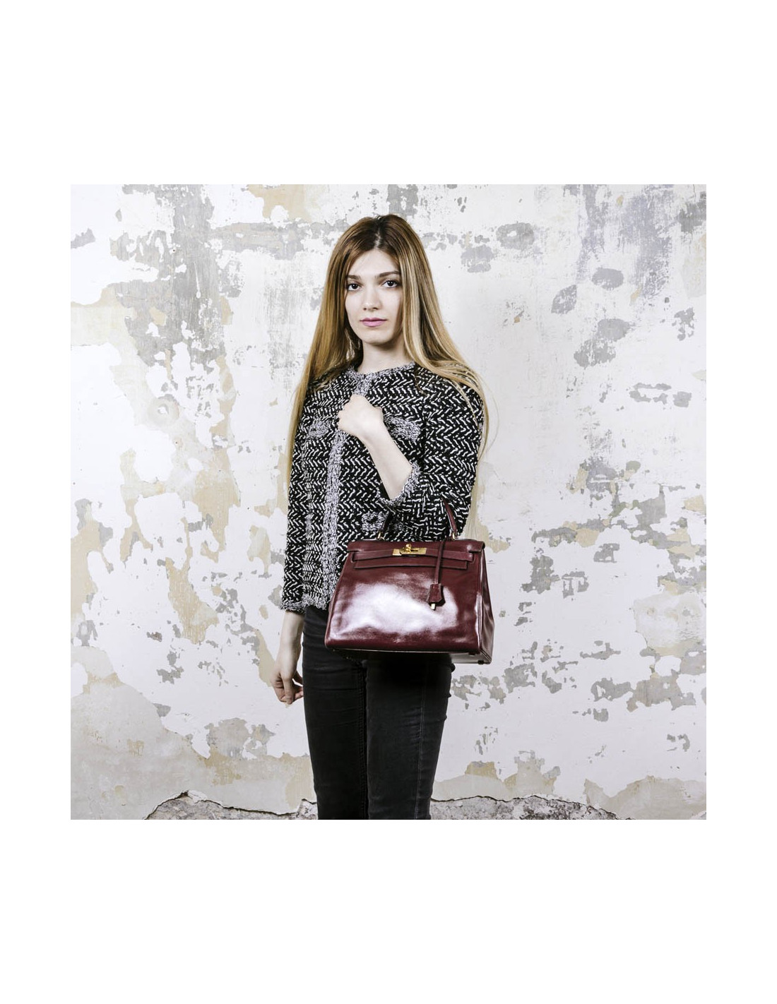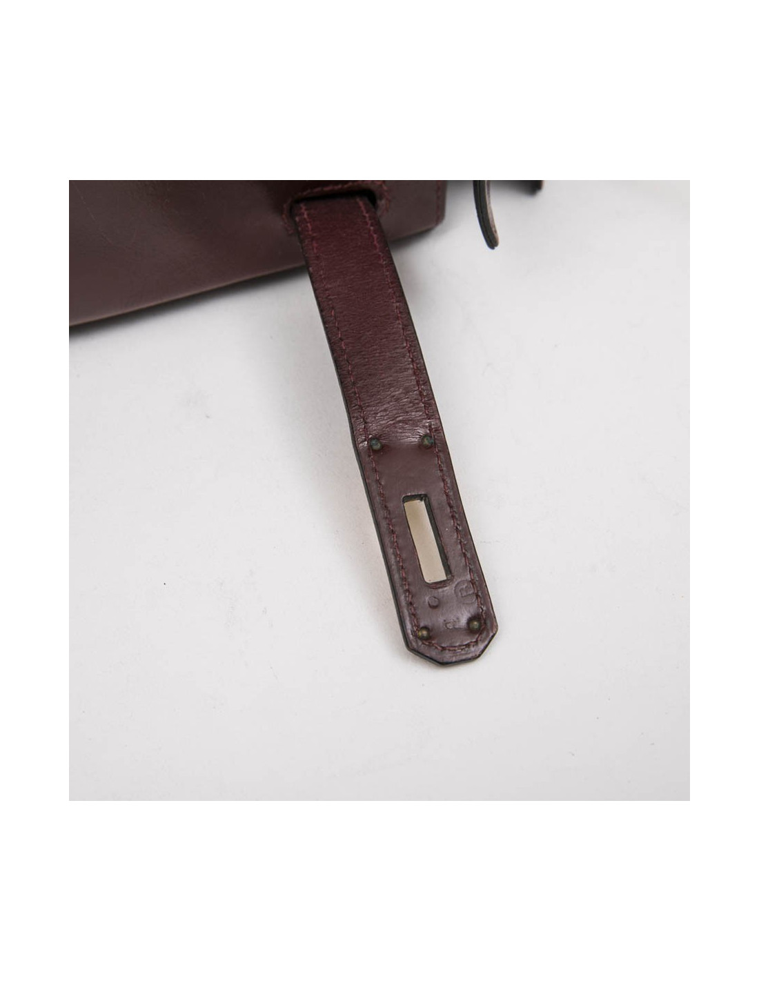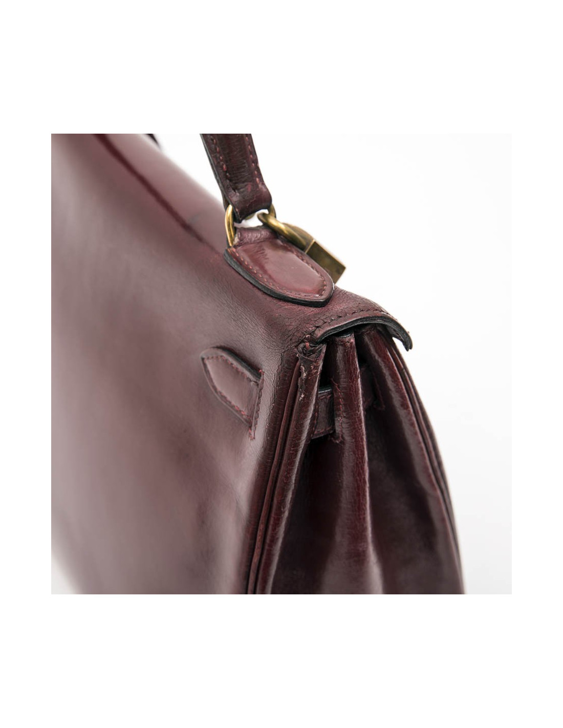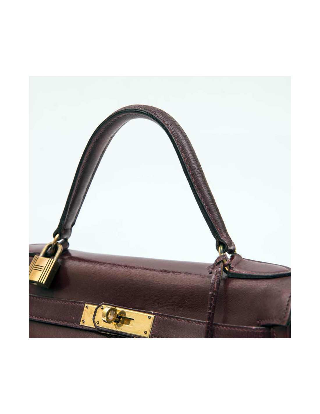 Kelly 28 de la Maison Hermès, vintage en cuir box rouge H (bordeaux). L'accastillage est en laiton doré avec micro rayures. La doublure est en cuir box de même couleur avec 3 poches dont une avec fermeture à glissière. Il a son cadenas, clefs, tirette et clochette. Voir photos, à l'extrémité, sous le rabat, petite déchirure. Lettre B dans un cercle (1972)