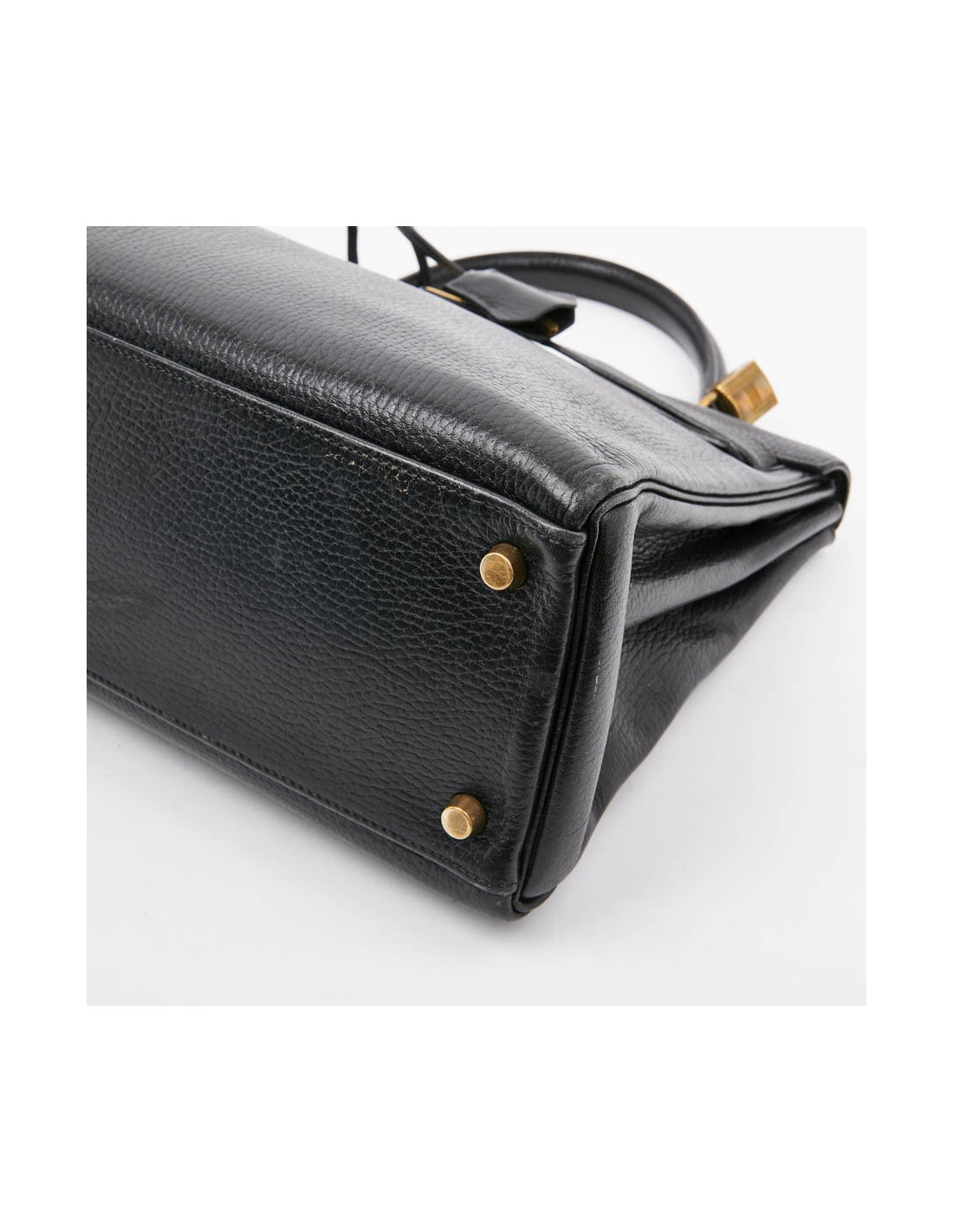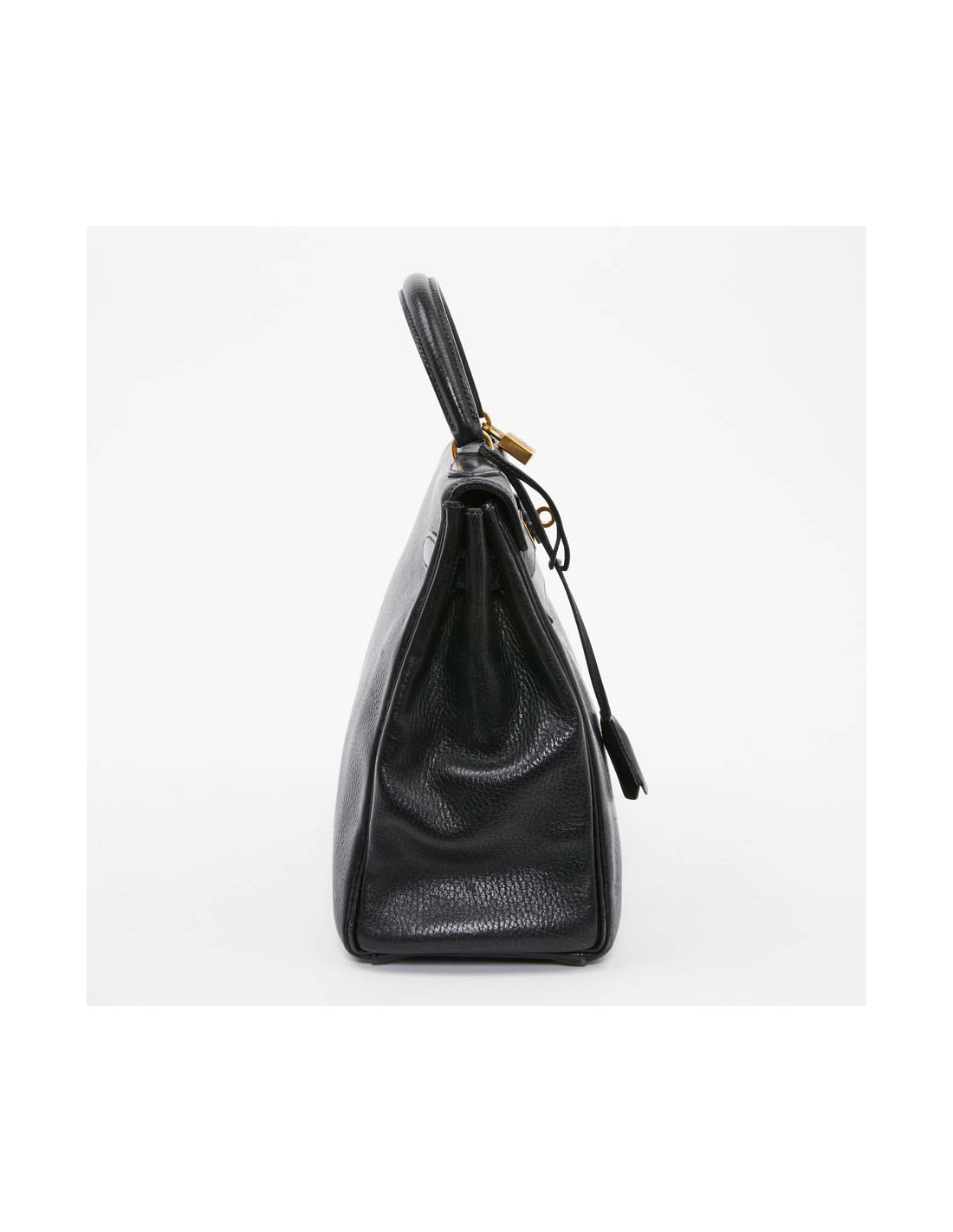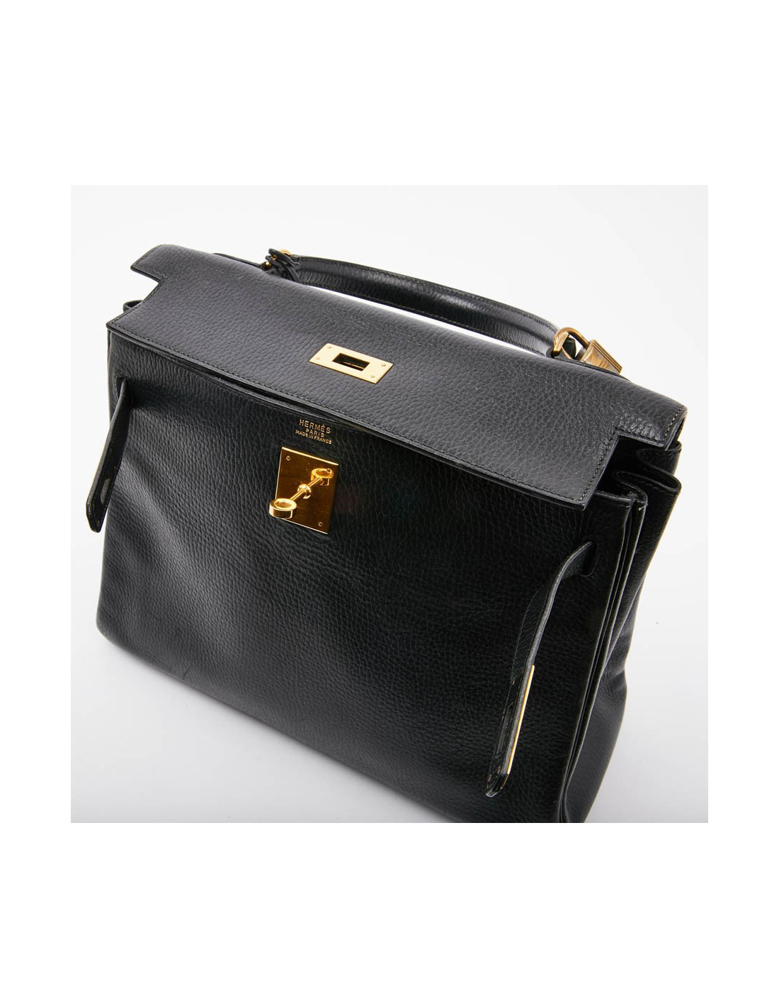 Modèle phare de la maison Hermès, ce sac est en cuir grainé noir avec une surpiqûre identique. Il se porte à la main. La bijouterie est en métal doré (micro rayures). Il a sa tirette, clochette, clés (deux) et cadenas. Il est marqué "Hermès Paris". L'intérieur est en cuir noir avec trois poches plates (deux plates et une zippée). Il est par endroits marqué avec légère patine au niveau des coins.