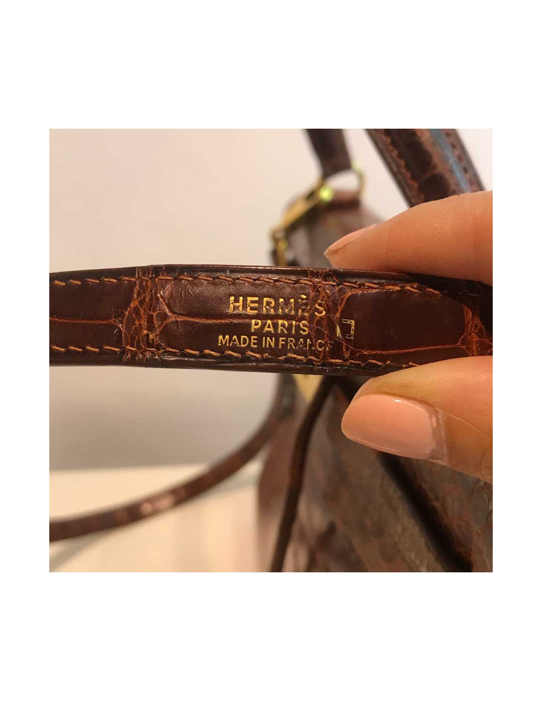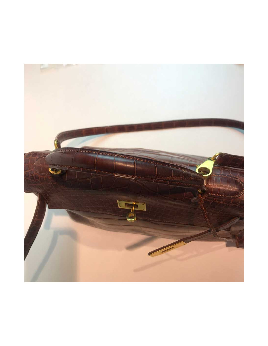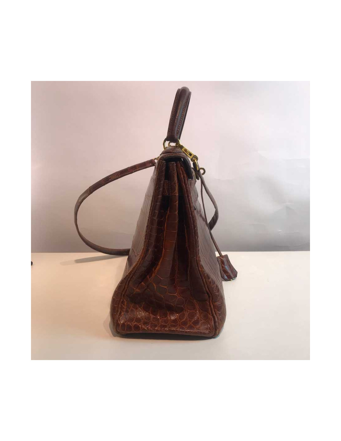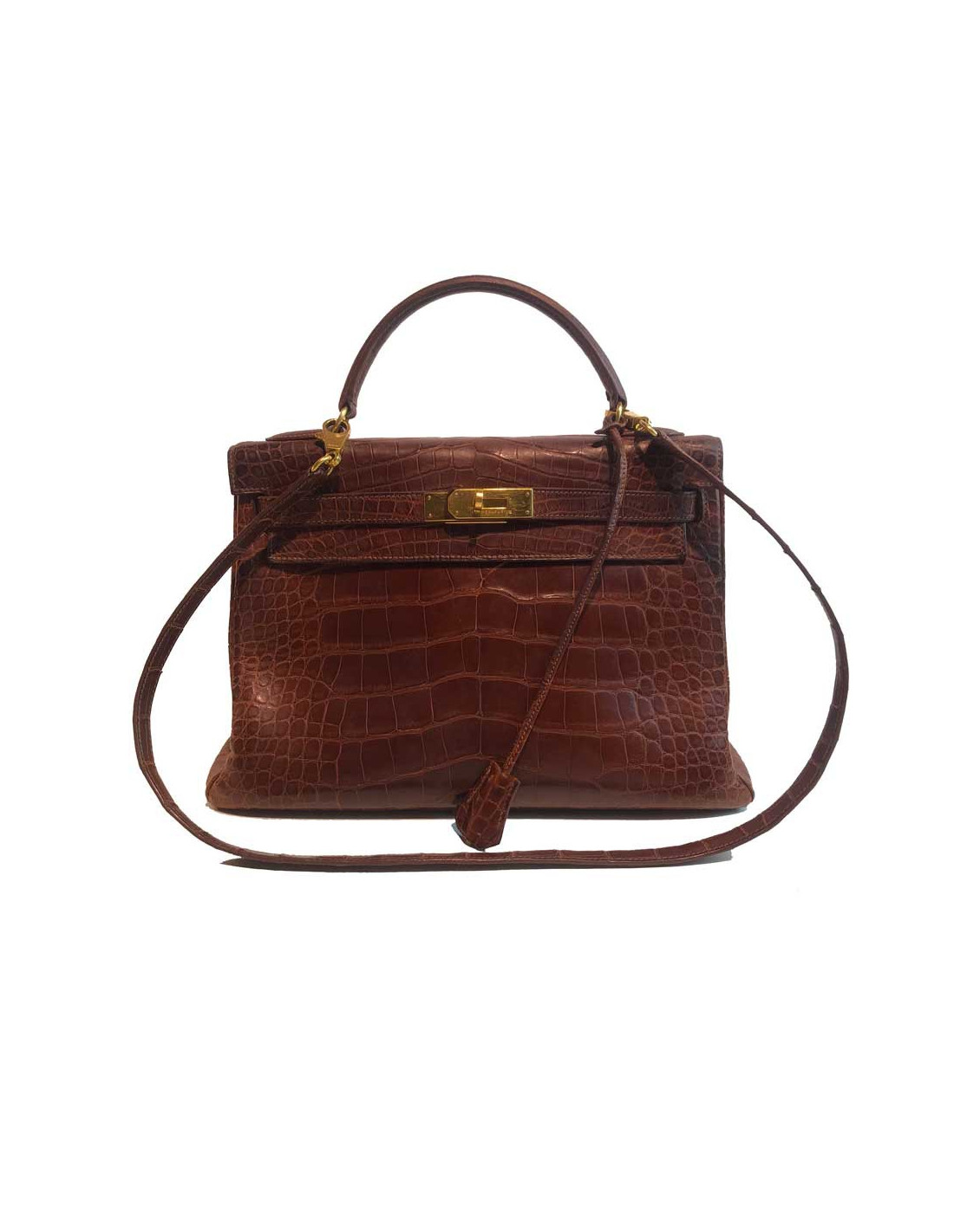 Ravissant kelly de la Maison Hermès en taille 32 cm, il est en alligator mat marron et sa bijouterie est en métal doré à l’or fin. Il possède sa bandoulière mesurant 90 cm, plus pour un porté épaule que cross body. Ce sac kelly a sa clochette en alligator comportant les deux clés mais en revanche plus de cadenas (il est assez aisé d’en acheter un chez Hermès).
