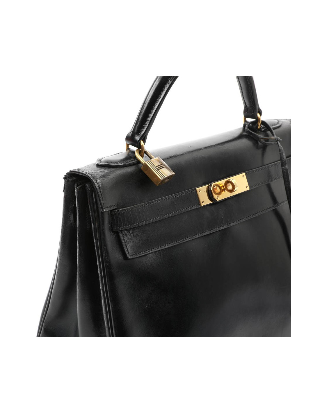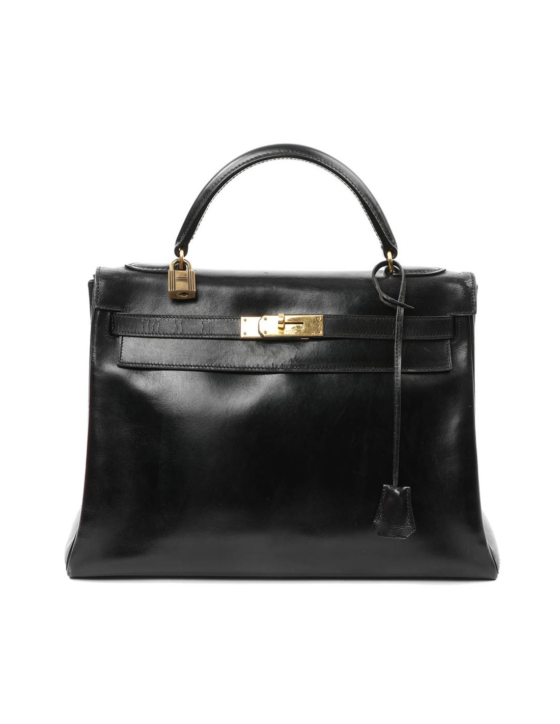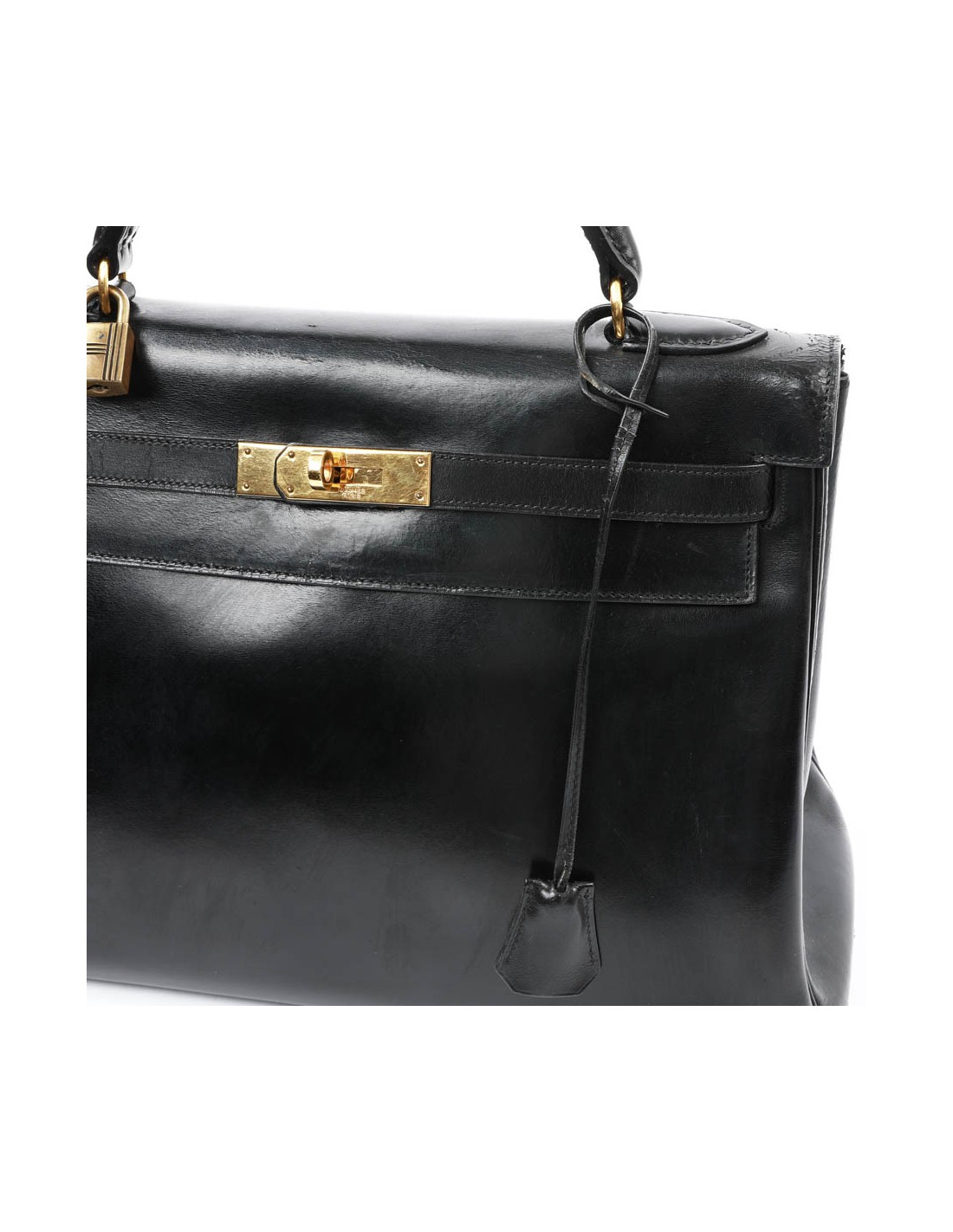 On ne décrit plus les sacs Hermès. Voici un Kelly en taille 32 et en cuir de veau noir Box. Il est doublé en cuir noir avec 3 poches dont une zippée. Clochette, tirette, clefs, cadenas. L'anse a été changée. La bijouterie est en plaqué or. ll n'a pas de bandoulière, mais vous pouvez vous en procurer une chez Hermès en présentant le sac.