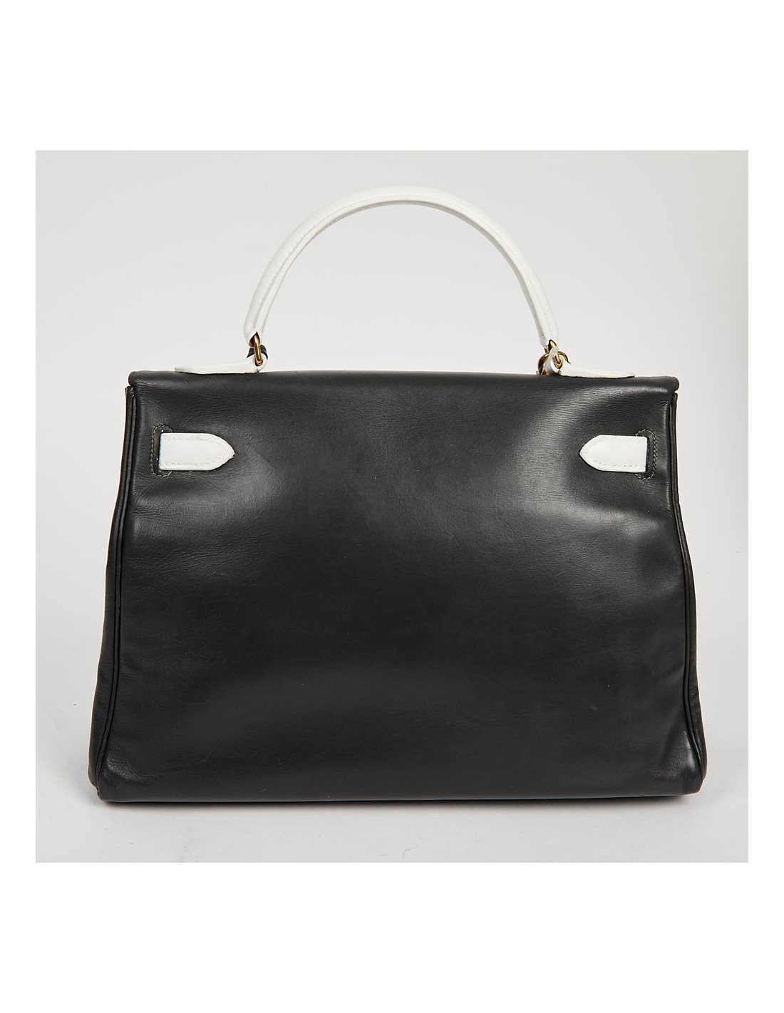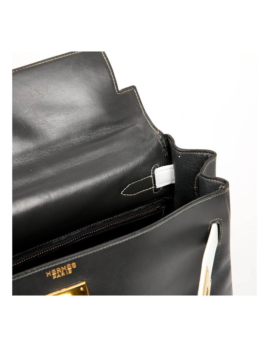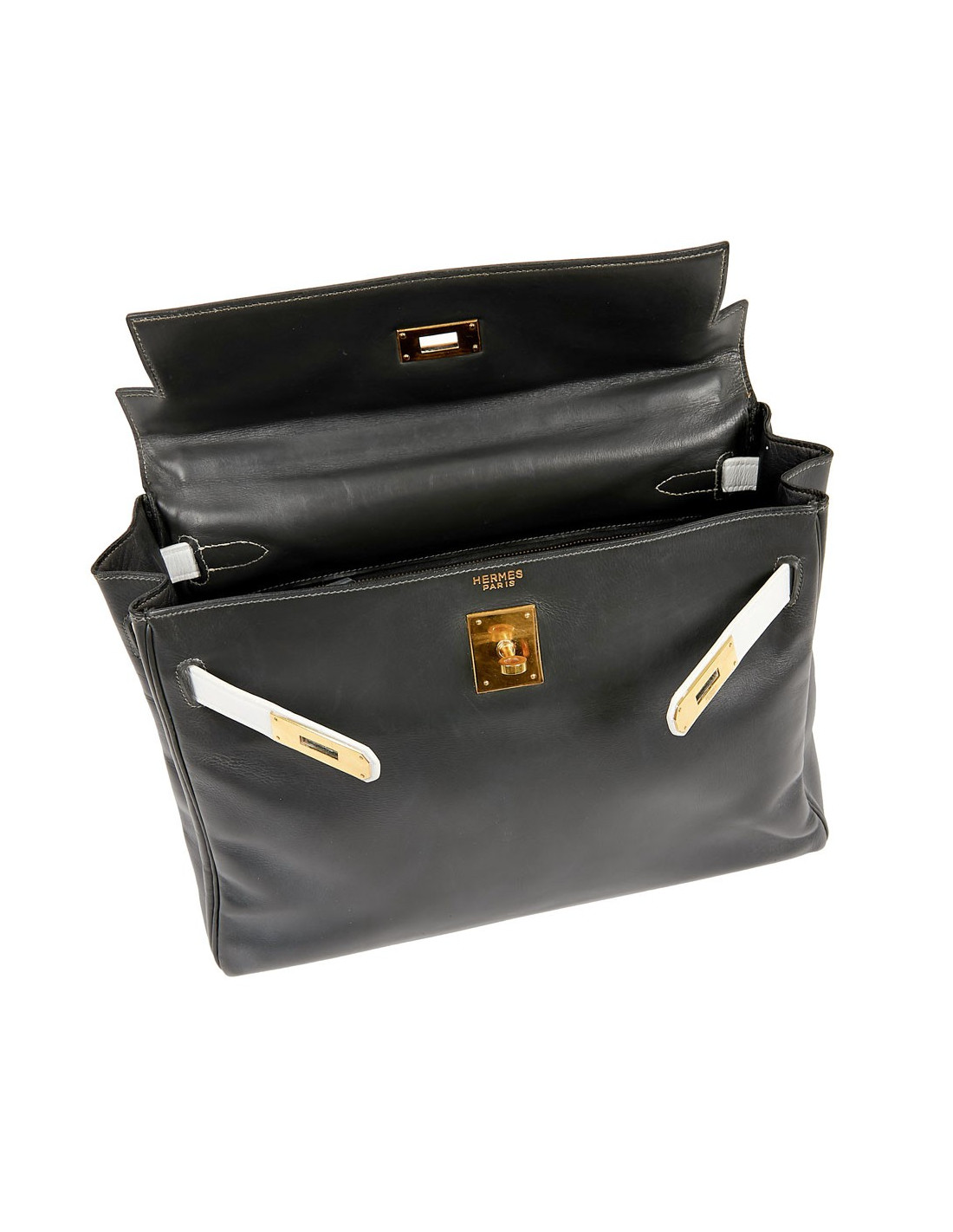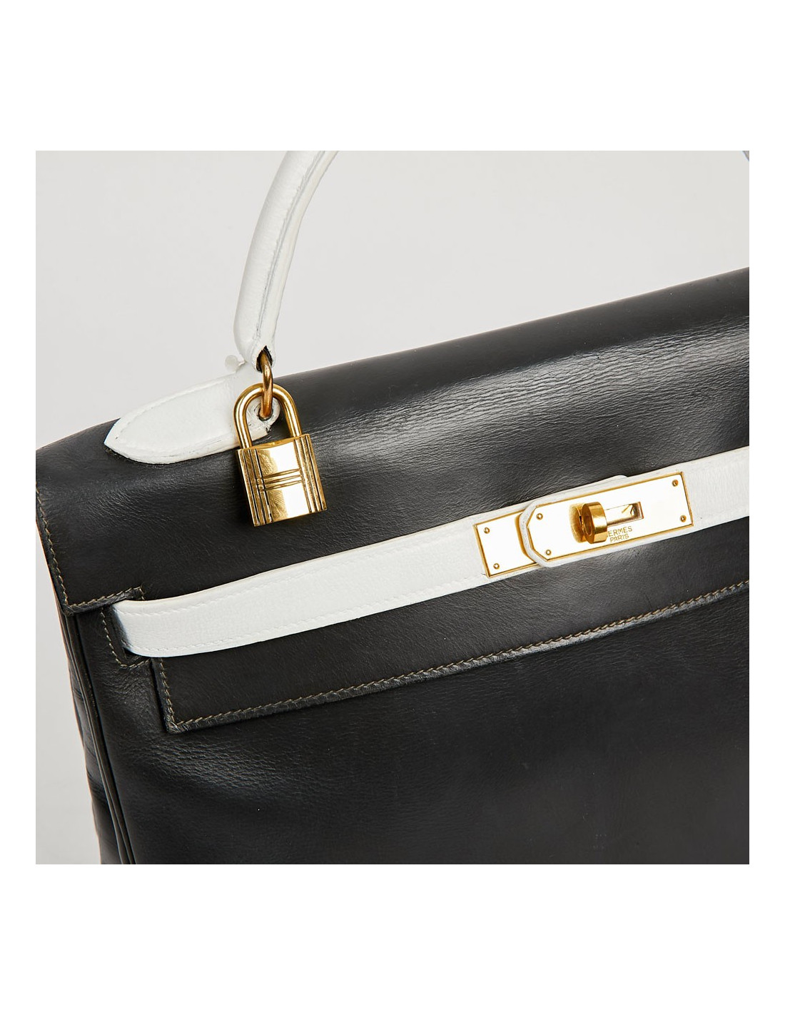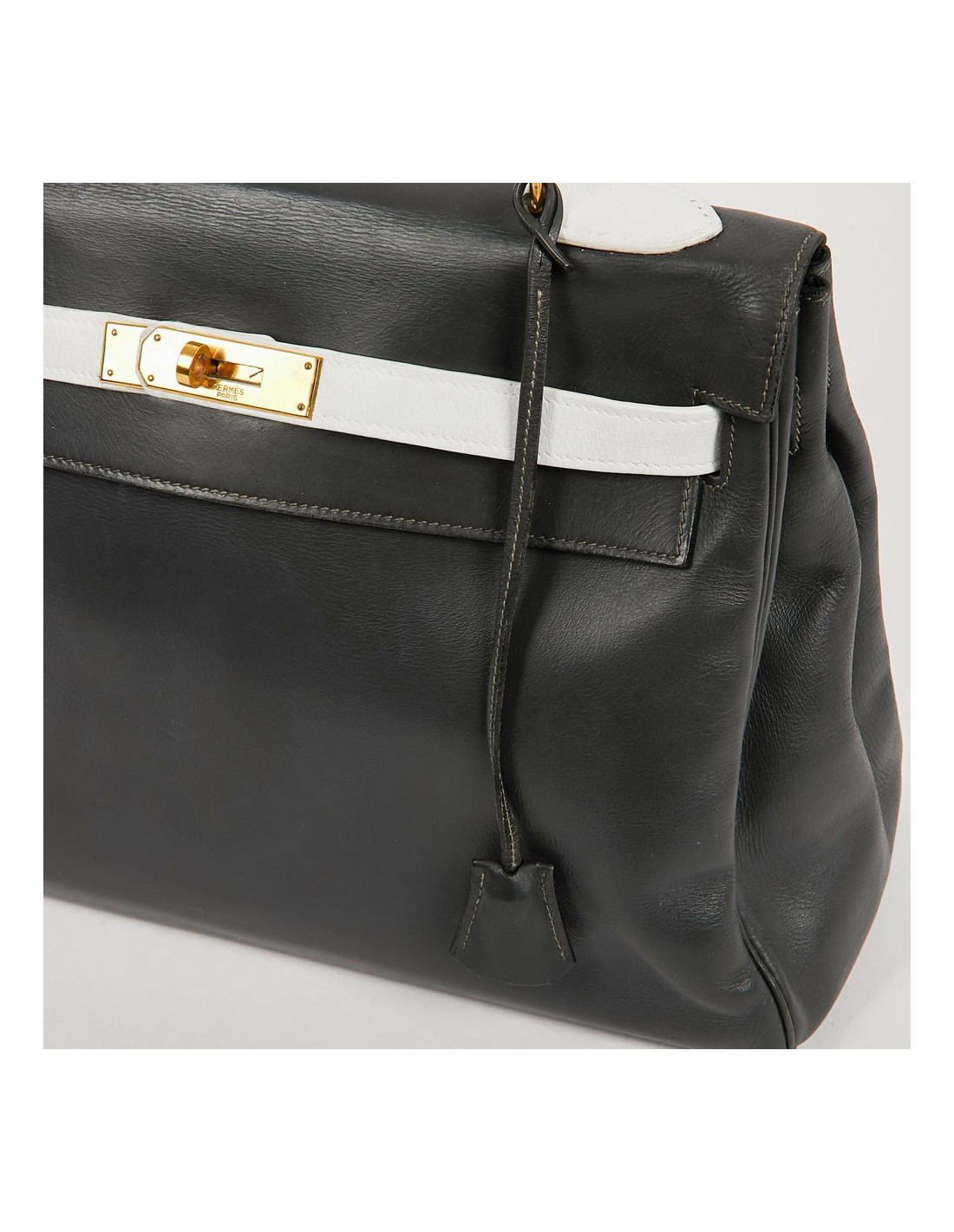 Sac iconique de la Maison Hermès, en cuir box gris, sanglons et poignée blancs. Il mesure 32 cm. Nous avons la valise assortie au Kelly, sous la référence 29943. Ils ont été tous les deux au Spa (pas chez Hermès). La poignée et les coins ne sont pas abimés.