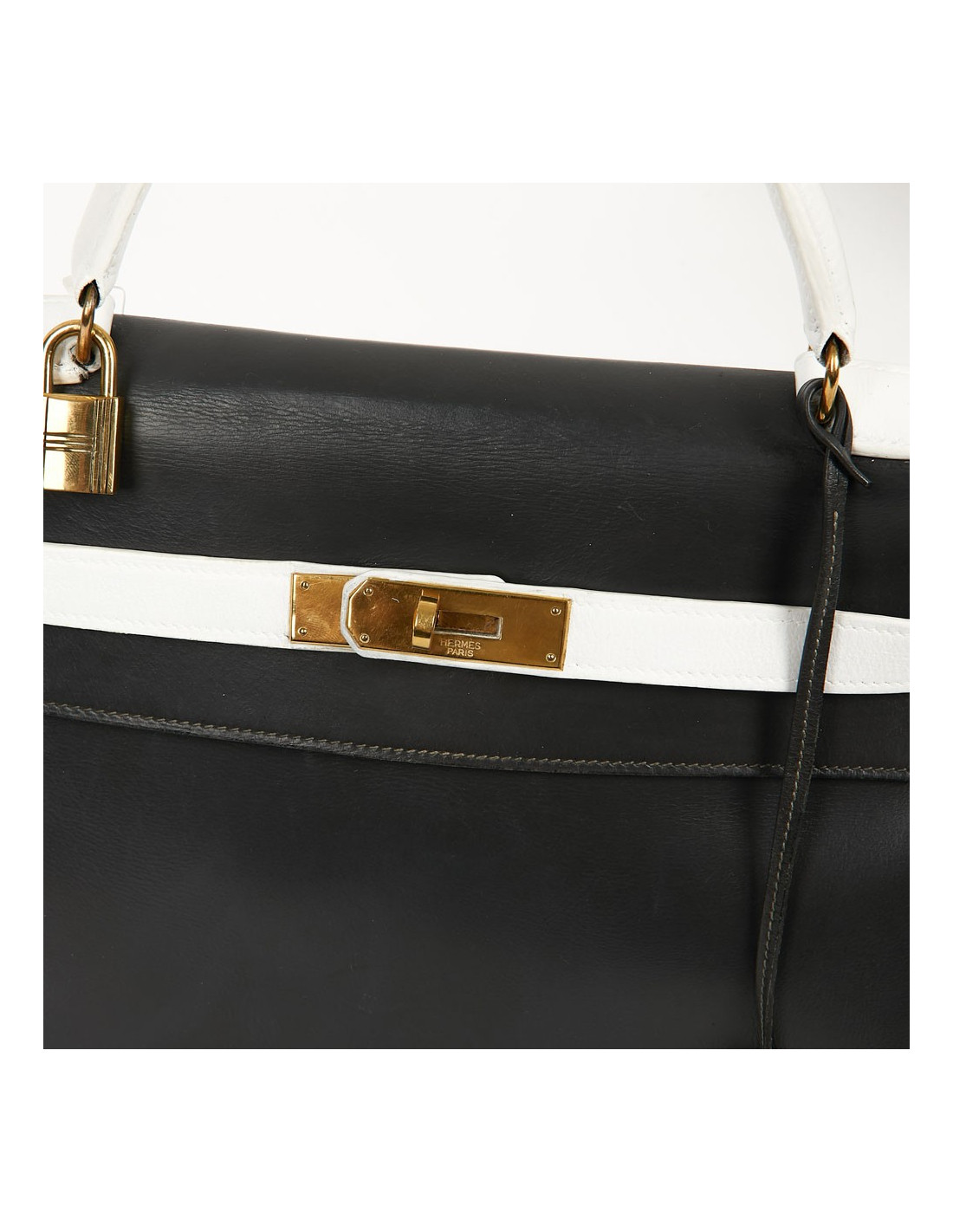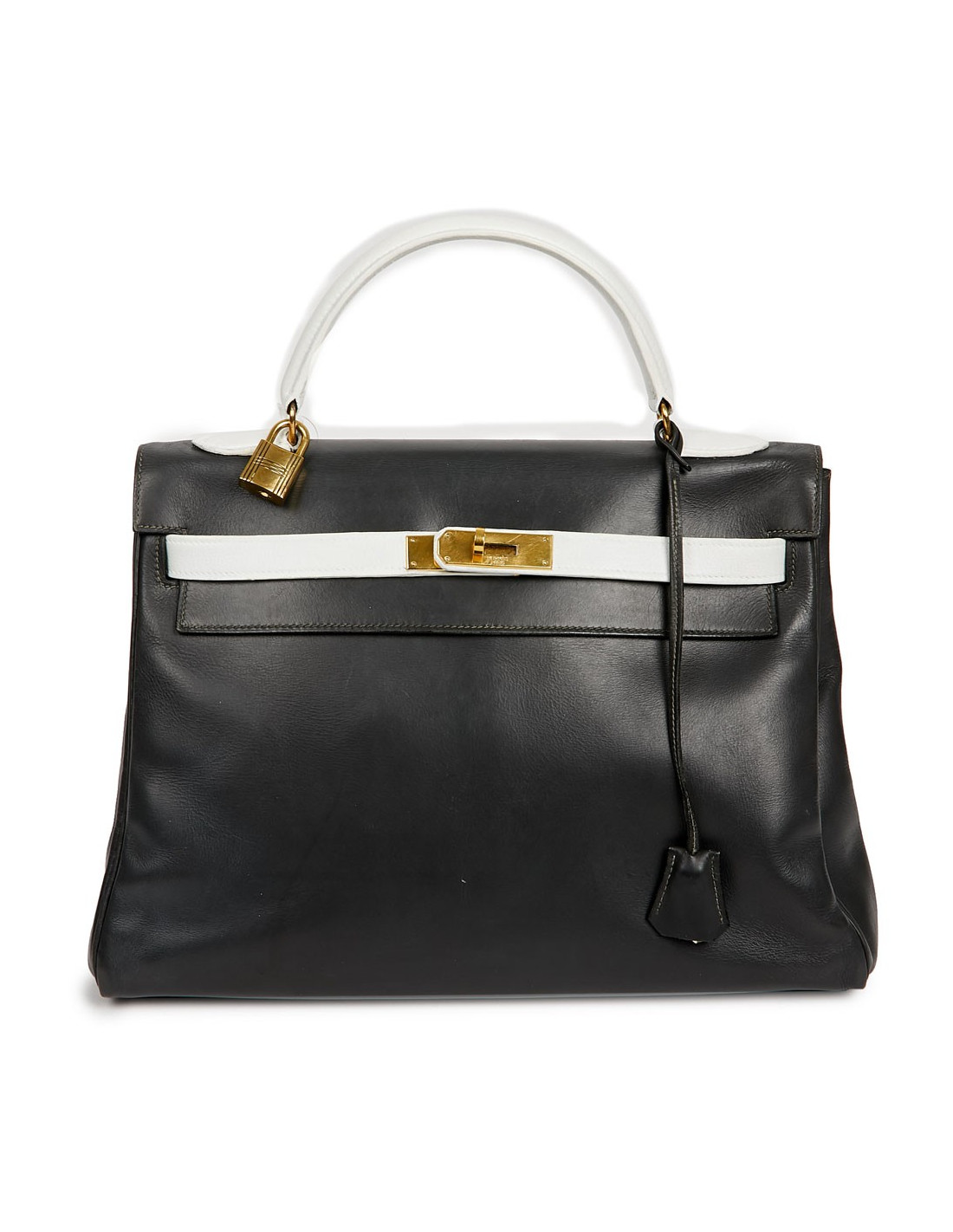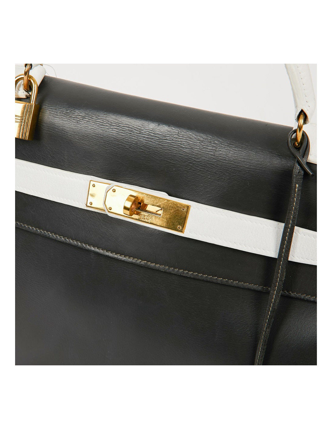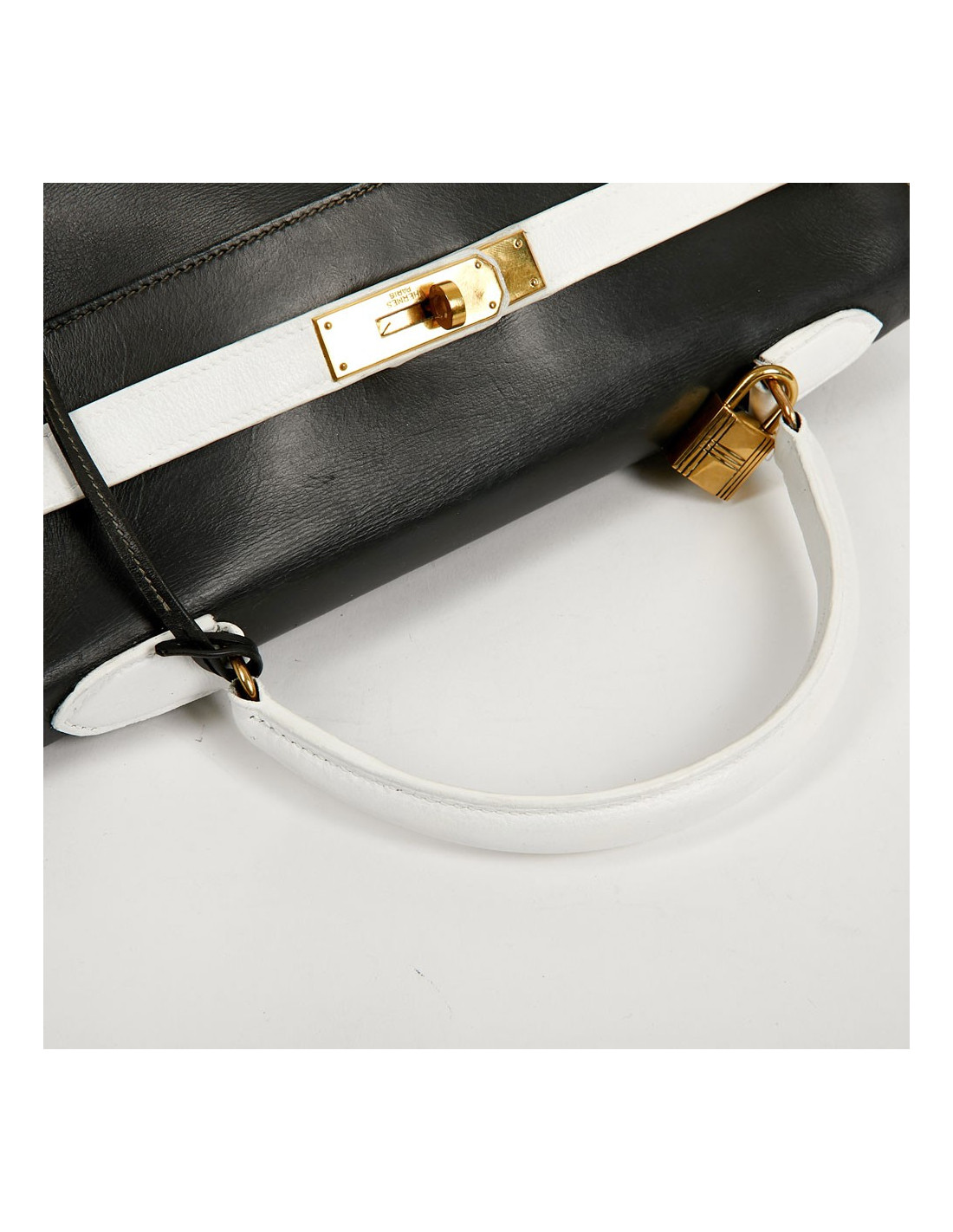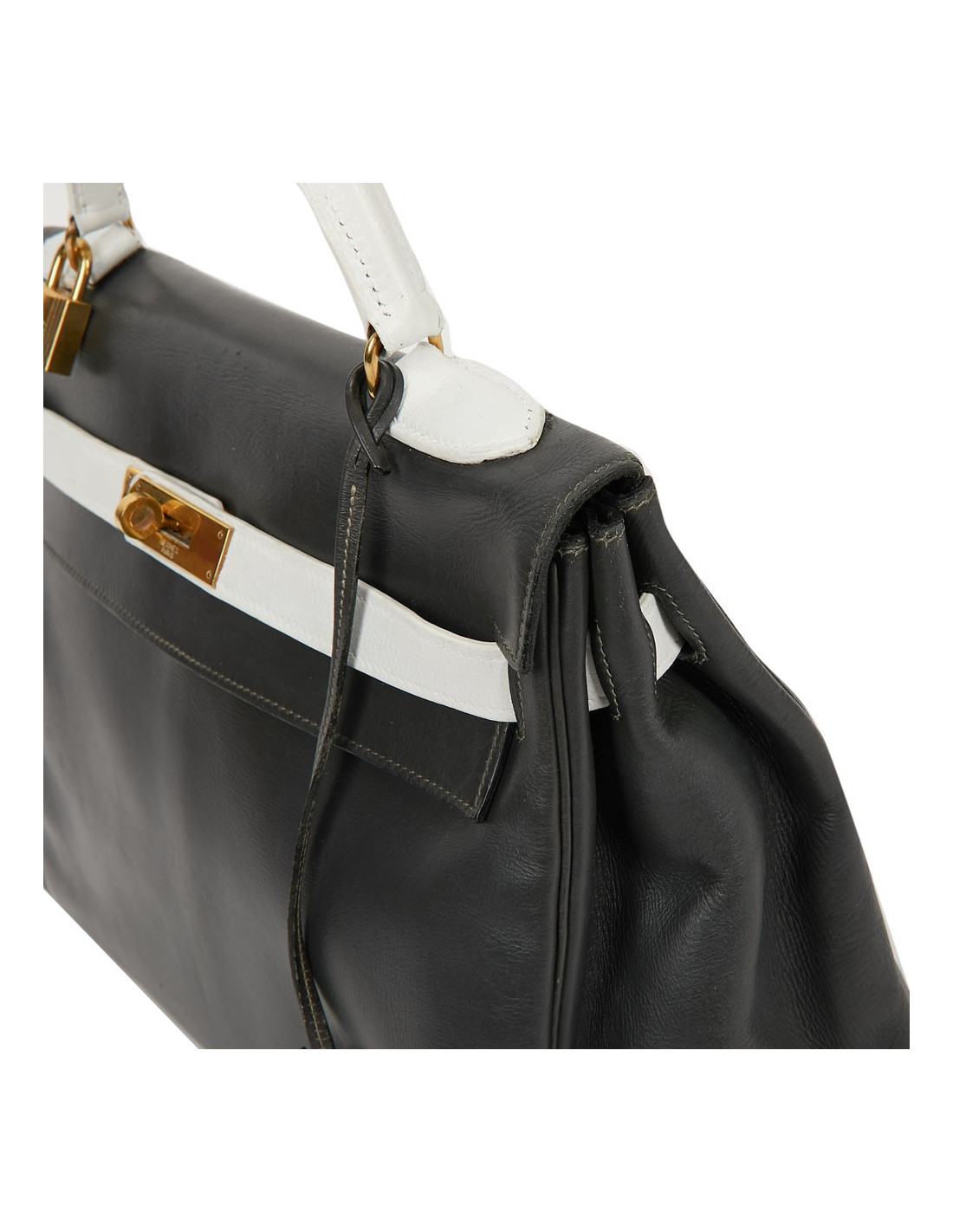 Sac iconique de la Maison Hermès, en cuir box gris, sanglons et poignée blancs. Il mesure 32 cm. Nous avons la valise assortie au Kelly, sous la référence 29943. Ils ont été tous les deux au Spa (pas chez Hermès). La poignée et les coins ne sont pas abimés.