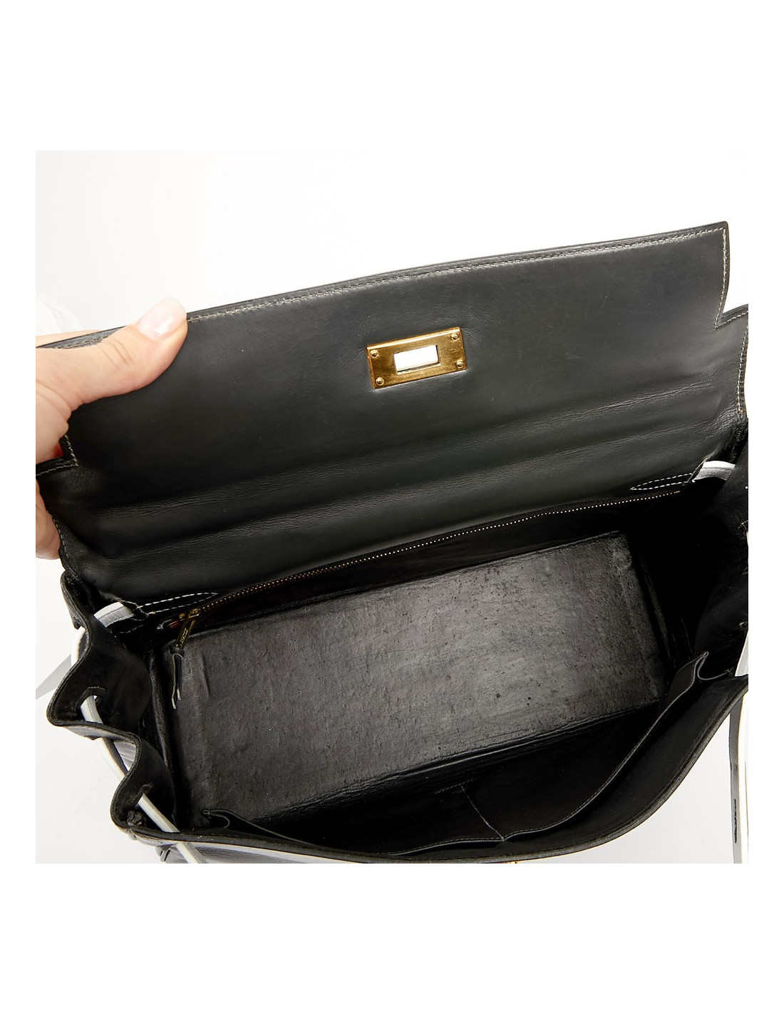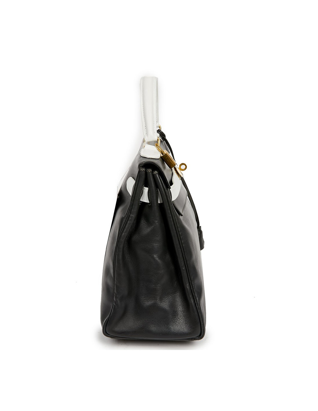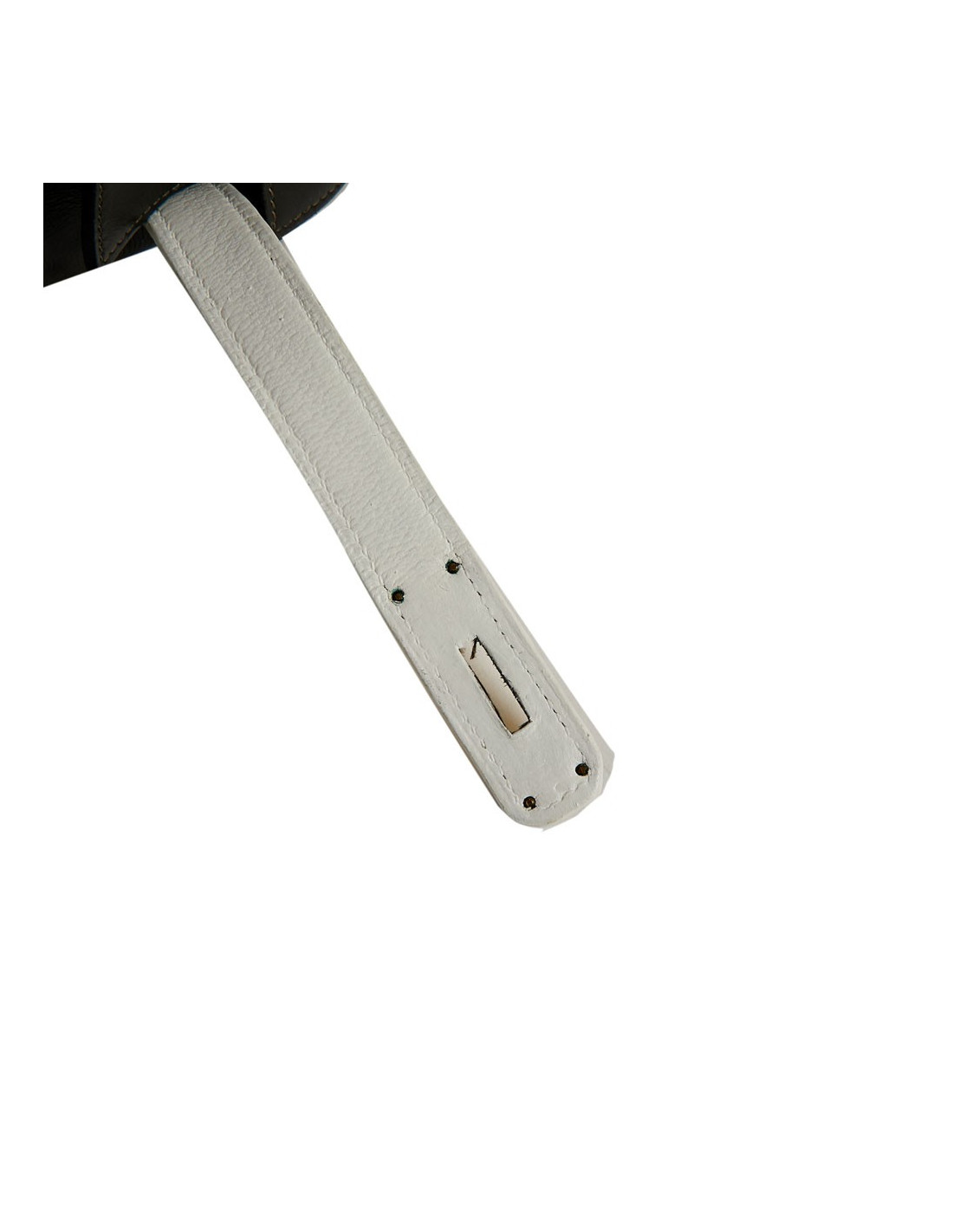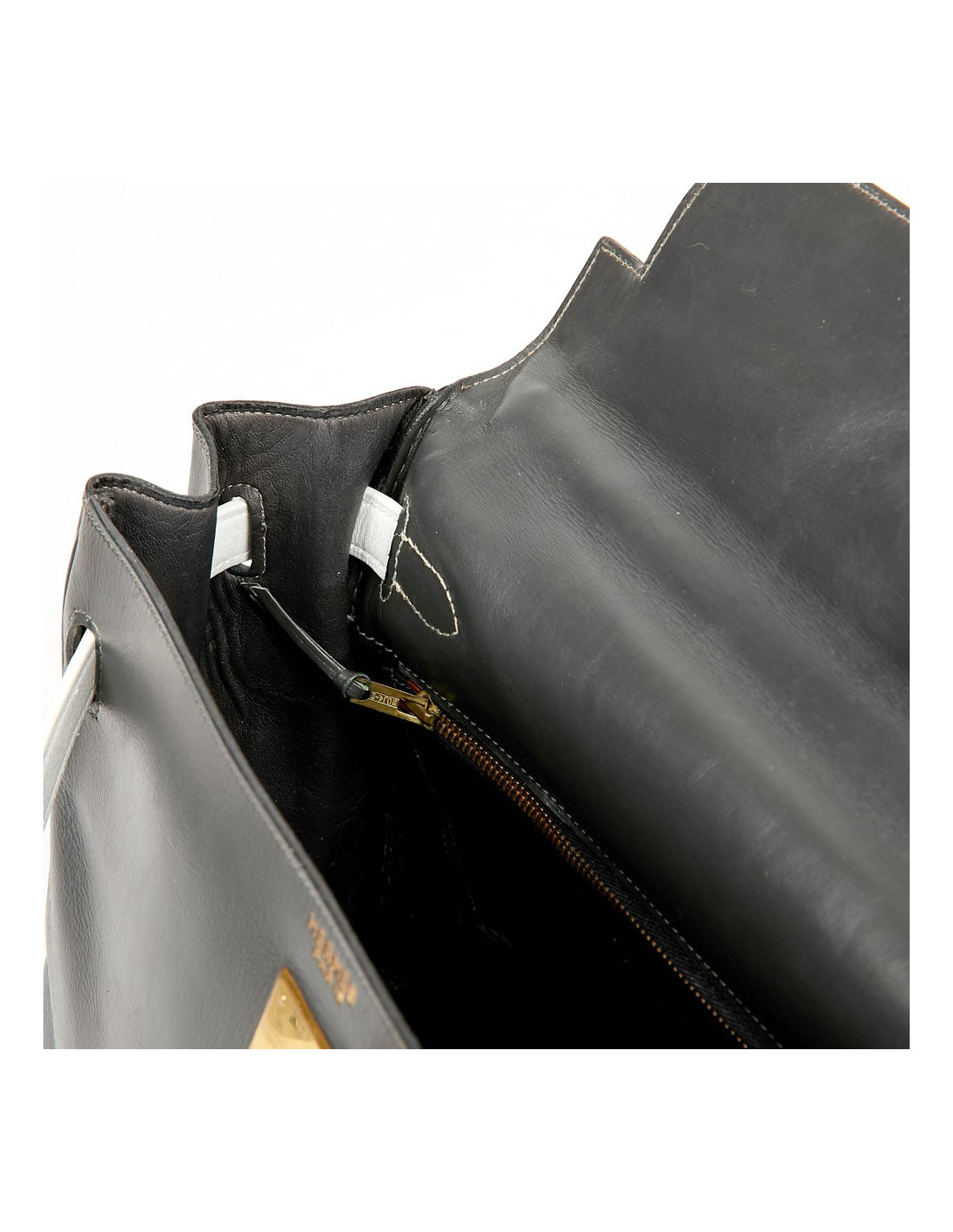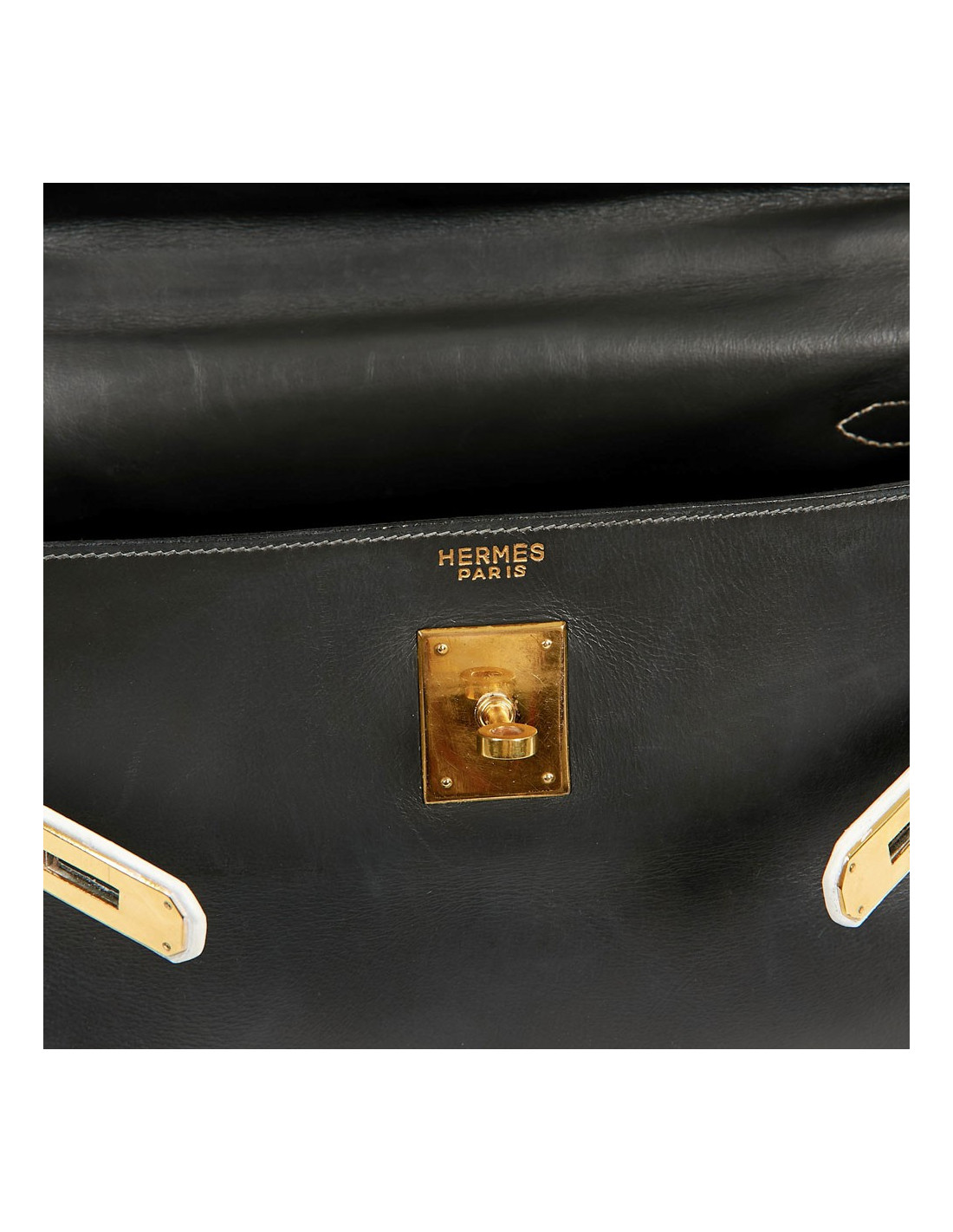 Sac iconique de la Maison Hermès, en cuir box gris, sanglons et poignée blancs. Il mesure 32 cm. Nous avons la valise assortie au Kelly, sous la référence 29943. Ils ont été tous les deux au Spa (pas chez Hermès). La poignée et les coins ne sont pas abimés.