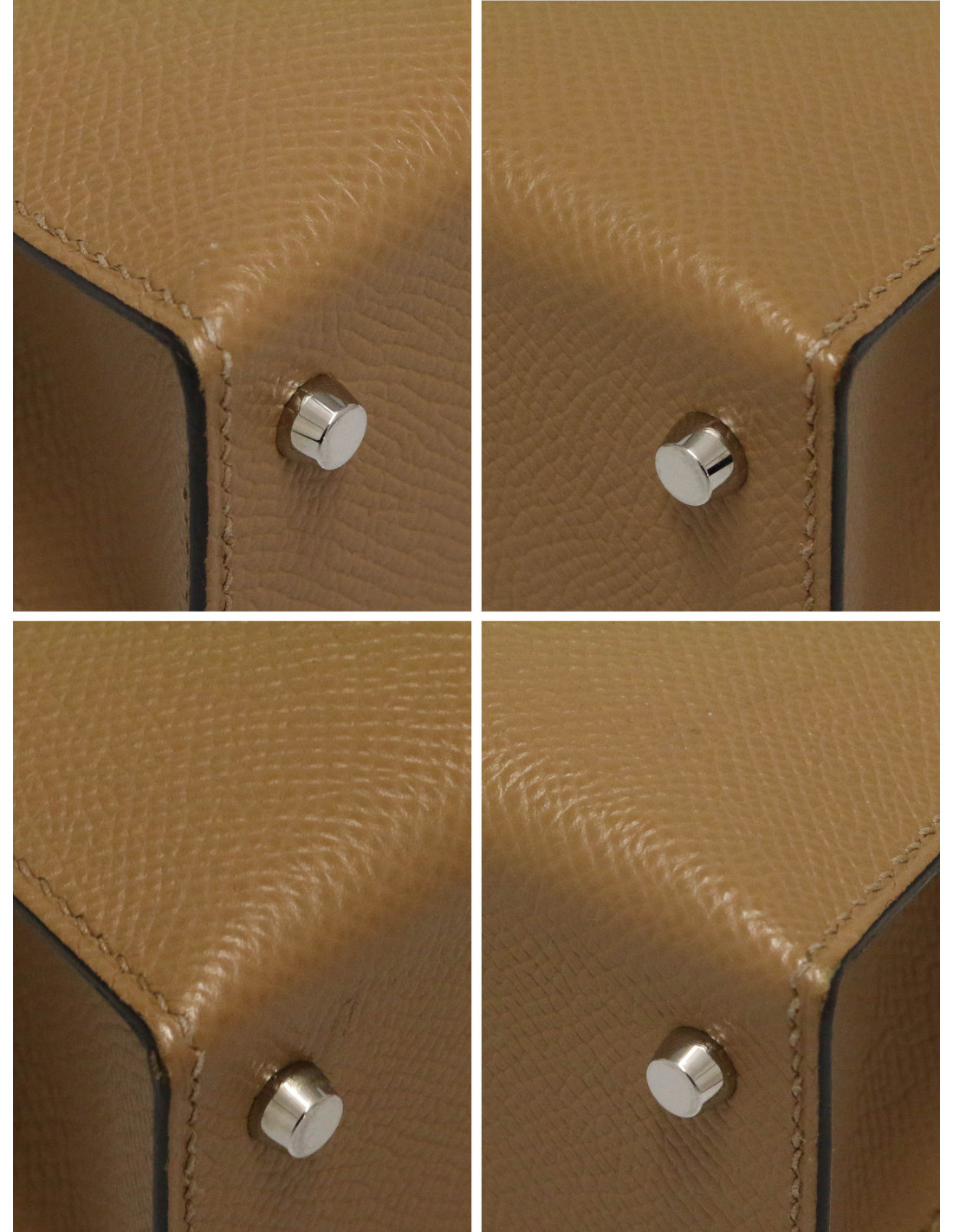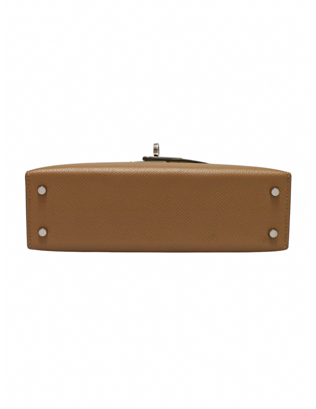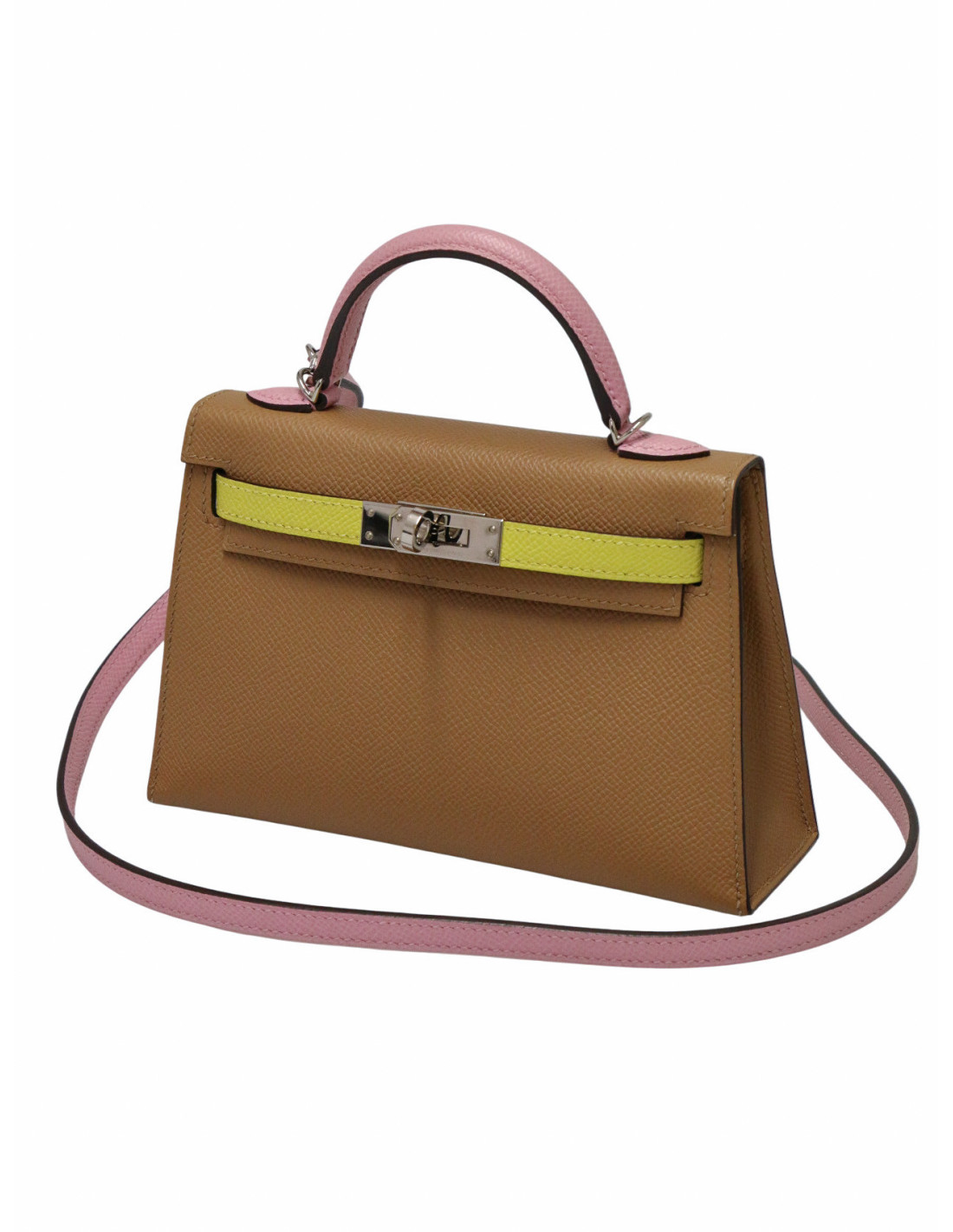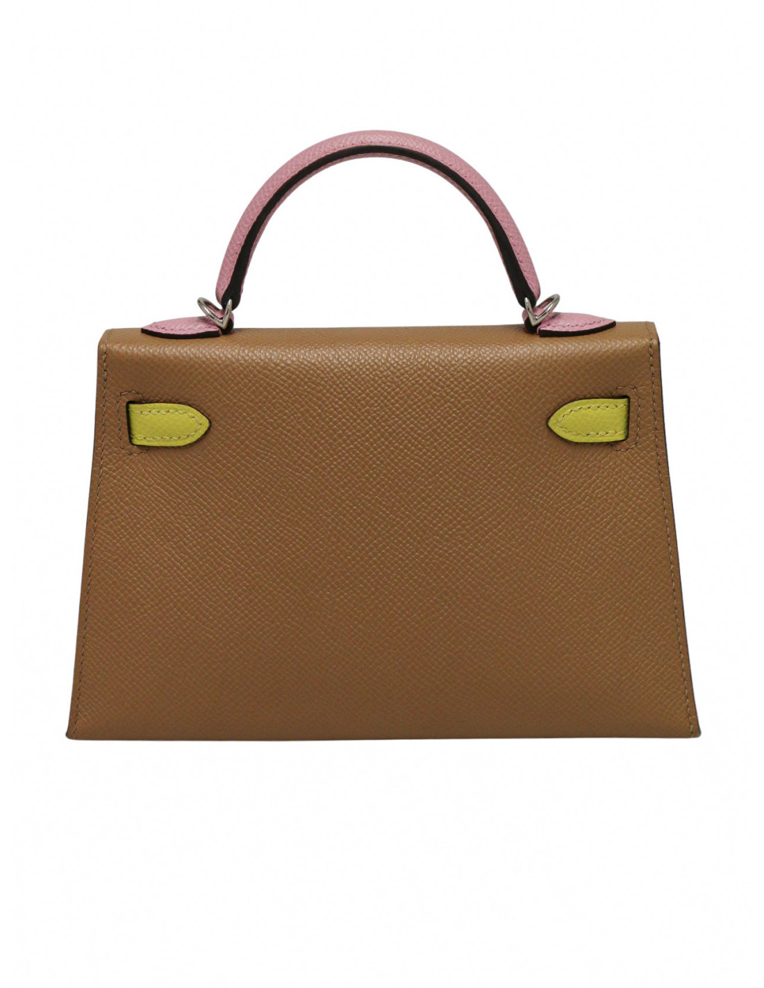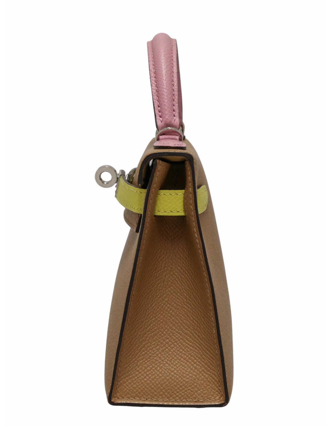 Ce mini Kelly est en cuir de veau grainé Epsom tricolore : chai, mauve sylvestre et lime