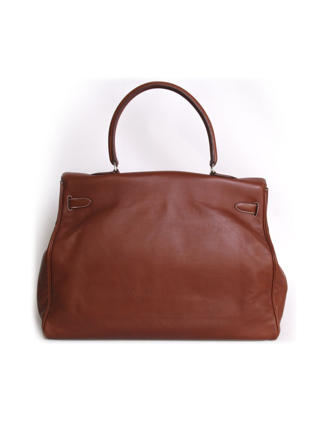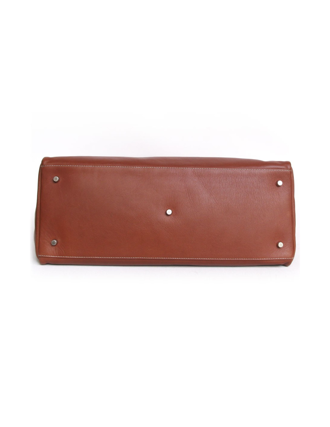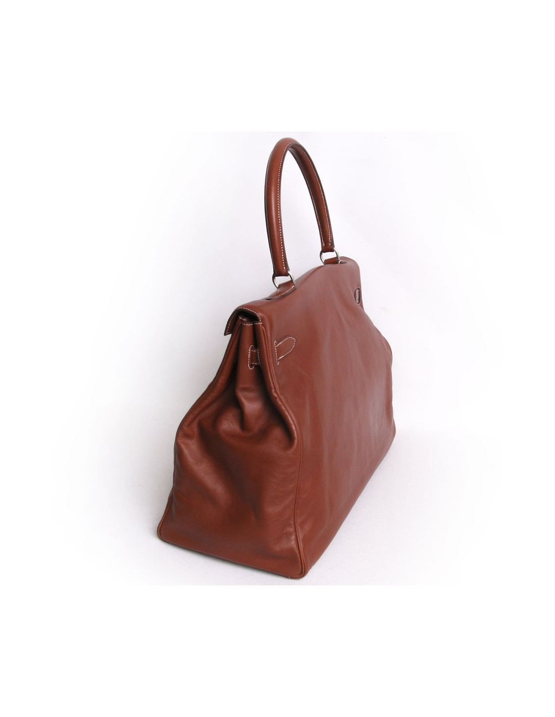 Sac de voyage Hermes kelly "relax", cuir silkim lisse très agréable, couleur fauve et bijouterie en métal argenté. C'est un sac large et souple, intérieur cuir comprenant quatre petites poches et une grande capacité de contenu. L'anse en cuir, rigide et agréable permet au sac d'être porté à l'épaule. Grand classique de la Maison, sobre et intemporel, parfait en bagage cabine ou sac de voyage. Il est en très bon état.