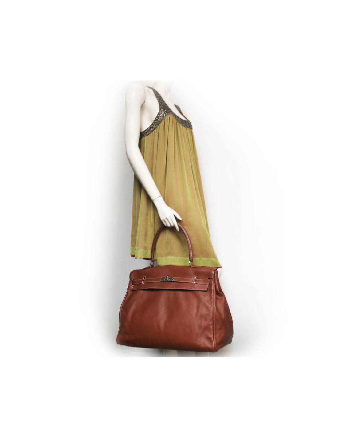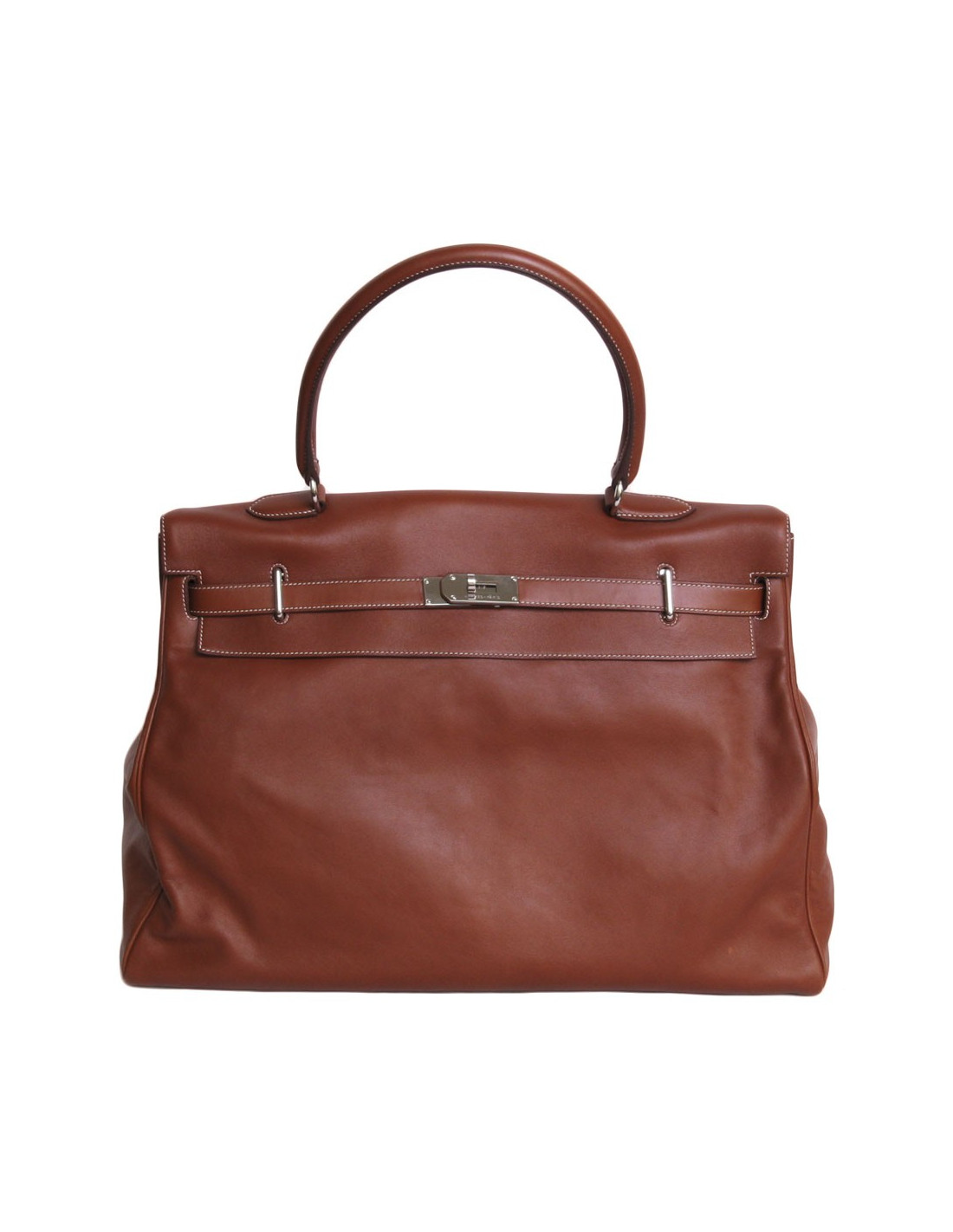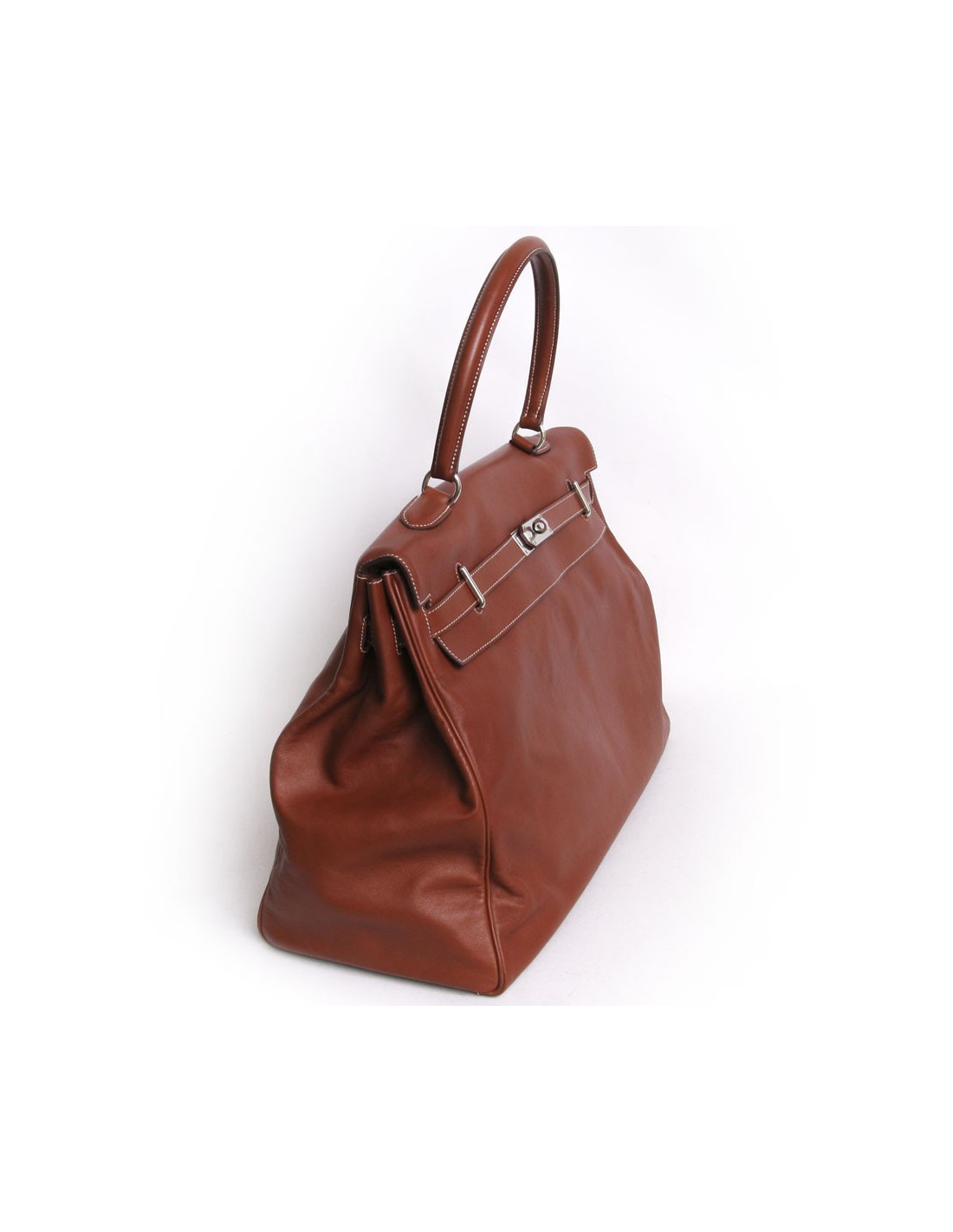 Sac de voyage Hermes kelly "relax", cuir silkim lisse très agréable, couleur fauve et bijouterie en métal argenté. C'est un sac large et souple, intérieur cuir comprenant quatre petites poches et une grande capacité de contenu. L'anse en cuir, rigide et agréable permet au sac d'être porté à l'épaule. Grand classique de la Maison, sobre et intemporel, parfait en bagage cabine ou sac de voyage. Il est en très bon état.