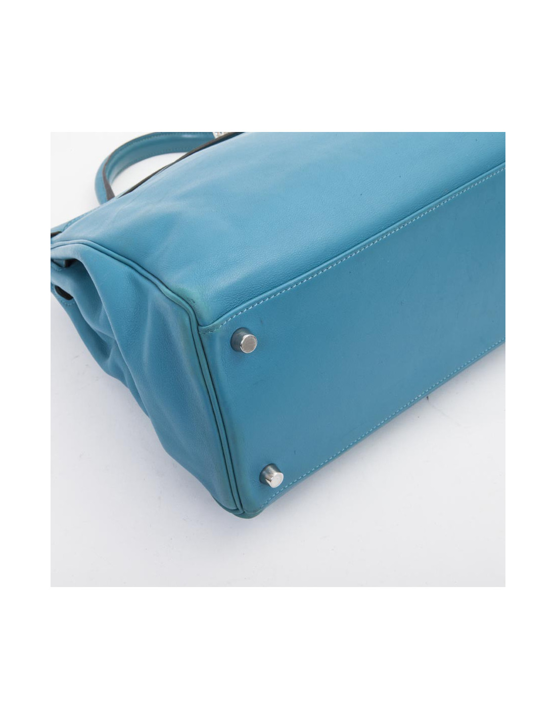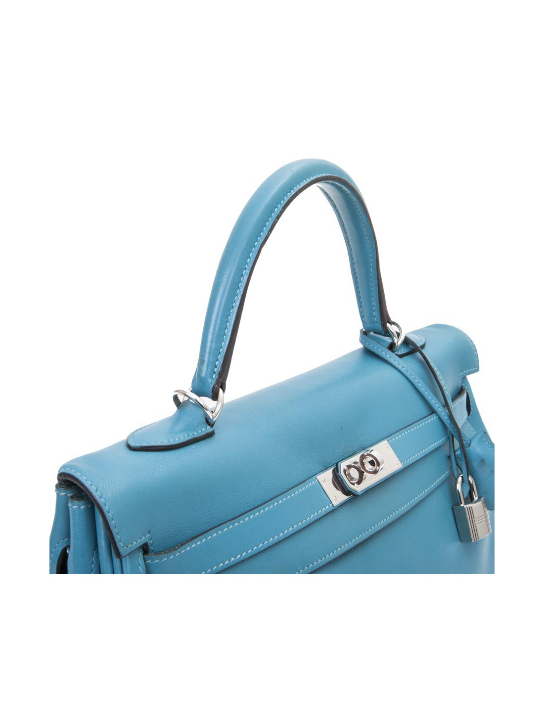 Sac HERMES Kelly II, TAILLE 35, en cuir de veau swift bleu izmir avec bandoulière, cadenas, clés, tirette et clochette. Se porte à la main ou à l'épaule avec la bandoulière amovible de 85 centimètres.