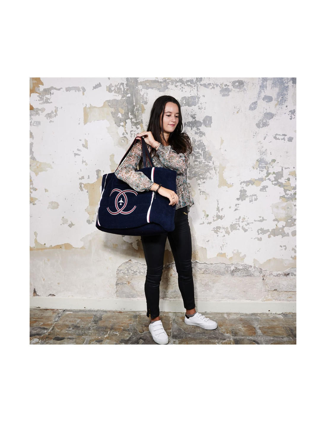 Sac CHANEL Airlines argent et sa serviette de plage bleue marine
