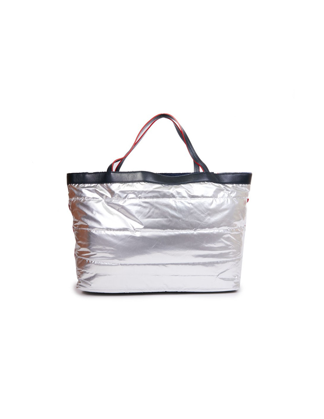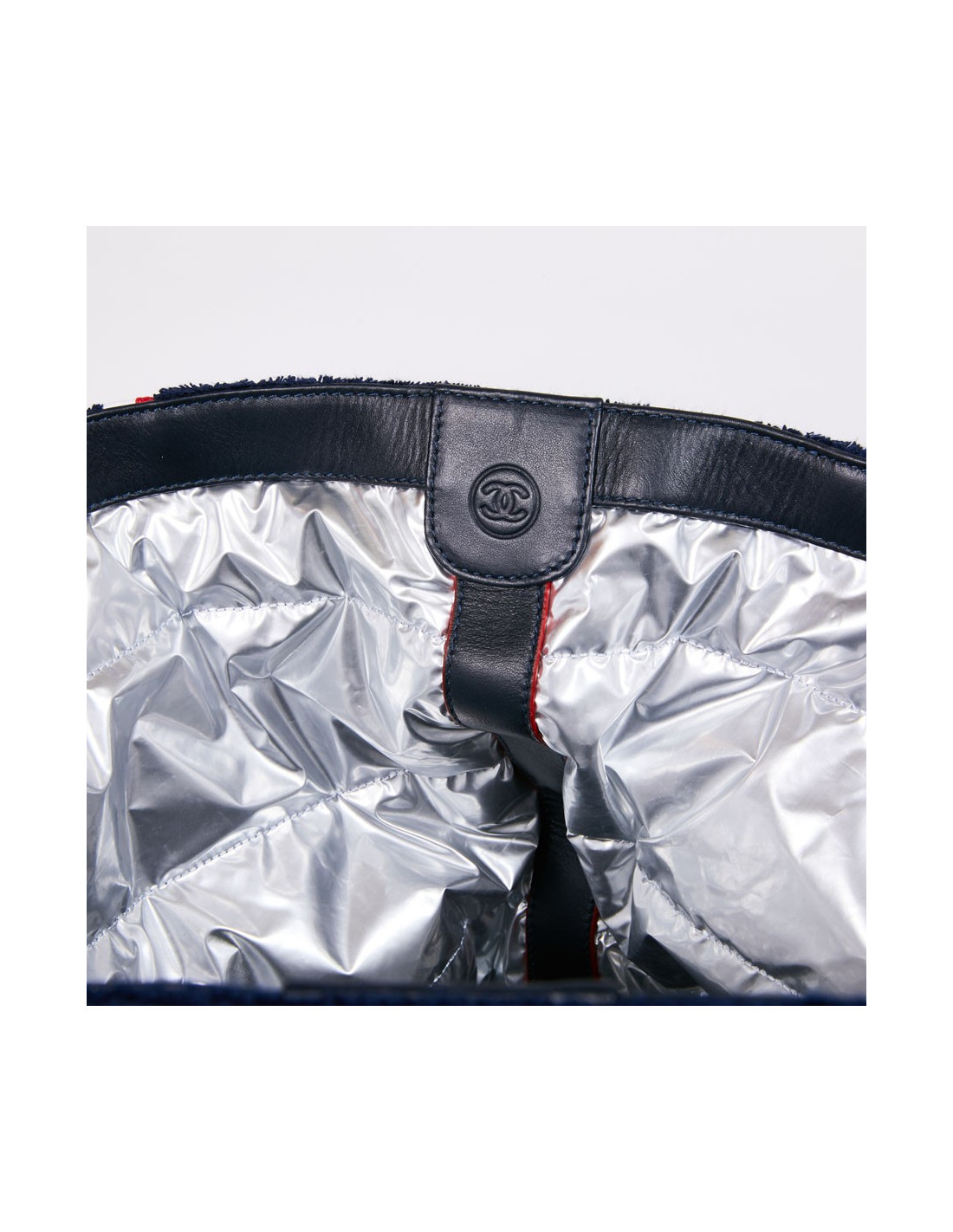 Ce sac de plage d'occasion CHANEL issu de la Collection "Airlines" est de couleur argent et sa serviette de plage bleue marine. Les bordures sont en cuir de veau bleu marine. La doublure intérieure en tissu éponge bleu marine. On y trouve à l'intérieur une pochette zippée amovible ainsi qu'une grande serviette de plage 100% coton bleu marine jamais utilisée.