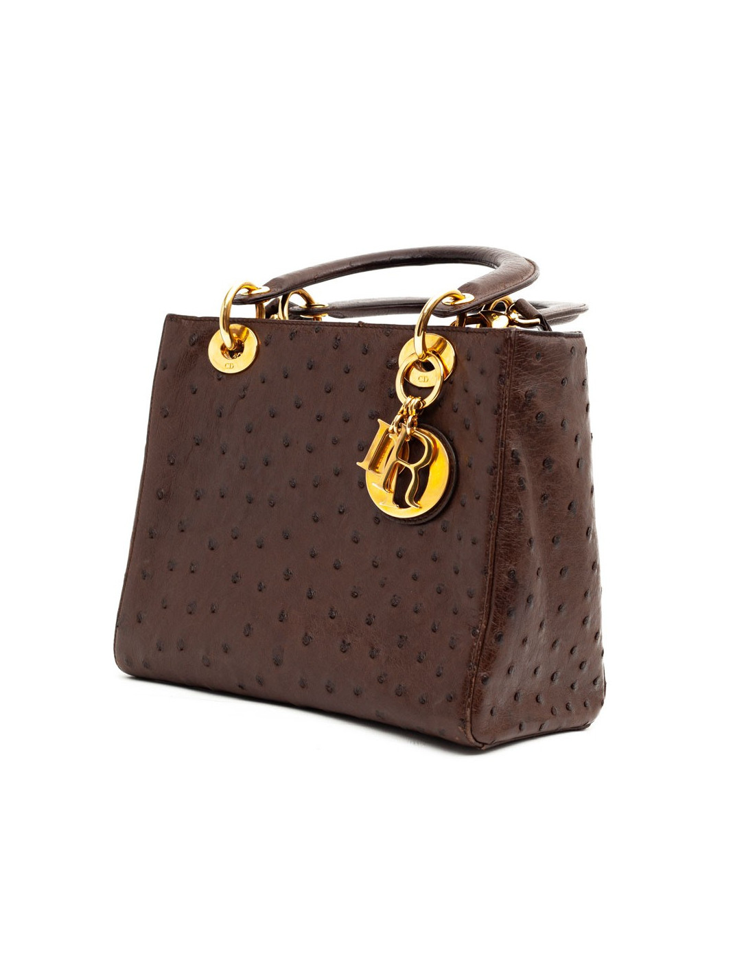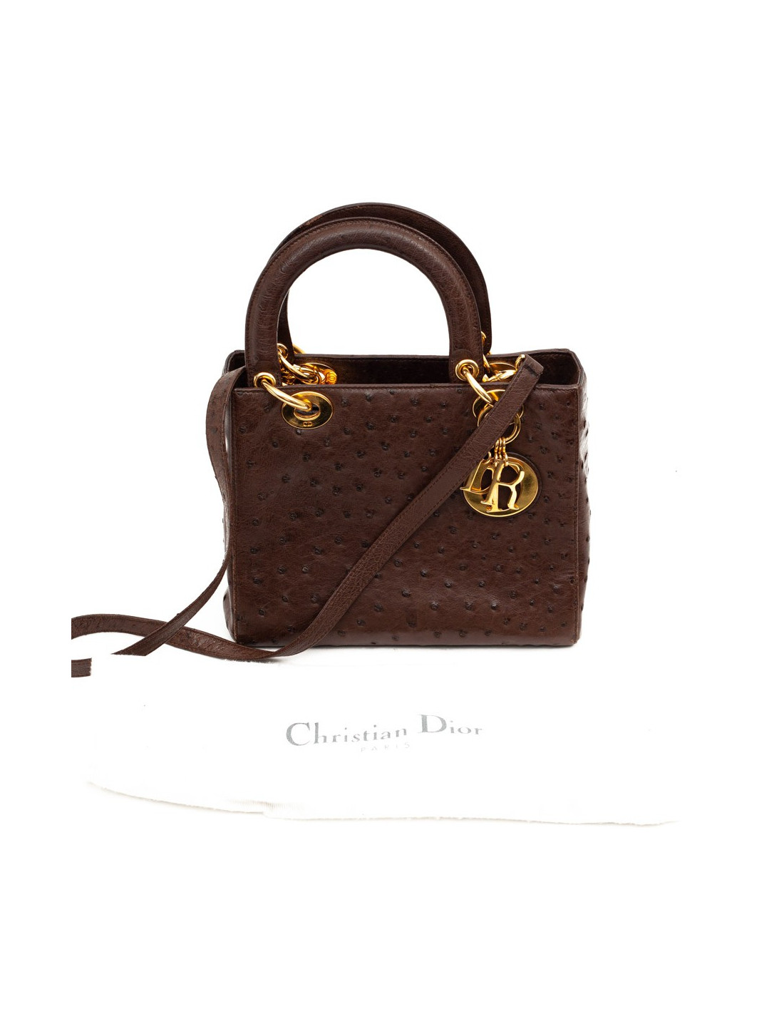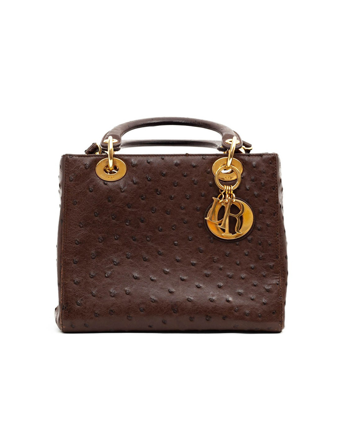Sac à main vintage de la Maison Christian Dior, modèle Lady Dior en autruche marron cacao. Ce sac fut offert par la première dame de France, Mme Bernadette Chirac à la Princesse lady Diana, lors de sa visite à Paris en 1995. Adopté par la princesse de Galles ce sac fut décliné dans dans de versions.