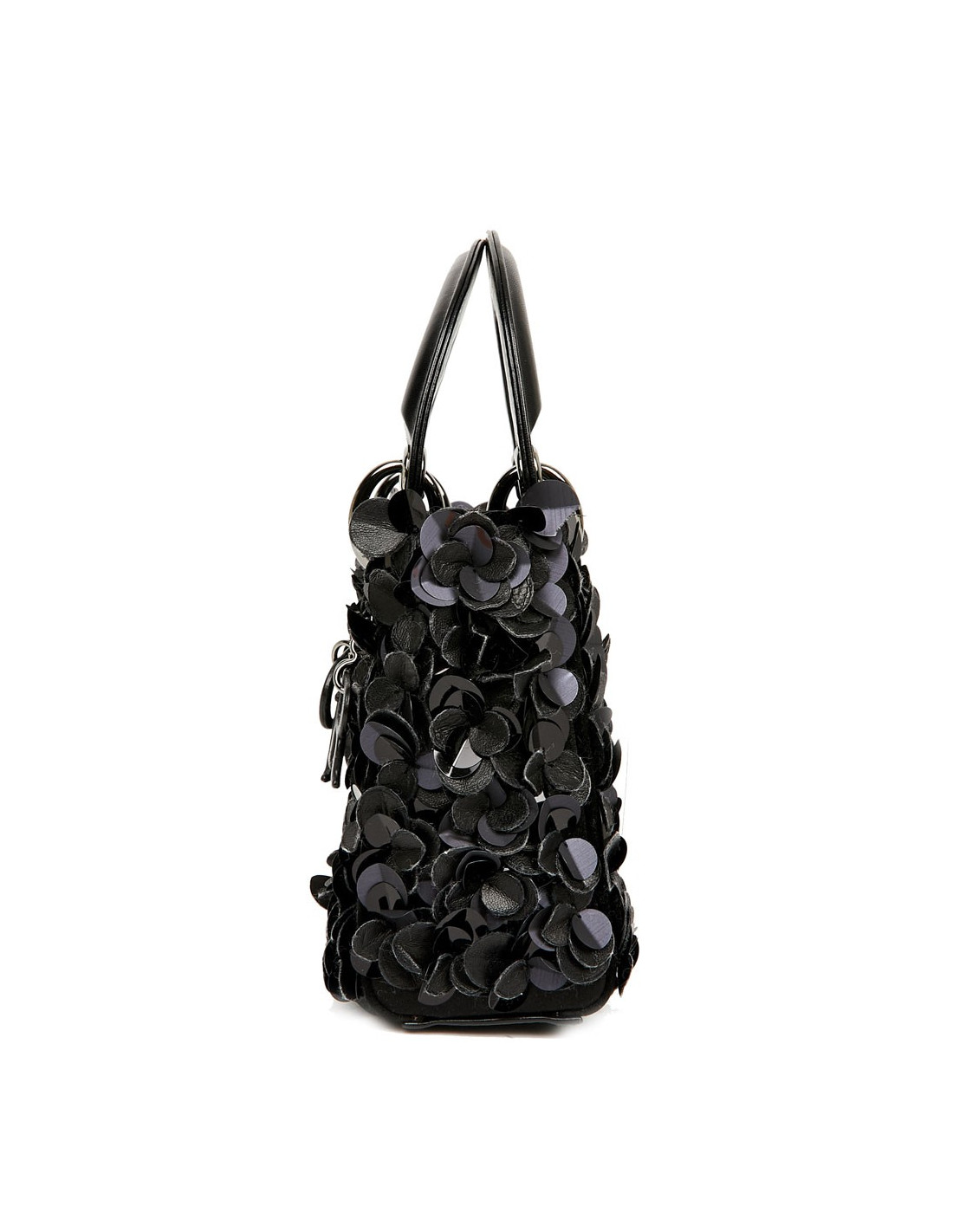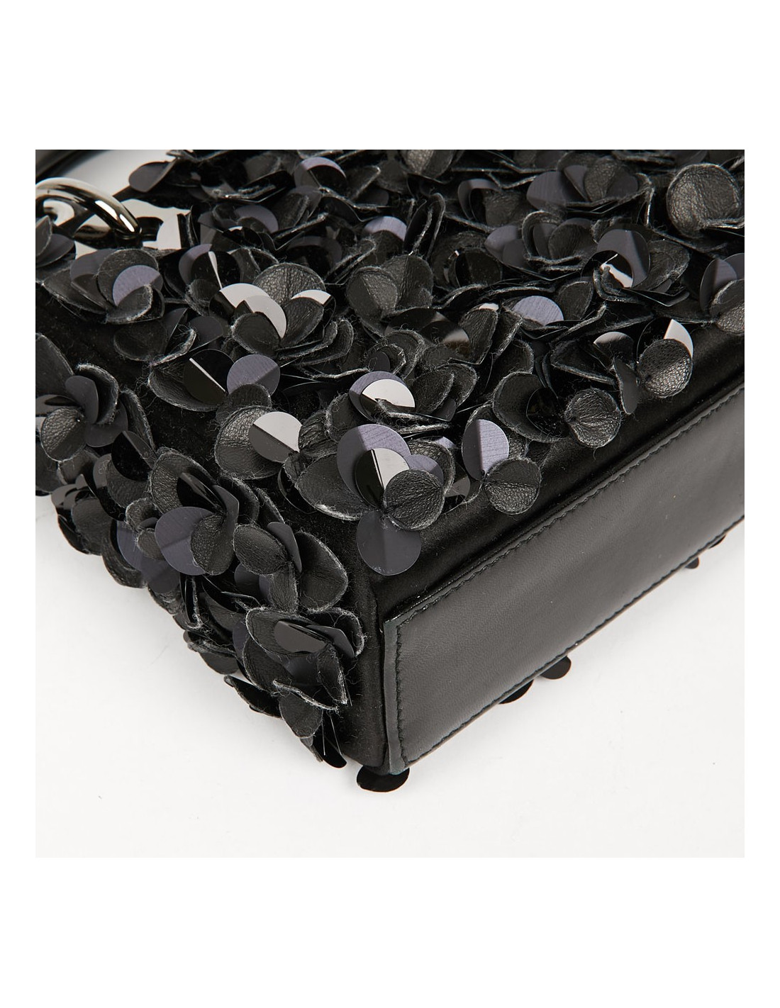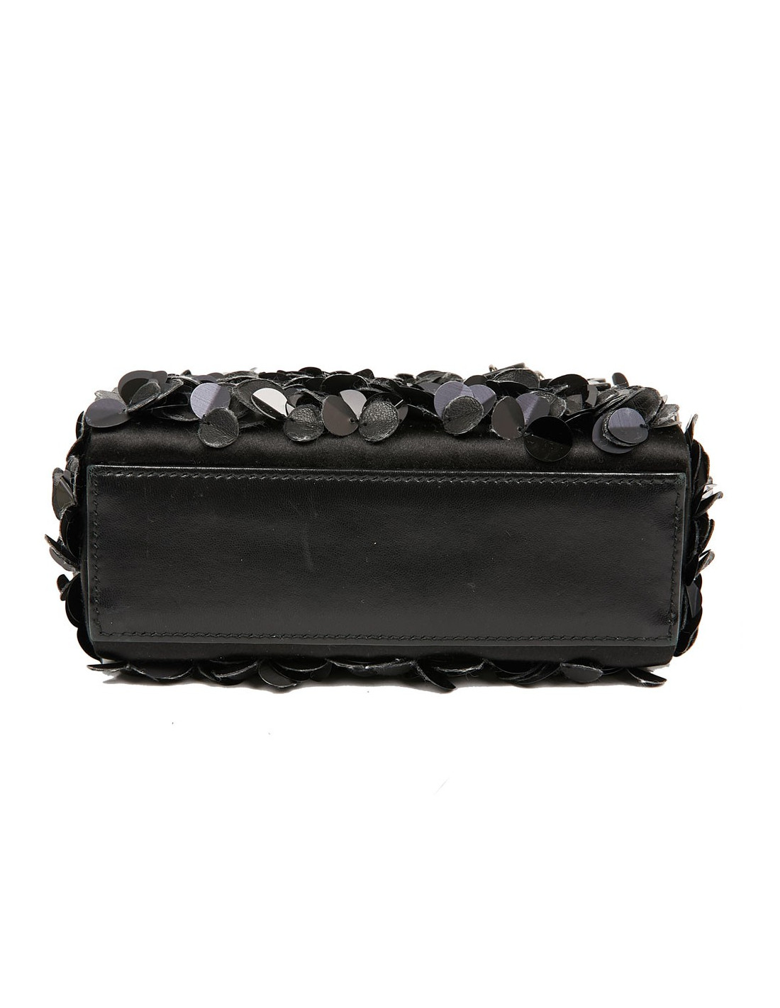 Serti de fleurs en cuir et sequins noirs, ce ravissant sac du soir se porte à la main avec une poignée en cuir d'agneau. L'accastillage est en métal argenté. L'intérieur est en satin noir avec une poche zippée.