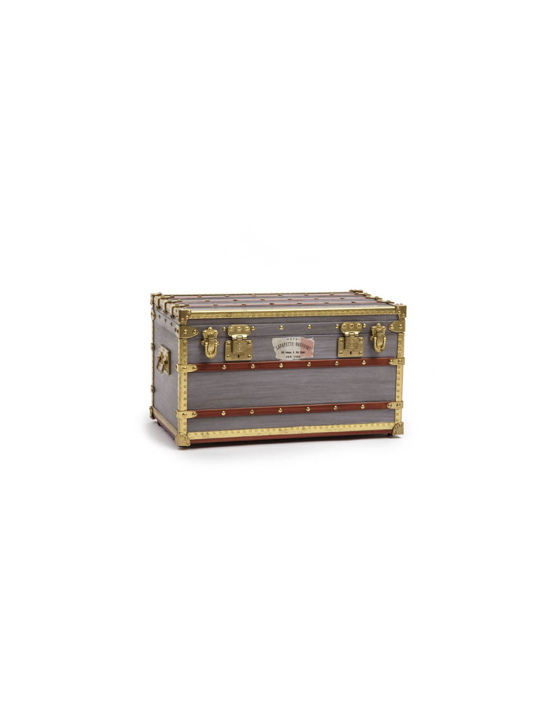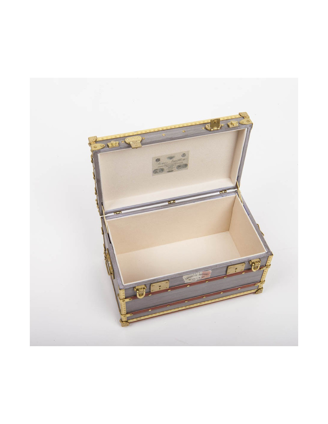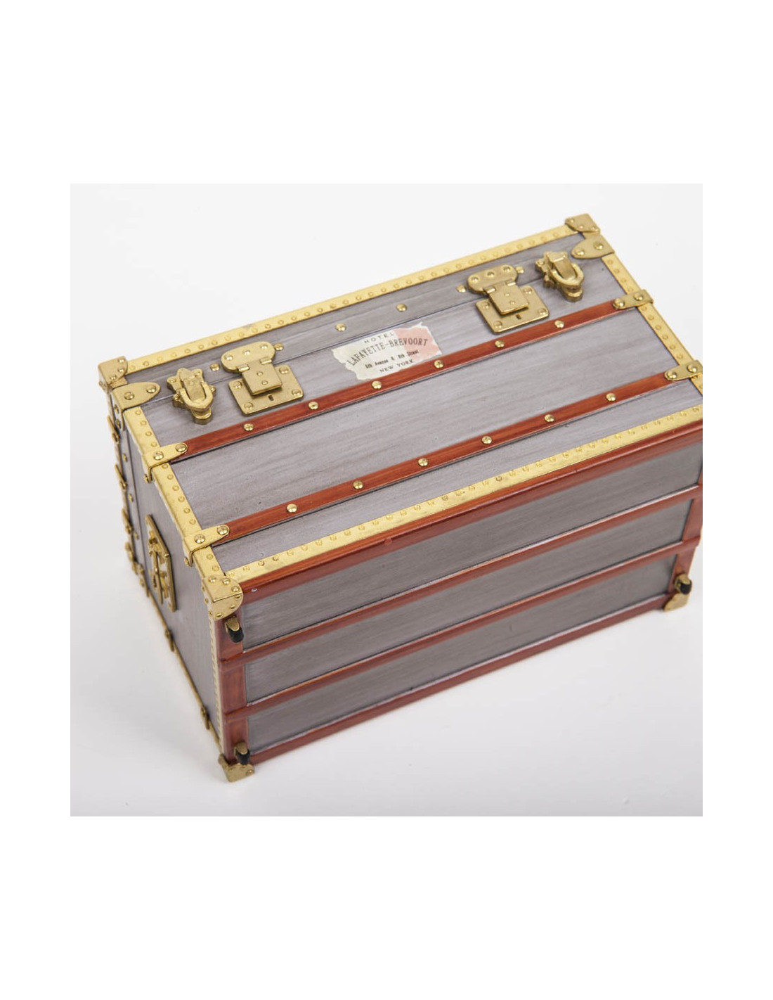 Rare. Coffret miniature. Mini malle en zing gris, bois et métal gold. Elle est hermétique. Cette malle est la reproduction parfaite d'un modèle de1899. Elle possède tous les détails identiques aux malles de taille normale.
