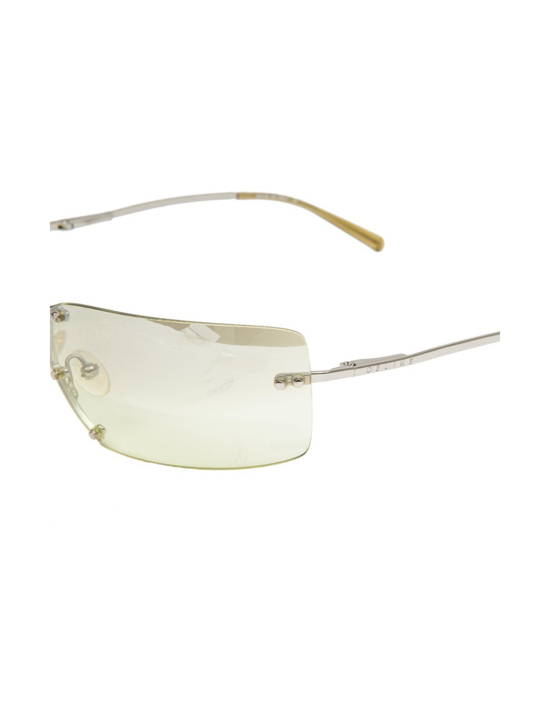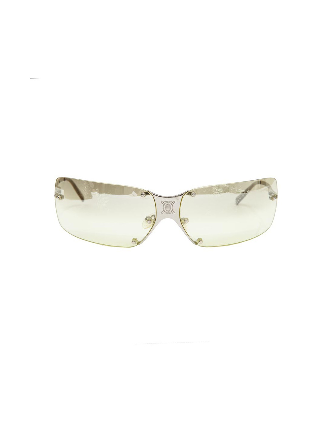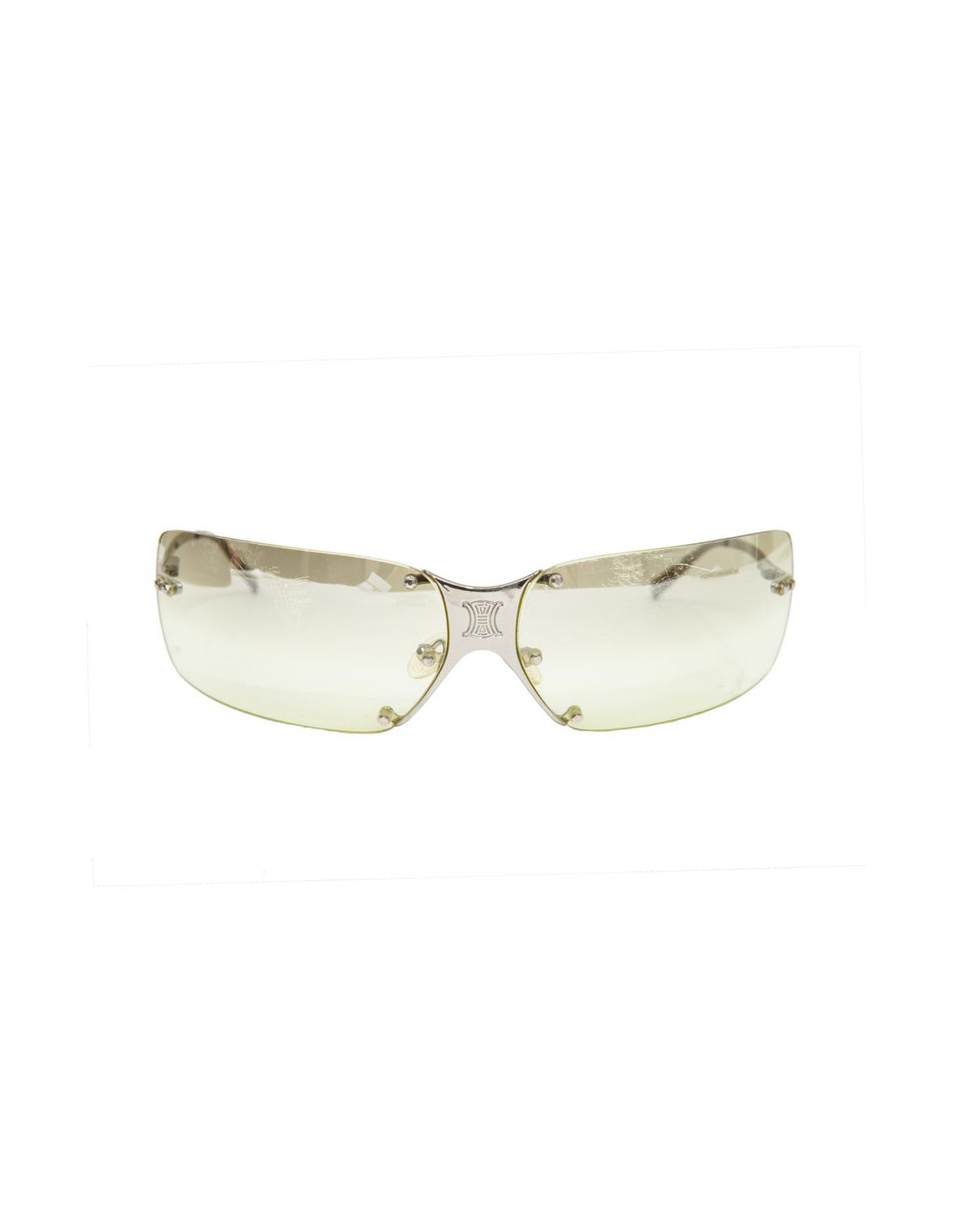 Lunettes de soleil CELINE. Monture en plexi, verres transparents couleur citron pâle dégradé, monture et branches en métal argen palladié.