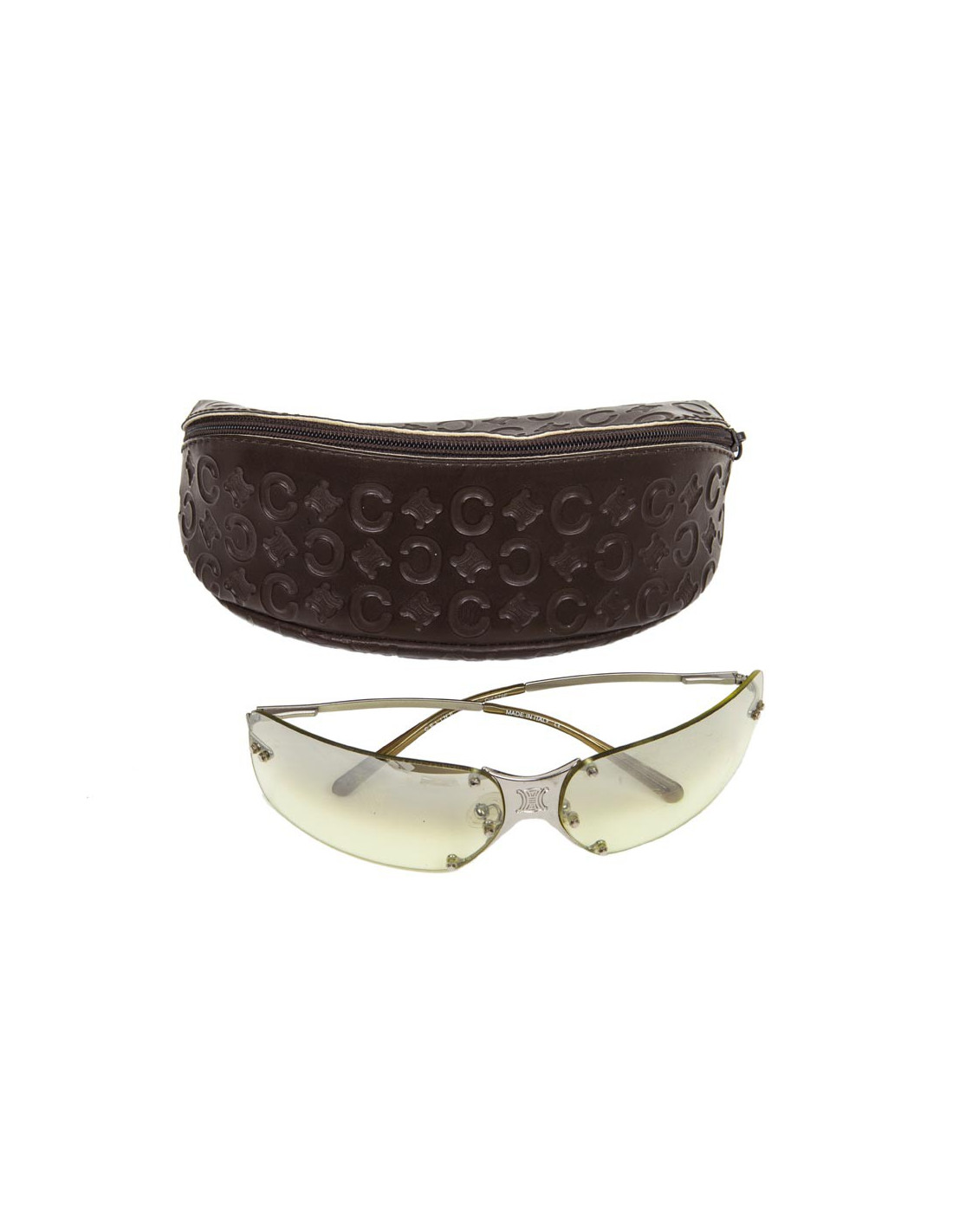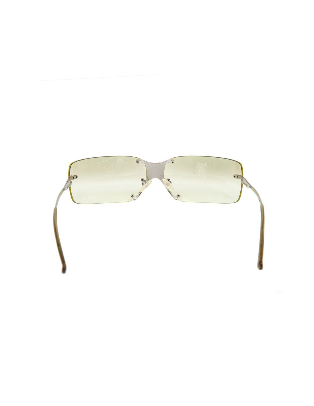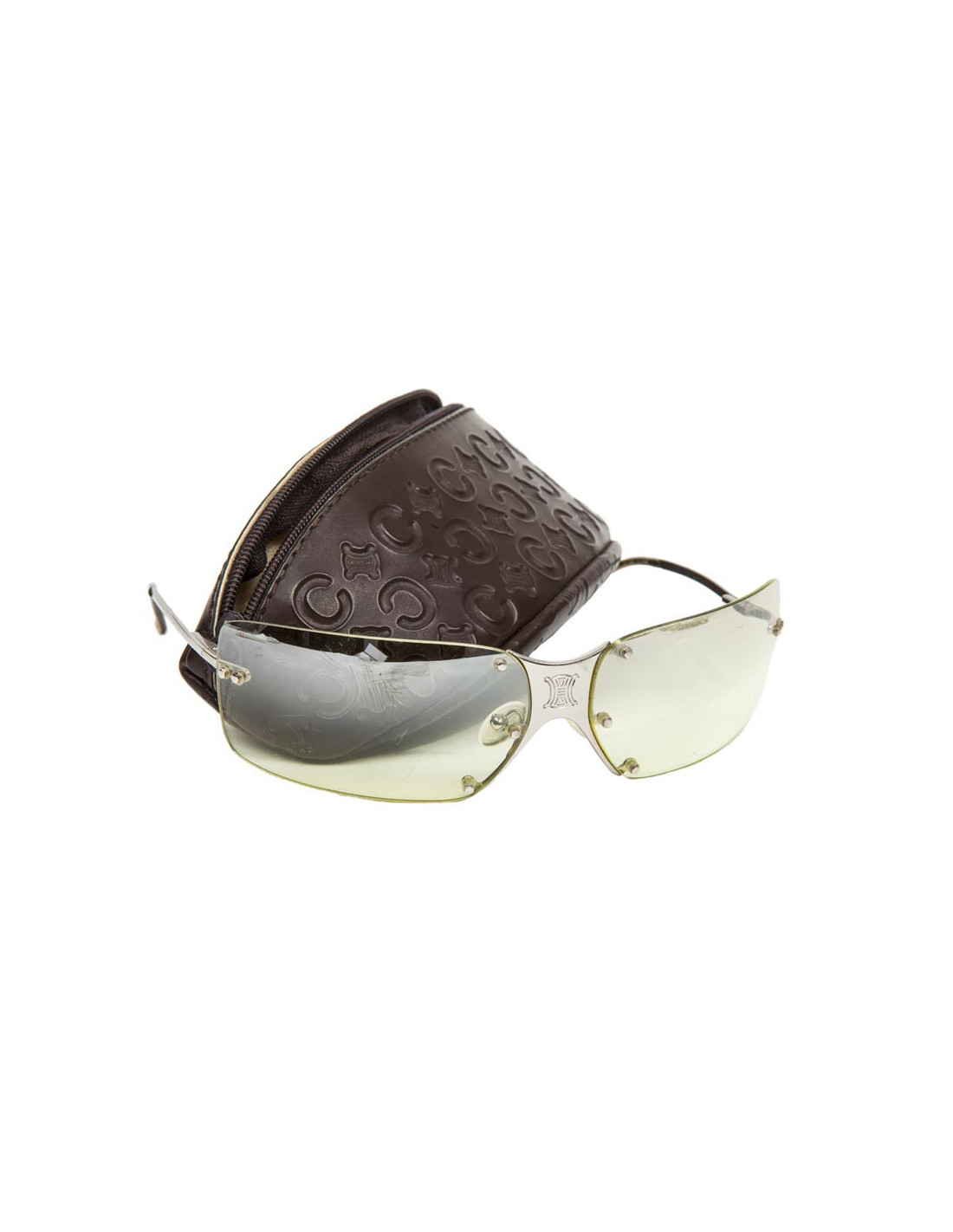 Lunettes de soleil CELINE. Monture en plexi, verres transparents couleur citron pâle dégradé, monture et branches en métal argen palladié.